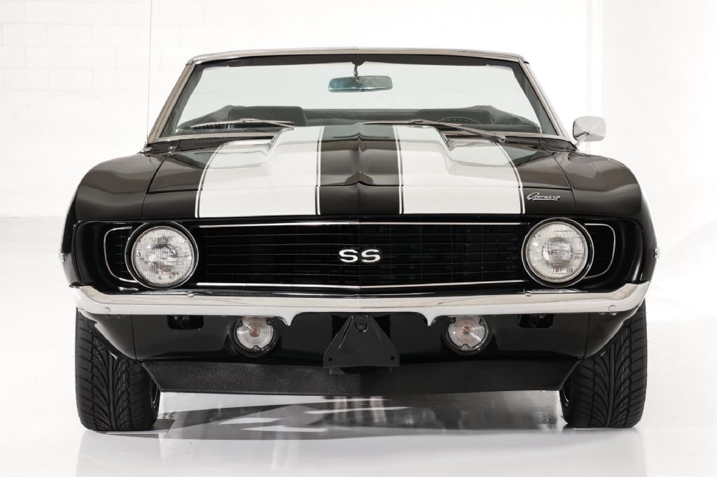Stunning Jet Black 1969 Chevrolet Camaro convertible with white stripes over the hood, that is powered by a performance built 350 c.i. engine with aluminum heads and a Muncie 4 speed manual transmission, nicely optioned with power steering and a new power front disc brakes for great stopping power. This American Dream Machine has aggressive good looks with front and rear spoilers, blacked out grill, cowl hood, SS emblems, new stainless rocker trim, new chrome wheel lip moldings and new quarter gills. The interior is amazing and is filled with new parts starting with newer houndstooth upholstery on the factory bucket seats, new door panels, new carpet, new center console, new GM seat belts, new Cushion Grip steering wheel, woodgrain trim, new visors, new kick panels, new chrome sill plates and also has rare tilt steering wheel. Tunes are handled by an amplified JL Audio bluetooth head unit that is hidden in the ash tray and Focal 10 inch subwoofers built into in the trunk for a great sound. The chrome Hurst shifter has been fitted with a new boot for clean looks. Rolling on Foose chrome wheels with performance tires for drop dead good looks.