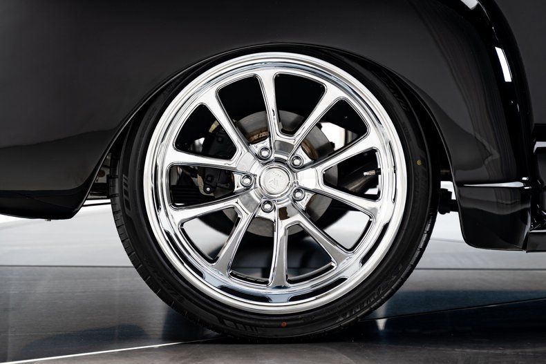 The classic body lines remain clean and purposeful, with traditional factory-style trim and no over-the-top exterior modifications. The black paint has a mirror-like depth that emphasizes the 5-window cab's iconic silhouette. Subtle custom touches include the removal of the factory taillights in favor of integrated LED units hidden in the bed rail ends, delivering a streamlined appearance. Up front, an aftermarket antenna adds functionality, while rear view mirrors mounted on both sides give the driver some added visibility. A lowered stance sits perfectly over chrome 20-inch Resto Laguna wheels that add contemporary presence. One thing that stands out on this truck is its unique bed treatment. Instead of typical varnished oak or stained pine, the bed floor features grey-painted wood panels trimmed in stainless steel for a sharp, unexpected contrast that draws attention without looking overdone or tacky.