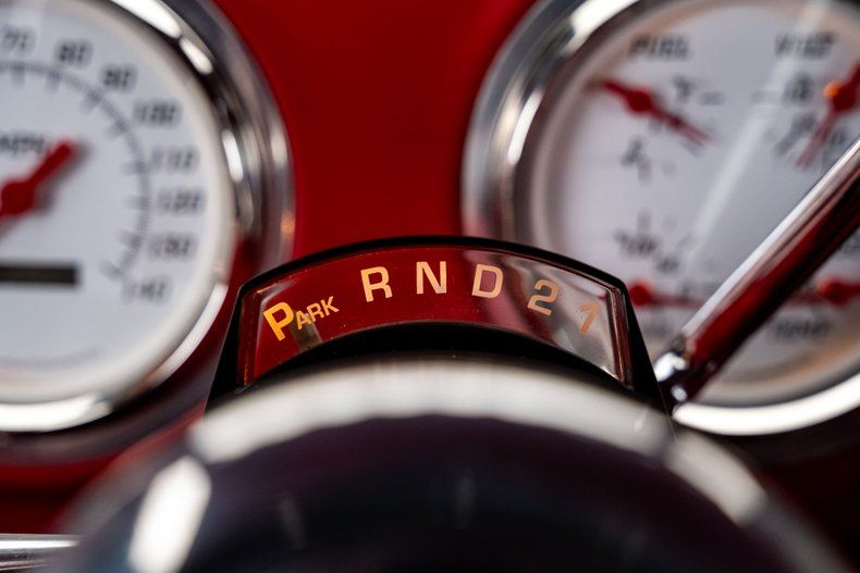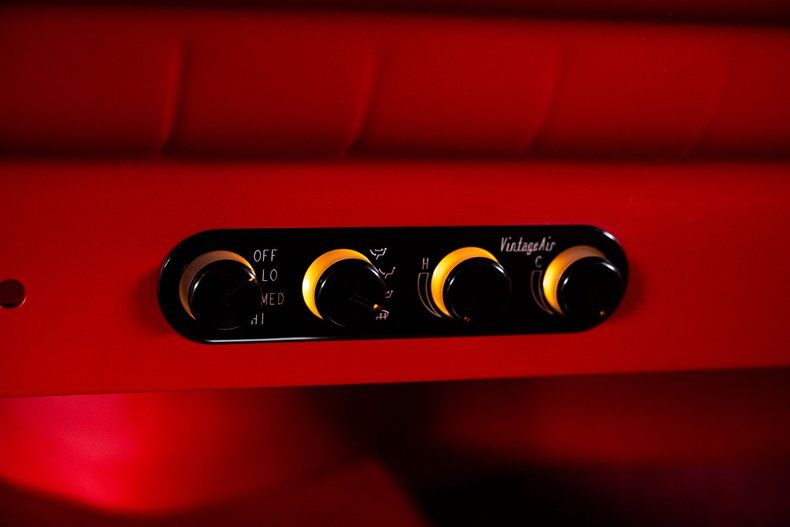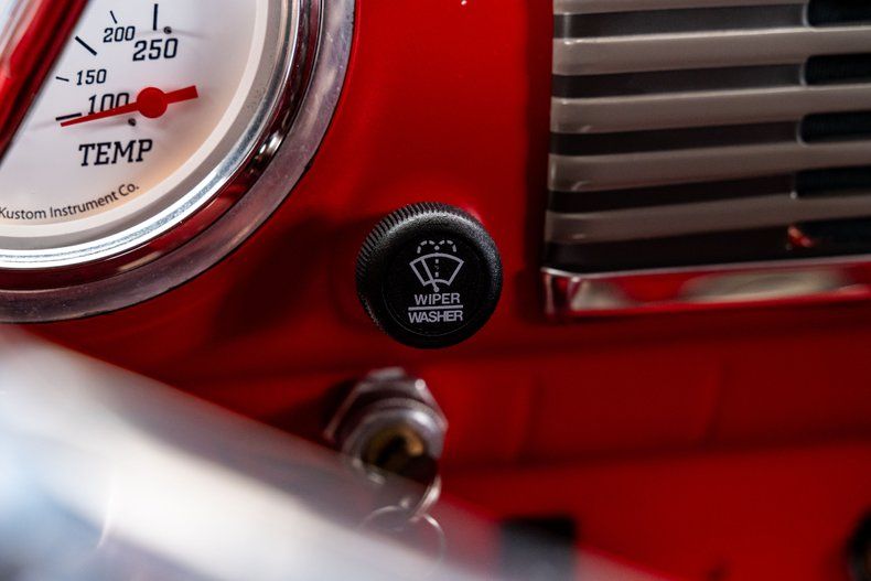 Inside, the custom red interior manages to feel both classic and upgraded. The dash retains its traditional layout but now houses white-face Omega Kustom gauges that deliver clear, stylish readouts. Climate control is handled by a modern Vintage Air system that's seamlessly integrated. An AM/FM/Aux Retrosound head unit offers contemporary audio capability. The bench seat and door panels are custom upholstered in matching red, while a custom-built console adds twin cupholders for added practicality. The tilting steering column is topped with a polished 3-spoke Billet Specialties wheel.