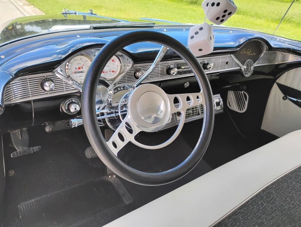 Beautiful Black and White 1956 Chevy Bel Air with 350 cubic inch V8 engine, automatic transmission, air conditioning, power steering, front disc brakes, tilt steering column, sport steering wheel, dolphin gauges, deluxe two-tone interior, two tone paint, tinted glass, Chevy hubcaps and trim rings.
