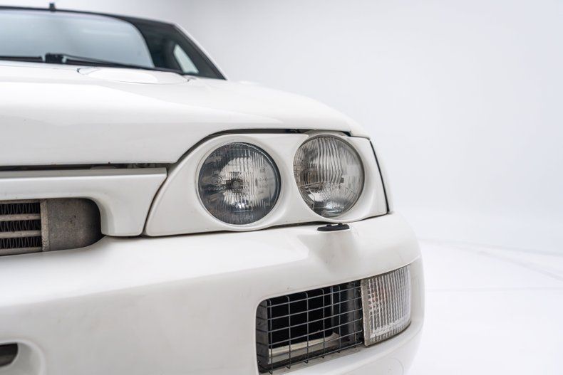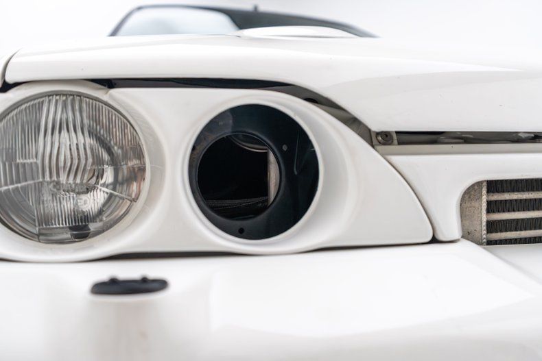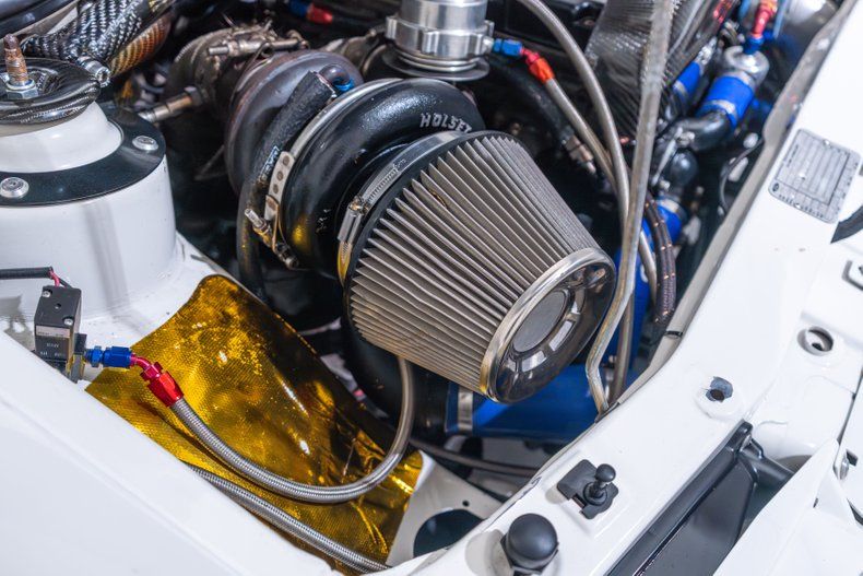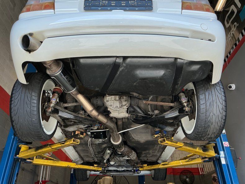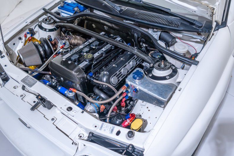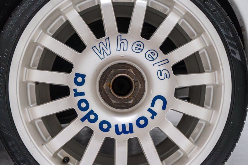 Exterior: This car is finished in white and features a vented hood, a sunroof, a raised rear wing, a decklid spoiler, flared fenders, clear taillight lenses, and pop-out quarter windows. A lip spoiler and "hockey sticks" have been added, while the inner left headlight and the fog lamps have been removed for additional cooling. Center-lock 19 Cromodora wheels are finished in white and mounted with 235/35 Flaken FK452 tires. GAZ coilovers are installed at each corner, and stopping power is provided by four-wheel disc brakes with Brembo calipers up front.