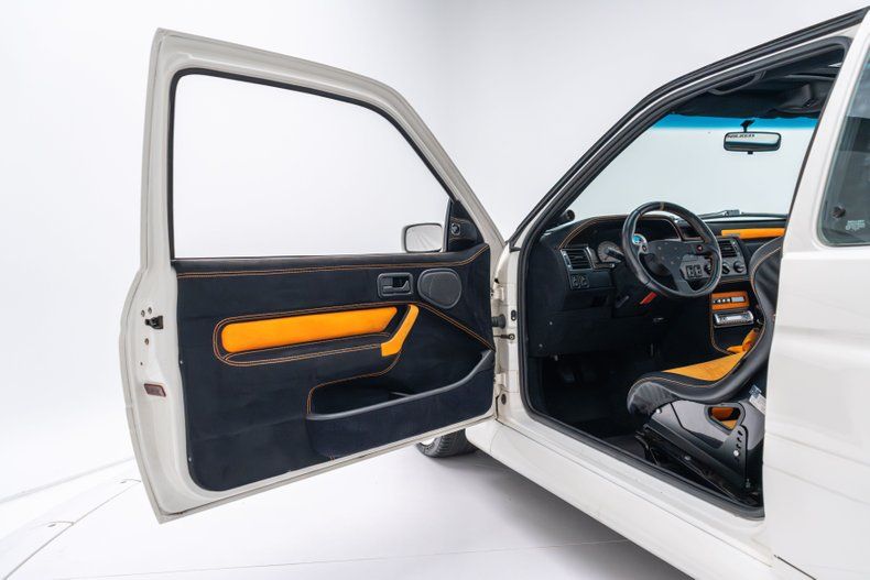 Interior: The cabin has been outfitted with a pair of OMP fixed-back fiberglass seats trimmed in black vinyl with orange centers and stitching, the latter of which extends to the Alcantara-trimmed dashboard, center console, and door panels. The Sparco steering wheel features an orange centering stripe and frames a carbon-fiber instrument surround housing a 270-km/h speedometer, a tachometer with a 6,500-rpm redline, and gauges for fuel level and coolant temperature, while supplementary readouts are mounted atop the center stack.
