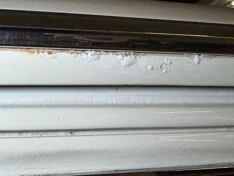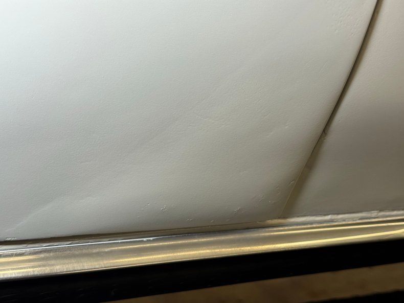 The Goat still clings to the single stage Cameo Ivory exterior and while not perfect, it still looks good from 20 feet. Stacked quad headlights flank the split grille which house the marker lights and our driver's side light is slightly askew, almost like a wink. The arrowhead is in line with the hood scoop and from the front, the asymmetric profile is due to the single side mirror, as was typical for the time. The tail lights are extra special, a series of nine slits on each side that form a single unit with plenty of white space in between at the end of a long decklid. Our wheels here are Pontiac Rally II's and they carry 70 series tires with a mid 2024 date code. Imperfections begin on the door corner where some uneven filler is found, there's bubbling in spots especially at the rocker panel, cracking paint, and general patina.