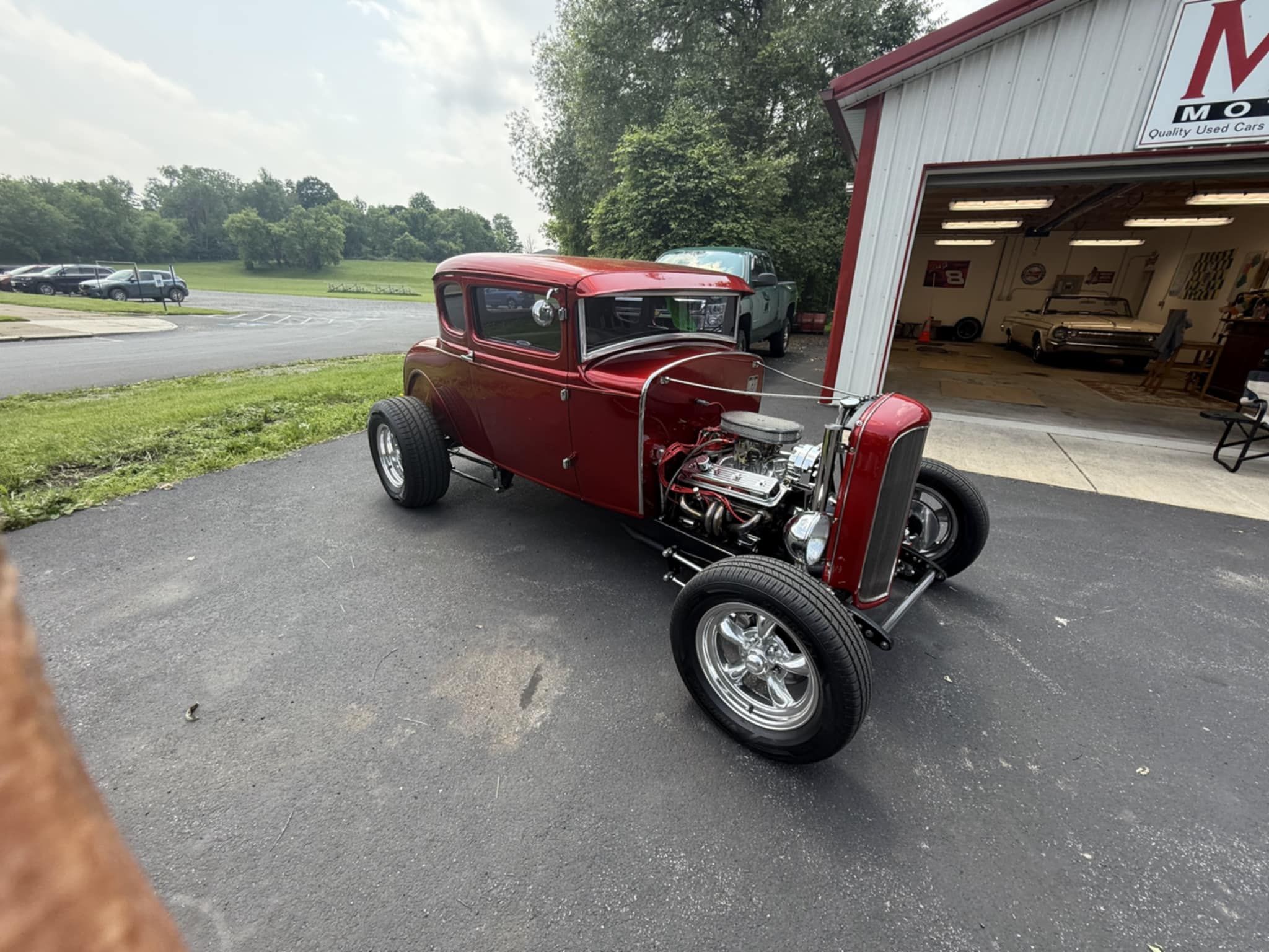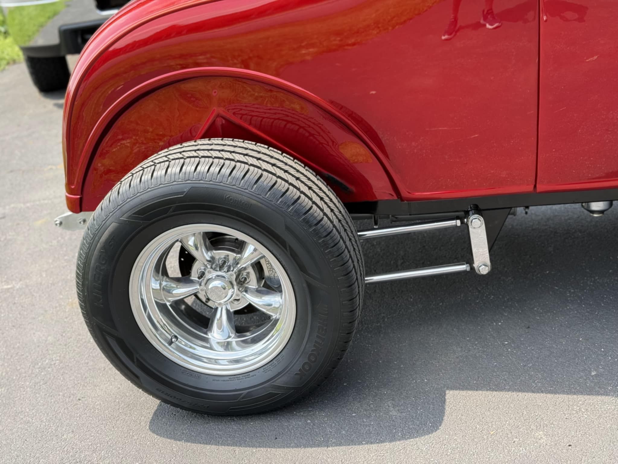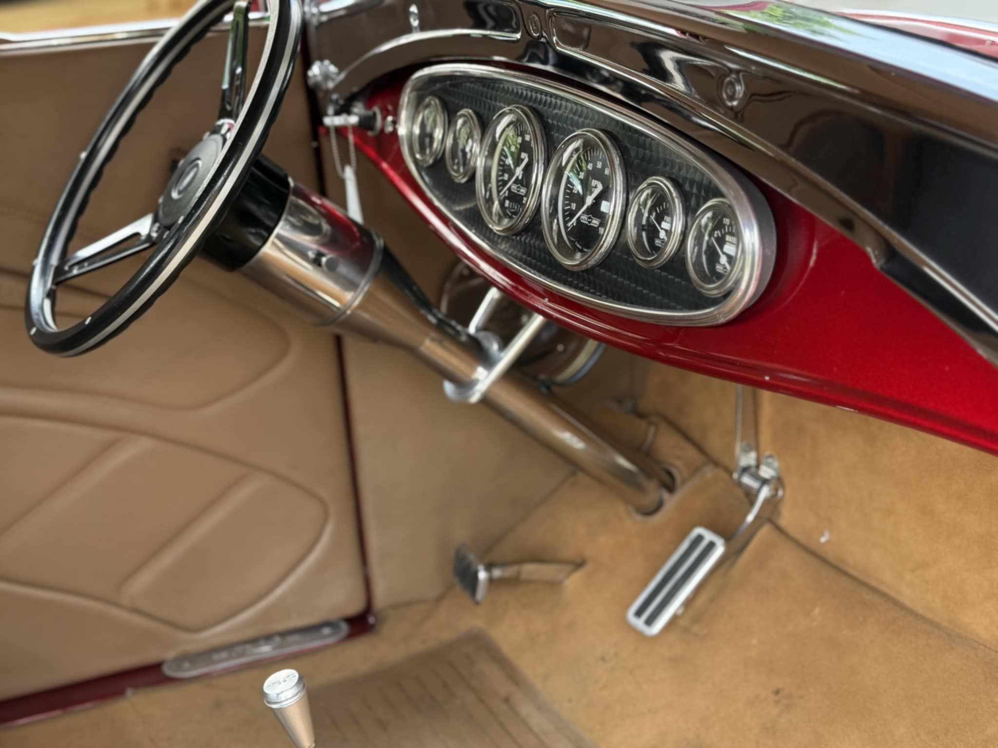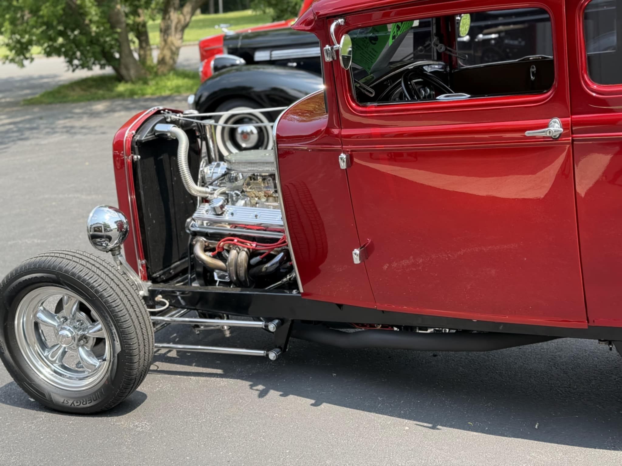 Steel body street rod. 350 four bolt main, Edelbrock 600 CFM carb, with headers and a 350 automatic. 4-wheel Wildwood Disc Brakes, TCI Frame, drop front axle with Traverse leaf springs, 9" Ford four link rear end. Lokar shifter and pedals, Flaming River tilt steering with turn signals, power windows, 15" Torq Thrust wheels, MSD Ignition, aluminum radiator with 32 grill billet Pulleys, Pete & Jakes Gauges. House of Kolor Apple Red Kandy paint.