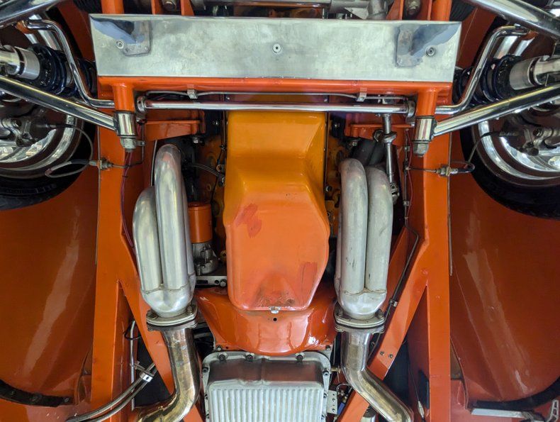 ENGINE COMPARTMENT: It's a thing of beauty under this hood! The power plant is a GM performance crate ZZ 502 motor that makes 502 horsepower! On top it has a polished Edelbrock Air Gap intake with dual Edelbrock 600 CFM carbs and a stunning March Pro Fulie air cleaner. It gets its spark from an MSD ignition and exhales through a set of Jet Hot coated Dynamax headers. The front of the motor has a polished a/c compressor, alternator and billet pulleys. It runs cool with an aluminum radiator and overflow bottle, a sidewinder electric, a Stage 2 water pump and an auxiliary electric water pump that can be switched on if stuck in traffic on a hot day. The motor is painted to match and the valve covers are painted with the same graphic scheme. The engine bay is smooth and painted like the body too.