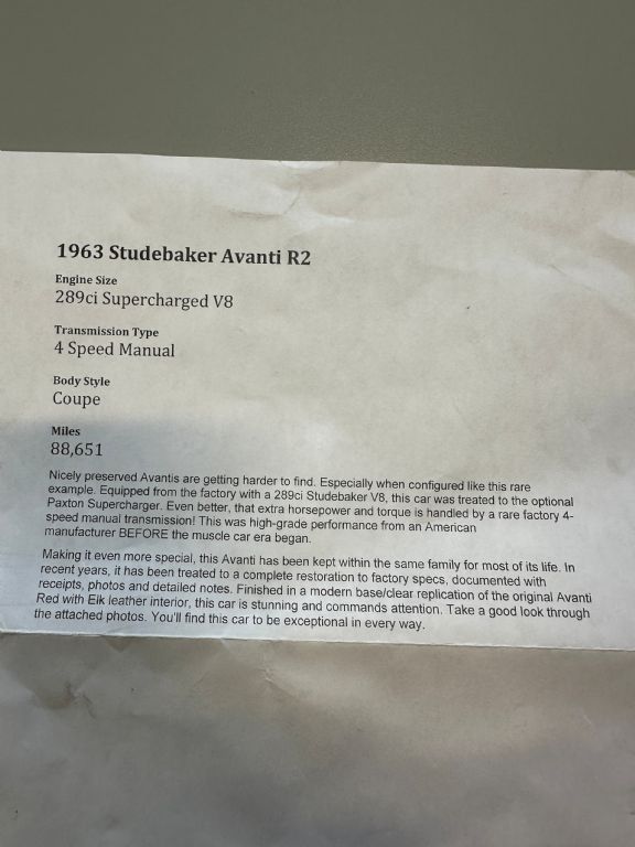1963 STUDEBAKER AVANTI R2 289CI/290H.P. SUPERCHARGED V8 VERY RARE 4/SPEED (APPRO 500 MADE) ONE OWNER FAMILY OWNERSHIP YEAR: 1963 MAKE: STUDEBAKER MODEL: AVANTI R2 BODY: COUPE COLOR: AVANTI RED TRIM: ELK LEATHER ENGINE: 289/290HP V8 TRANS: 4/SPEED REAR: STD MILES: 88,670 (EXEMPT) SERIAL#: 63R-1791 .FACTORY OPTIONS *R2. 289CI/290HP PAXTON SUPERCHARGED V8 *4/SPEED MANUAL TRANS *ELK LEATHER INTERIOR *BUCKET SEATS *FLOOR CONSOLE *W/W TIRES *RADIO RESTORATION THIS RARE AVANTI HAD A RECENT COMPLETE RESTORATION TO FACTORY SPECS. PHOTOS OF RESTORATION COME WITH CAR. NEW ORIGINAL COLOR MODERN PAINT WITH CLEARCOAT,.STRAIGHT AS A ARROW.BRAND NEW RADIAL TIRES (ORIGINAL SEARS SPEAR TIRE) BRAND NEW POWER WINDOWS MOTORS. RARITY / COMENTS TOTAL 1963 AVANTI PRODUCTION - 1883 TOTAL 1963 R2 4/SPEED PRODUCTION APPROX 500 ONLY 3 YEAR OF PRODUCTION 1962 TO 1964 HISTORY THIS RARE BEAUTIFUL R2 AVANTI IS A ONE OWNER FAMILY OWNERSHIP WITH 88000 MILES. THESE CARS WERE CONSIDERED THE FASTEST PRODUCTION CAR IN 1963 AND BROKE RECORDS AT BONNEVILLE SALT FLATS. THESE RARE CARS ESPECIALLY WITH 4/SPEED ARE A COLLECTORS DREAM CAR. SOLID MATCHING NUMBER DRIVE LINE. AMAZING CONDITION