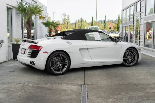 *2011 Audi R8 Spyder* * $160,150 MSRP With $23,350 in Factory Options * Ibis White Over Black Leather Interior * 6-Speed R-Tronic Gearbox, Bang and Olufsen Stereo, Carbon Sigma Interior*Factory Options* * Convenience Package * R-Tronic Paddle Shift Gearbox * Enhanced Leather Package * Audi Navigation System * 19-Inch Forged Wheels * Titanium Finish * LED Headlights * Carbon Sigma Exterior Mirrors * Carbon Sigma Interior Trim * Bang and Olufsen Audio * Perforated Leather Wrapped Steering Wheel * Lunar Silver Stitching*Additional Information* * Woodland Hills, CA, and Scottsdale, AZ Car From New*Standard Features* * 4.2L V8 Engine * 414 Horsepower/317 Lb-Ft of Torque * Stability Control * Traction Control * Self-leveling Xenon headlights * LED brake lamps * Auto climate control * Heated sport seats * Race-inspired flat-bottom sport steering wheel * Power rear spoiler * Rain sensing window wipers * Speed sensitive window wipers * Daytime running lights * Dusk sensing headlight * Turn signal in mirrors * Power heated mirrors * Sport-tuned suspension with adjustable damping * Performance brakes * Dry sump engine lubrication system * Electronic differential lockFor more information on this 2011 Audi R8 V8 Spyder or any of our 100+ high-performance cars always in stock, contact one of our friendly and knowledgeable sales consultants or always feel free to stop by our Bellevue, WA Park Place Ltd campus - where we have over 40,000 sq ft of indoor showrooms filled with the finest cars. As part of the Park Place Motor Group family, which includes Park Place Aston Martin and Lotus of Bellevue -- Nobody Has What We Have!
