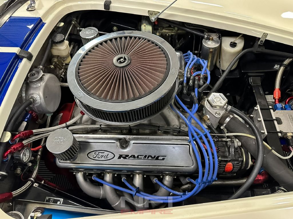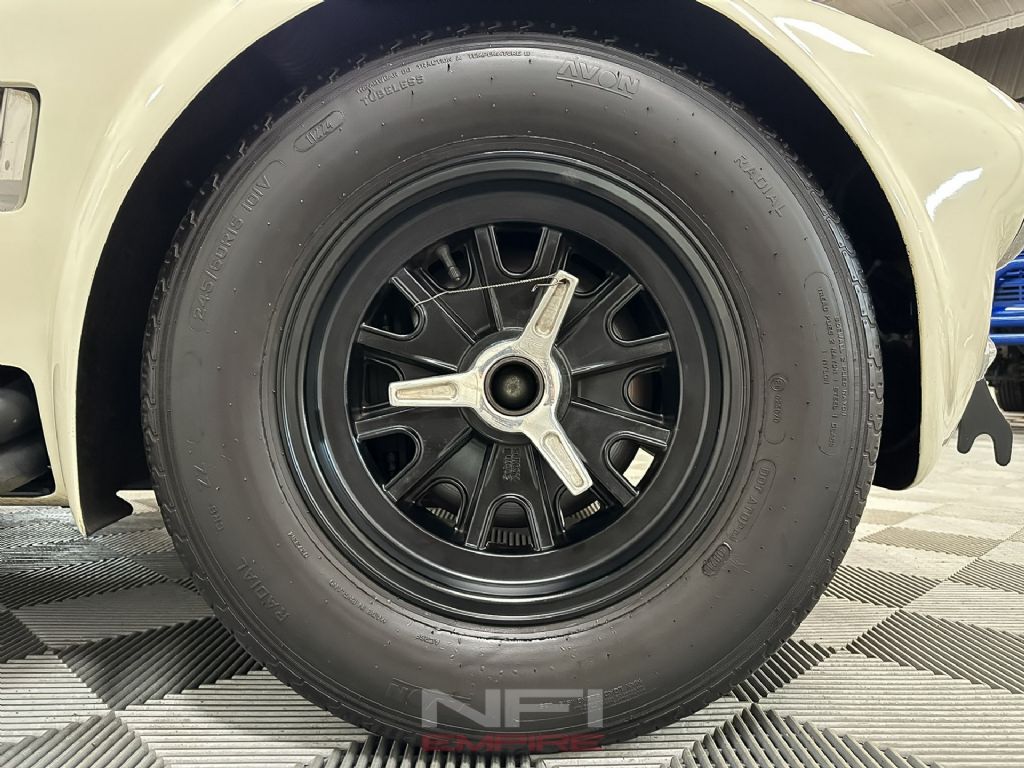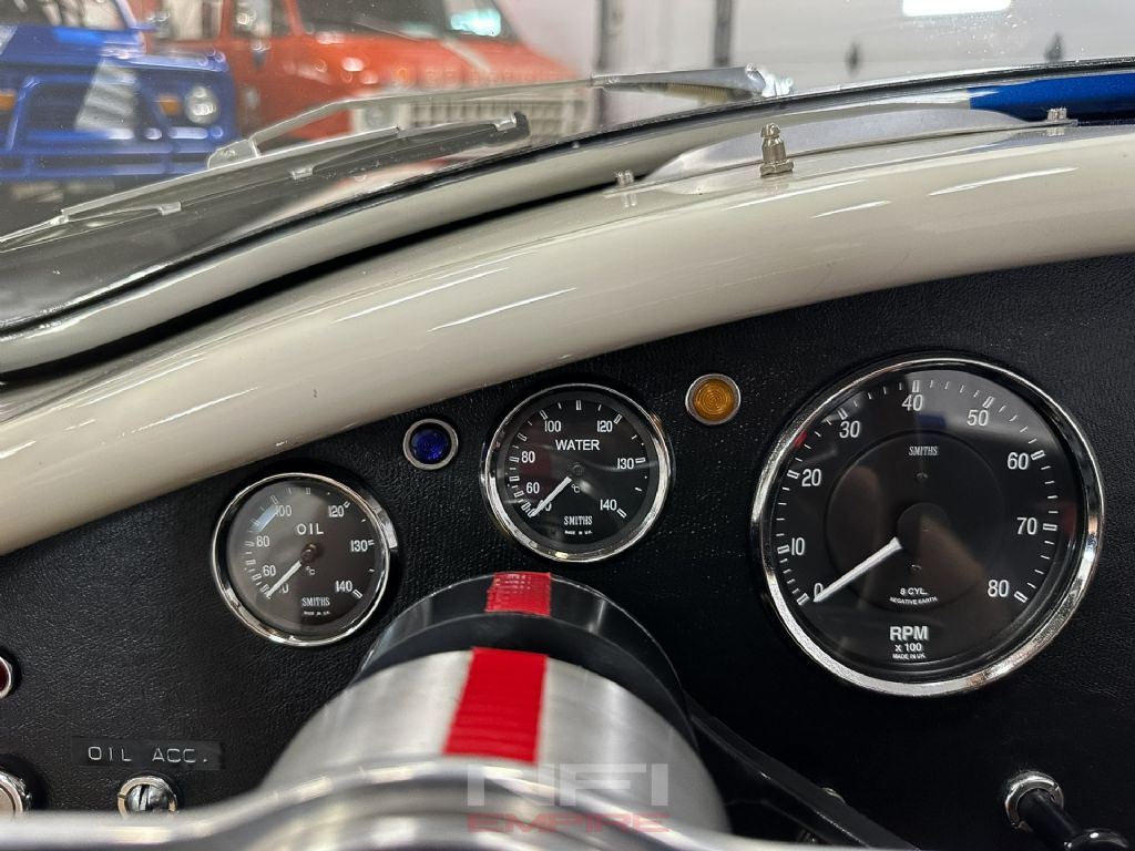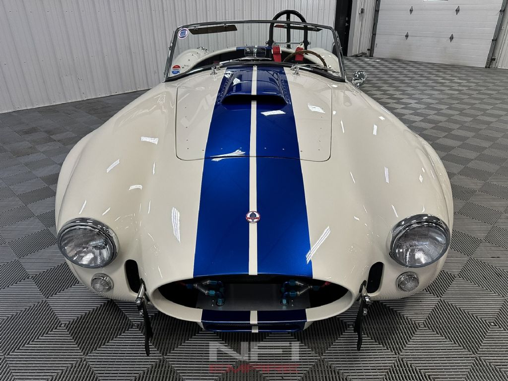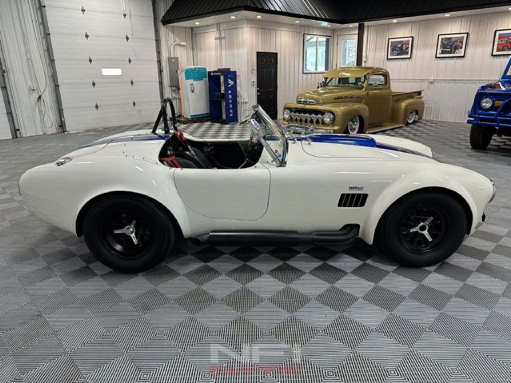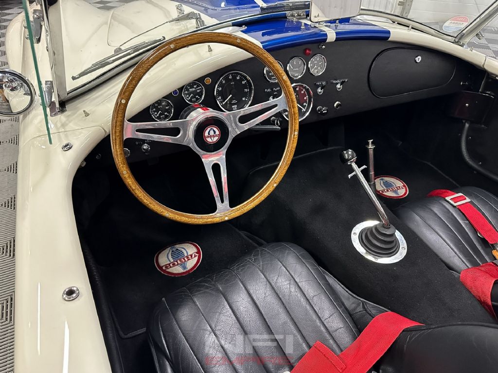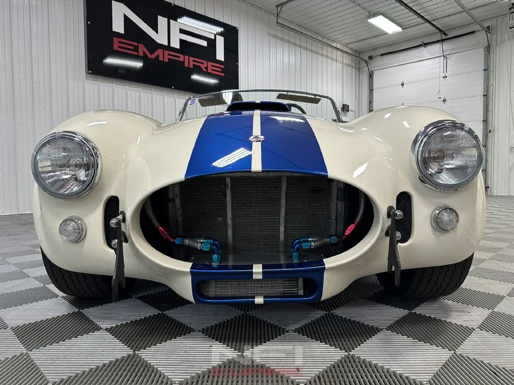 1965 Shelby Cobra MK III Superformance - the kind of car that stops people mid-stride and keeps them staring. Finished in classic white with bold blue stripes, it comes with a matching hard top for when the weather isn't as fearless as you are. Under the hood sits a 418 V8 with a dry sump oil system, fed by a Holley carb on an Edelbrock intake, breathing through a K&N air cleaner. An MSD Blaster 2 ignition keeps the spark strong, while long-tube headers feed the signature sidepipe exhaust - loud enough to make your neighbor's coffee tremble.