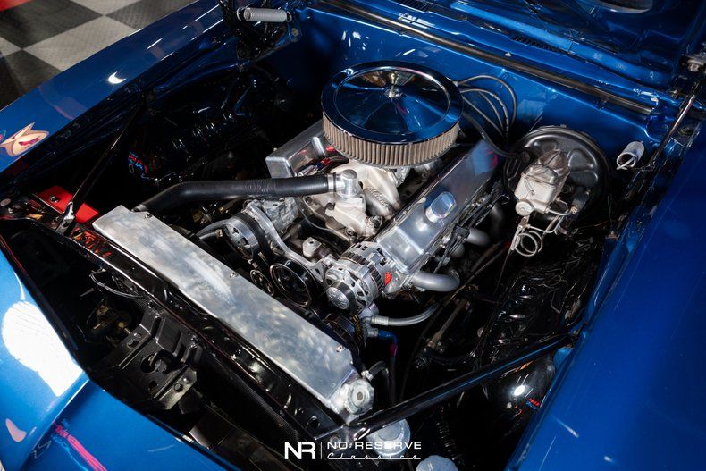 Under the Hood: 409 V8 Tremec 5 Speed Manual Transmission CVF Billet Serpentine Kit Cold Air Intake Paint Matched Fire Wall Ron Davis Radiator With Dual Electric Fans Power Master Chrome Alternator MSD Fuel Injection Holley Carburetor Edelbrock Fuel Lines Billet Engine Covers Performance Headers