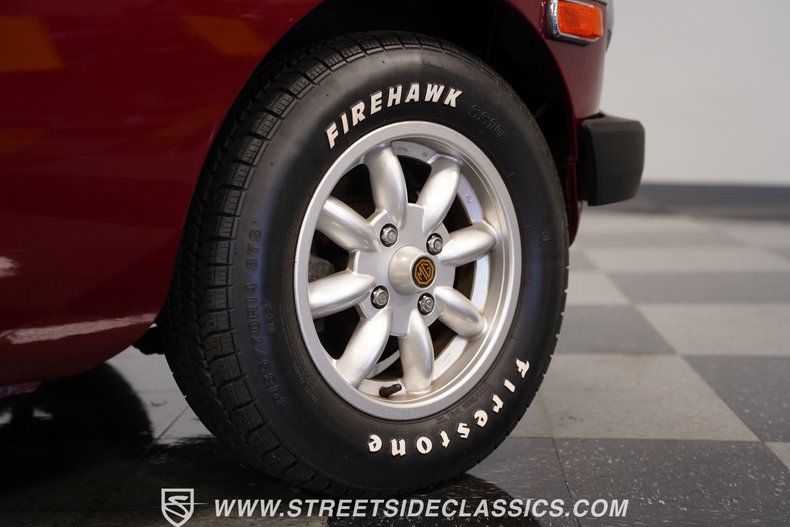 Painted red, this 1975 MG MGB displays the compact dimensions and low profile that made British roadsters famous. The body features clean lines and a tight black vinyl convertible top. A modified hood contains a cutout for the air cleaner, adding character to the front end. Chrome bumpers and trim pieces appear throughout the body, adding contrast to the red finish. The rear includes a metal luggage rack mounted to the boot lid. Completing the exterior look are 14" wheels shod with P185/70R14 tires, maintaining the traditional MG appearance that car buyers have appreciated for decades.
