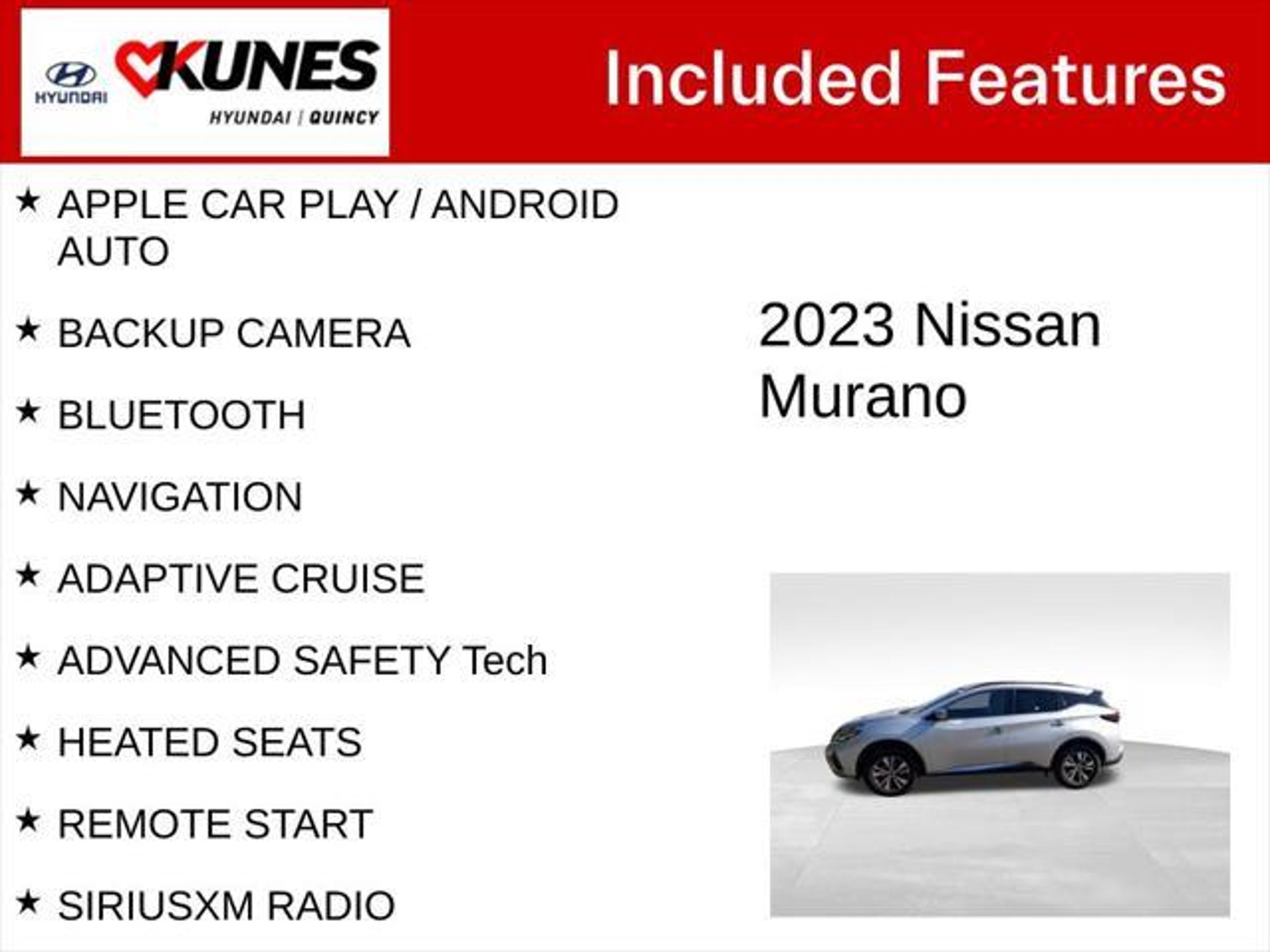 Details > 2023 Nissan Murano SV 4DR SUV For Sale in Quincy, IL Private Party Sellers Click here to place your ad now! You auta tell them you saw the ad in AutaBuy when you call or email. 1/30 2/30 3/30 4/30 5/30 6/30 7/30 8/30 9/30 10/30 11/30 12/30 13/30 14/30 15/30 16/30 17/30 18/30 19/30 20/30 21/30 22/30 23/30 24/30 25/30 26/30 27/30 28/30 29/30 30/30 View 30 Photos View All Add to My Garage Parked in Your Garage! Kunes Country Hyundai of Quincy Contact Seller: I would like to: Make Offer Check Availability Ask A Question Request More Photos Check Financing Options Send a copy of this message to me Add this listing to my garage Send to Mobile Mileage 69,312 Exterior Color Brilliant Silver Metallic Interior Color Graphite Doors 4 Engine 3.5L V6 Transmission 7 Speed Stock # 14P914 VIN 5N1AZ2BJ1PC131034 Estimated Monthly Payment $361 mo Apply Now J.J. Best Banc & Co. 2023 Nissan Murano SV 4DR SUV Description: Kunes Country Hyundai Of Quincy · Mileage: 69,312 · Color: Brilliant Silver Metallic Price: $20,770. Price: $20,765. Mileage 69,312 Exterior Color Brilliant Silver Metallic Interior Color Graphite Doors 4 Engine 3.5L V6 Transmission 7 Speed Stock # 14P914 VIN 5N1AZ2BJ1PC131034 Estimated Monthly Payment $361 mo Apply Now J.J. Best Banc & Co. Add to My Garage Parked in Your Garage! Message Seller Kunes Country Hyundai of Quincy Contact Seller: I would like to: Make Offer Check Availability Ask A Question Request More Photos Check Financing Options Send a copy of this message to me Add this listing to my garage Offered for sale by Kunes Country Hyundai of Quincy QUINCY, IL Price: $20,770. Price: $20,765. Offered for sale by Kunes Country Hyundai of Quincy QUINCY, IL [entire inventory] Ask Auta Intelligence What does this VIN number tell me? What engine options did these come with? How easy are parts to find for this model? What transmission options did these offer? When was this model first introduced? What colors did these come in? What factory options were available on this model? Can you show me more suvs for a similar price? What trim levels were available for this model? What safety features does this model offer? What kind of mileage do these get? How many of these were produced? How far is this from me? Tell me the history on this model Do you have a similar car to sell? List It Now! Questions about this car? Ask Auta Intelligence for production numbers, available options, etc. · Subscribe to AutaBuy! · Send a Gift Subscription Notice to a Friend