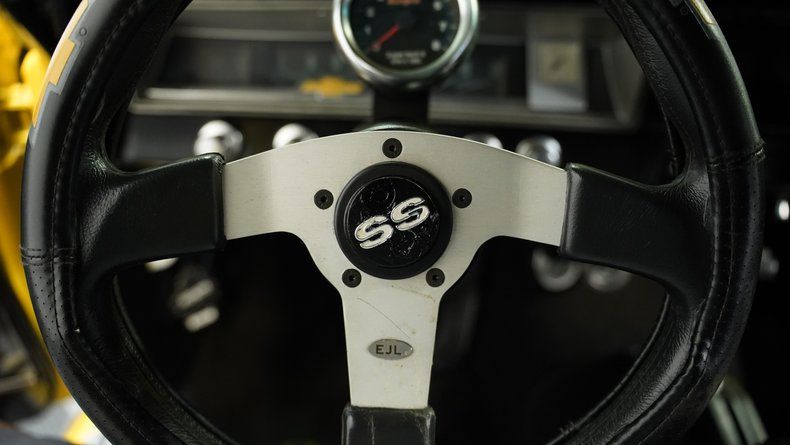 The interior also carries a somewhat stock/custom/street rod vibe. The front and rear bench seats are free from any rips or tears. The carpets look good and feature Super Sport floor mats. The headliner and door panels are in good shape. There is a custom floor shifter, a custom steering wheel, and a Sunpro tachometer mounted on the steering column. The dashboard is in good condition, and the gauge cluster appears to have original gauges, while two additional aftermarket gauges are mounted under the dash. For audio entertainment, a Pioneer radio is installed with AM/FM/AUX/CD capability, paired with aftermarket speakers in the door panels. The door jambs are clean, the OEM door sills appear to be in good condition, and the weatherstripping is in good shape.