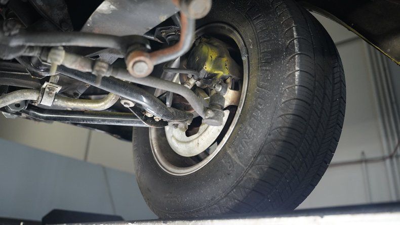 Underneath the hood is a 283 cubic-inch V8 topped with an Edelbrock 4-barrel carburetor. A TH350 3-speed automatic transmission connects to a 10-bolt rear axle. The front suspension handles its duties with newer upper and lower control arms, coil springs, shocks, and a sway bar, while the rear setup uses leaf springs and air shocks. Fifteen-inch five-star wheels sit at all four corners, wrapped in 215/70R15 front tires and 215/60R15 rear tires. Behind those wheels are front disc brakes and rear drum brakes. Long tube headers connect to dual exhaust pipes that run through aftermarket mufflers for a nice cruising sound.