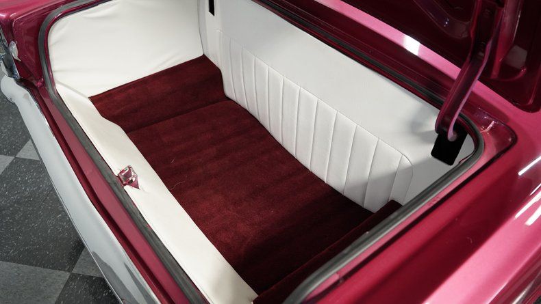 The interior is very customized and in very good shape. The white vinyl seats and door panels look graceful against the secondary burgundy/red color. The carpets are clean and protected by floor mats. The headliner and dash pad look in real good shape, while the custom Ford woodgrain steering wheel brings that much more character to the interior. The gauges and the gauge cluster appear to be original and easy to see. There are three more aftermarket Summit gauges mounted under the dashboard to help the driver keep an eye on things. For audio entertainment, a Kenwood AM/FM/CD stereo is installed, while heat, defrost, and A/C controls are right below that.