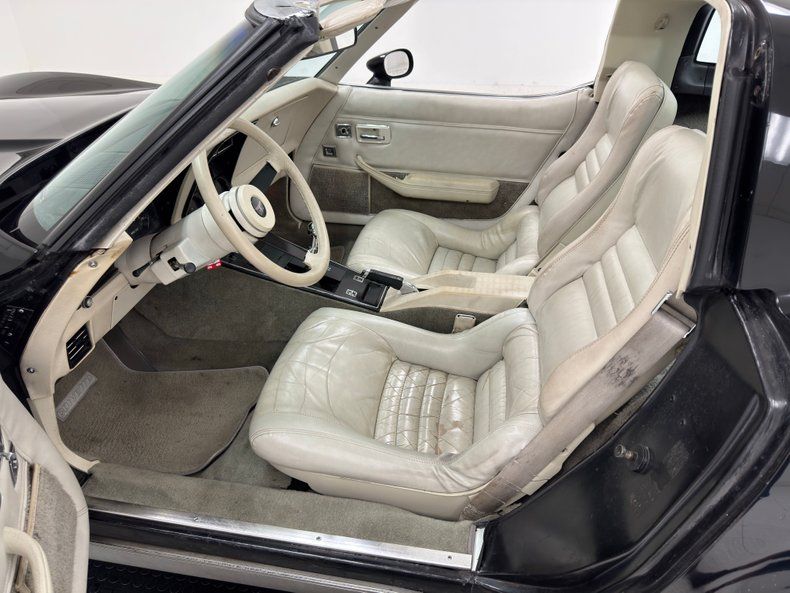 Oyster is sort of a pearlescent shade of white and it starts on the vinyl panels of the long doors. A gray carpeted lower panel is high enough to house the armrest while all other controls are towards the front of the door. The vinyl shows its age a bit with wavy piping and some loose fitment. The two piece leather sport seats are distinctively Corvette and the driver's side shows a good bit of wear and discoloration and tells the story of a car used as intended. Some leather cracking is noted in the passenger seat as well but not as bad and both seats provide good lower seat support. Newer gray carpet covers the storage area behind the seats as well as the floor and is in very good condition, protected by carpeted Corvette mats. A newer leather wrapped steering wheel is mounted on a tilting and telescoping column in need of some detailing, and it leads to a simple black plastic gauge cluster with speed and RPM on display flanking idiot lights. The center stack is more jet-like with numerous gauges and a clock just above an AM/FM radio and climate controls. A glowing orb is in the center console and it's the chrome knob to the shifter, housed in a hard, flat plastic surround and a black leather boot. Gazing upward, we see the tinted T-tops and oyster colored plastic surround which is in fine condition. Keeping things weatherproofed is all new weatherstripping as per our consignor