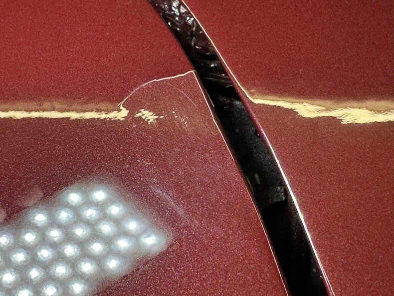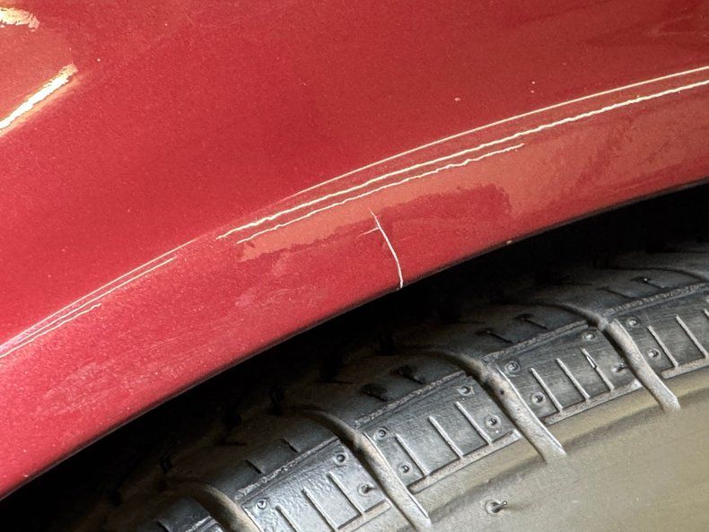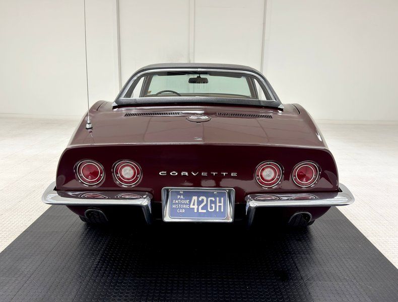 Eight colors were available in 1969 and this came with paint code 988, otherwise known as Burgundy Poly, and it's a great color for the car. A deep dark cherry that helps accentuate the iconic features such as the side gills, the sculpted hood, and chrome bumpers that cling to the ends. It's also a great complement to the tan canvas top and works well with the black vinyl covered accessory hardtop as well. It colors the coke bottle body as it arches over the 15-inch Chevrolet Rally wheels and the gently molded rear spoiler that ends up flaring the rear fascia around circle taillights and the Corvette lettering between them. Black painted side pipes practically disappear on the rockers. Remarkably, the exterior color also has the ability to hide small infractions and at some distance, the paint looks excellent. Up close, we note scratches, cracks, haziness, chips, touched up panels, and even bubbling all throughout.