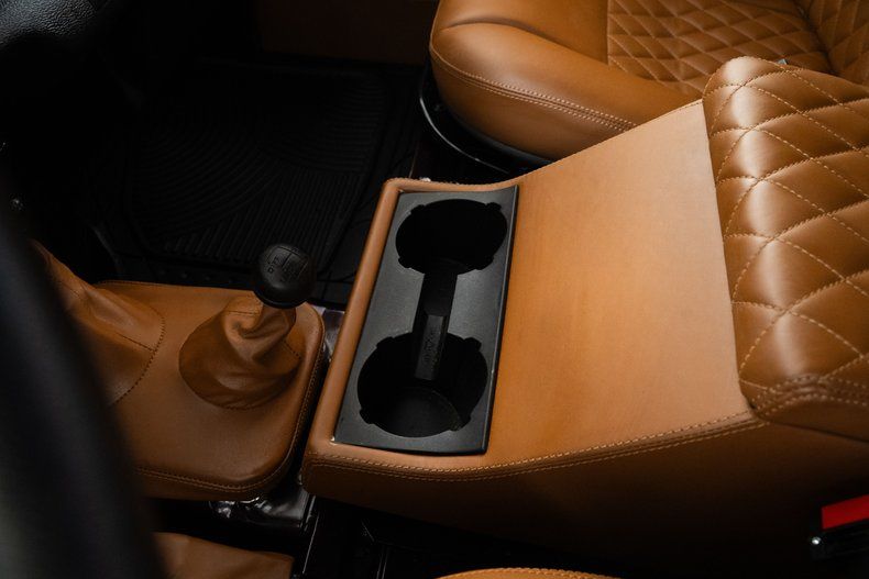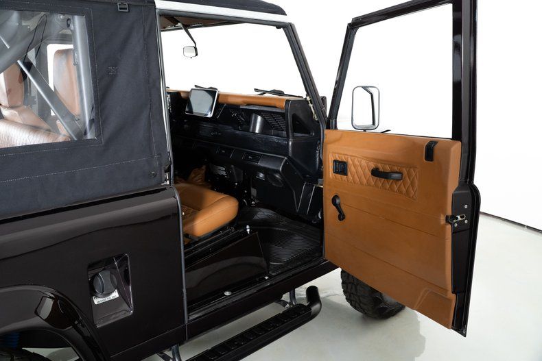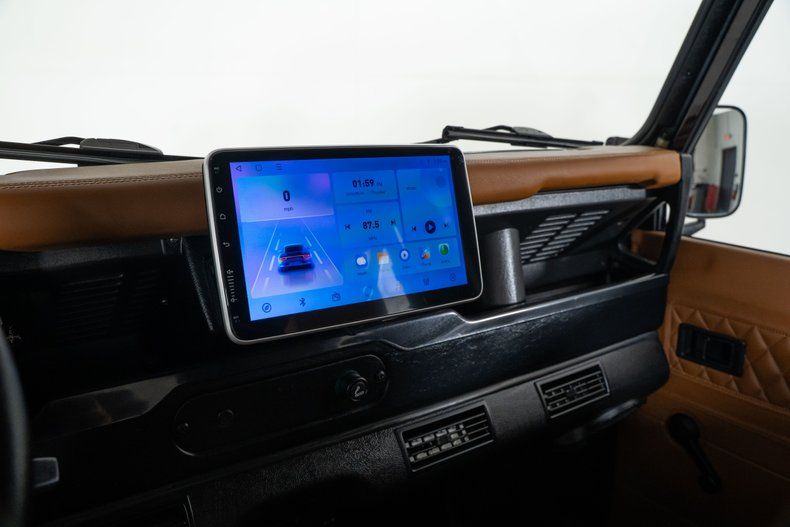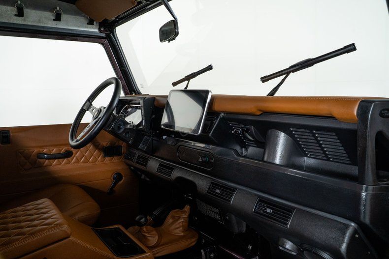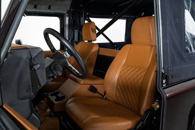 The custom red metallic exterior and black soft top give this Defender 90 a bold and unmistakable presence. Inside, the custom brown leather bucket seat interior adds a touch of luxury to its rugged design. Custom gauges keep vital information at a glance, while air conditioning ensures comfort in any climate.
