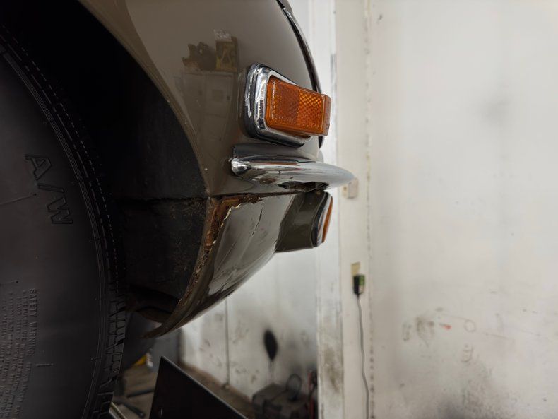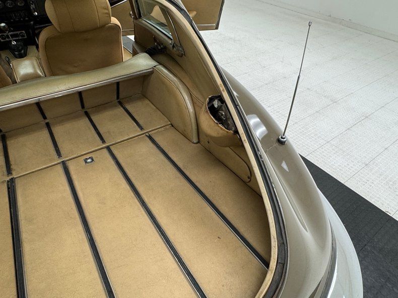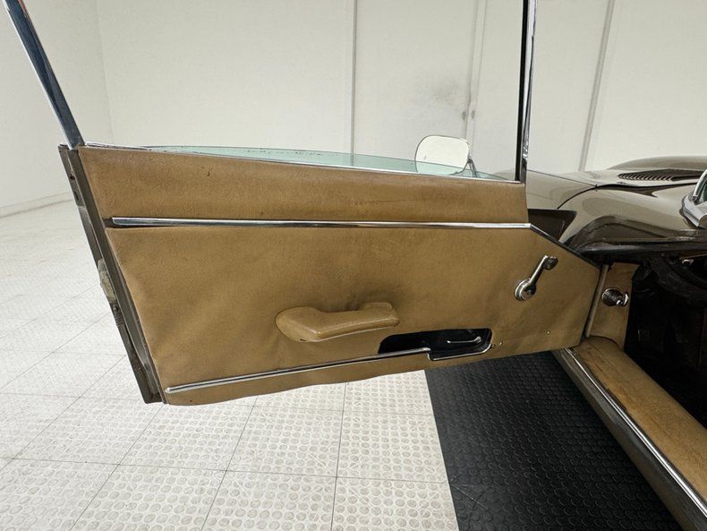 Exterior A sort of green toned brown coats the legendary lines of this big cat and is aptly named Ascot Fawn. The inset headlights and gaping mouth at the front end of the long nose, is iconic as it is epic and in nice condition with surface rust and bowing of the center emblem housing on the grille as well as on the bottom side of the crossbar. The louvers on the hood add the right amount of sportiness to the grand tourer and the 15-inch chrome wire wheels carry the class end of things, here showing some patina and peeling of the plating. The twin tailpipes extend past the rear bumper and flank the license plate and in profile, the spectacular long nose is accompanied by the high sloping rear section, long before the Porsche Panamera was dreamed up to accommodate rear passengers. Scuffs on the chin, less than perfect metal trim, uneven and cracking filler on the rear valance and numerous other places, gap imperfections, scratches, rust bubbles and some rust causing paint peeling all make our list of exterior flaws.