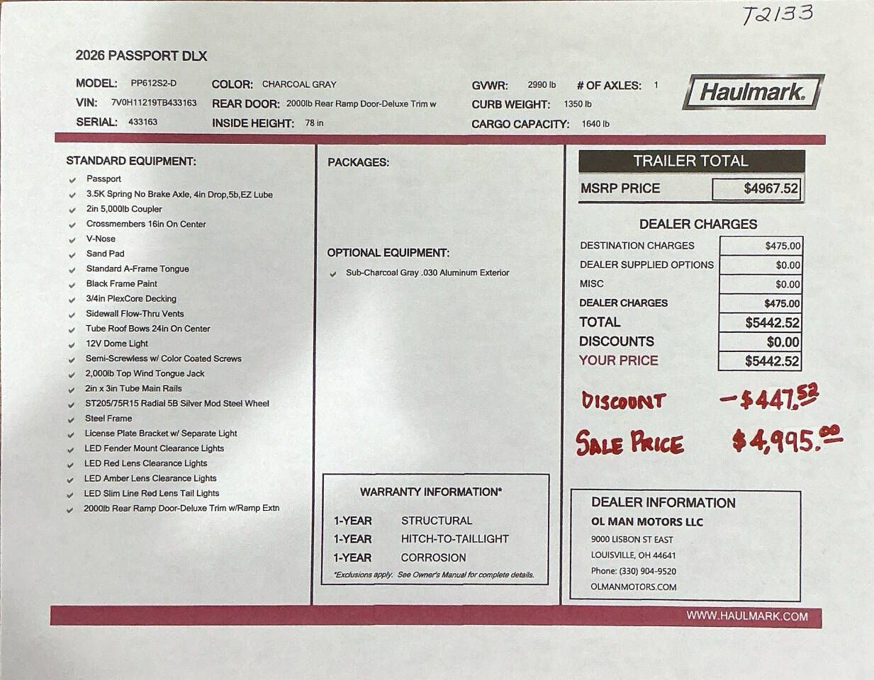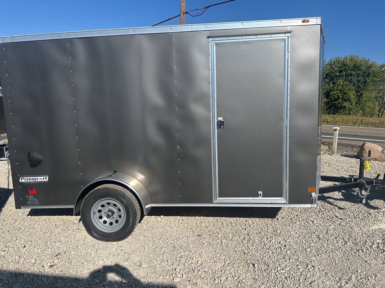 Payment $115 Per Month w/ Apprvd. Credit Out The Door 2026 Haulmark Passport DLX 6 x 12 Enclosed Trailer Charcoal Gray - V-Nose - 2,990 GVW 6'6 Inside Height Rear Ramp Door & 32 Side Entry Door PlexCore (wood) Decking & Sidewalls LED Lights Silver Mod Wheels
