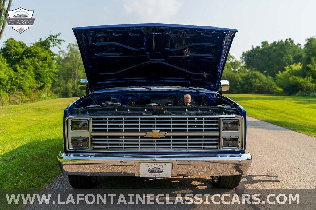 This 1985 Chevrolet C10 pickup was up fitted with a fuel-injected 6.2-liter V8 linked to a 4L65E four-speed automatic transmission and a 14-bolt rear axle. The body was refinished in blue and white and the interior has been re-trimmed in tan with custom diamond-stitched door panel accents.