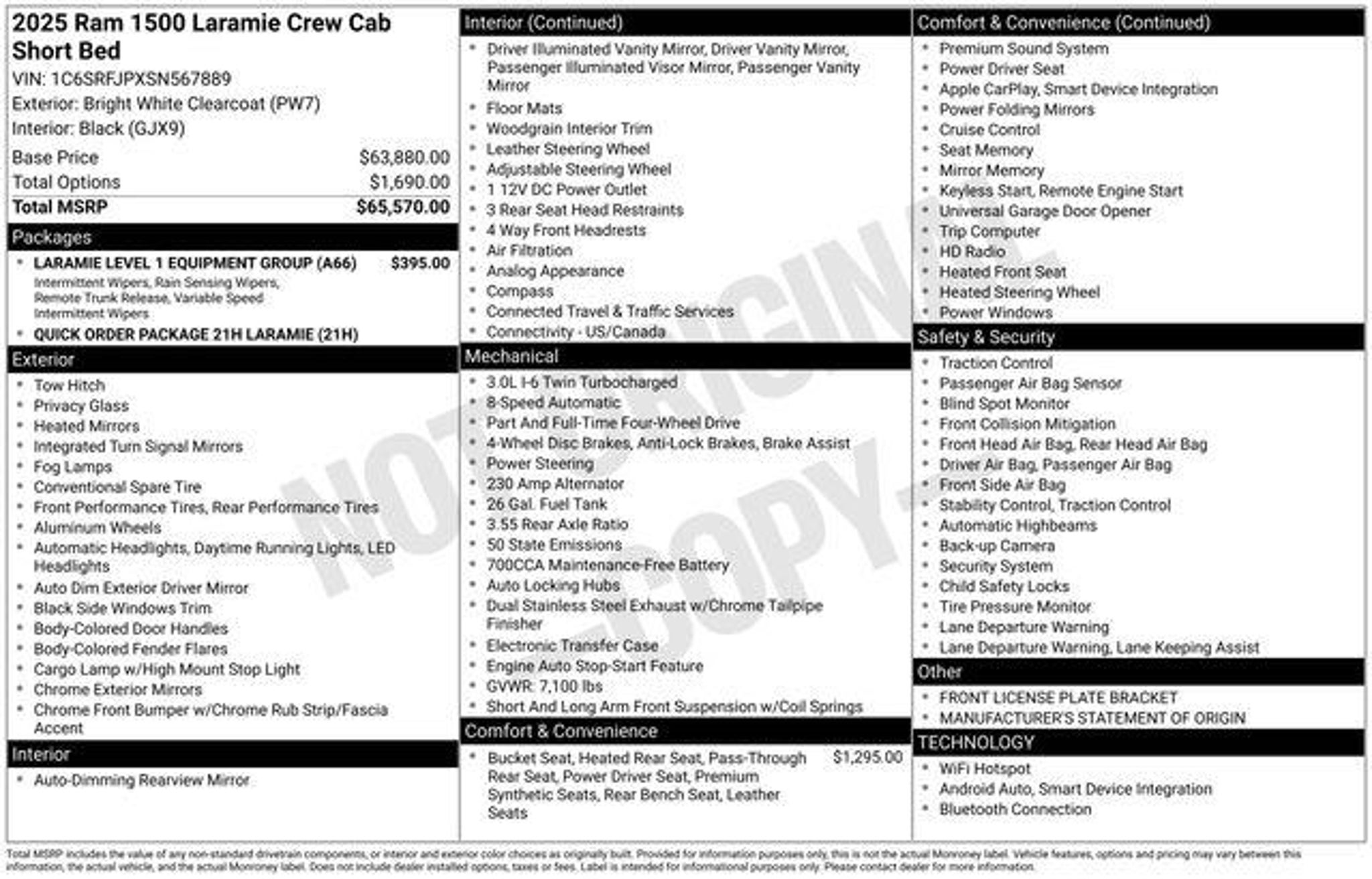 2025 Ram 1500 Laramie Crew Cab 4x4 â Modern Muscle, Premium Comfort The 2025 Ram 1500 Laramie Crew Cab 4x4 combines next-generation power with upscale refinement. Its new 3.0L I6 engine pairs with an 8-speed automatic transmission to deliver smooth, responsive performance and impressive towing capability while enhancing efficiency for everyday driving. Inside, the spacious Crew Cab surrounds you with luxury touches: leather-trimmed heated and ventilated front seats, a heated steering wheel, dual-zone automatic climate control, and a 10-way power driverâs seat with memory. The advanced Uconnect 5 system boasts a massive 12 touchscreen with Apple CarPlayÂ, Android Autoâ, and an Alpine premium audio system for an immersive sound experience. Equipped for work or play, this Laramie includes a Class IV receiver hitch, trailer brake controller, and a robust 4x4 system with electronic shift-on-demand transfer case. Safety is top-tier with blind-spot monitoring, ParkSense front and rear park assist, adaptive cruise control, and a 360 surround-view camera. Whether youâre towing, hauling, or heading out on a long road trip, the 2025 Ram 1500 Laramie 4x4 delivers the perfect blend of cutting-edge power and first-class comfort. â Peace of Mind CarFax Available Backed by Leo Kaytes Fordâs exclusive 10 Year / 100,000 Mile Limited Powertrain Warranty Available now at Leo Kaytes Ford in Warwick, NY Skip the extra feesâno gimmicks, no hidden costs. Just honest pricing and unbeatable value from your trusted local Ford dealer. Test drive today!