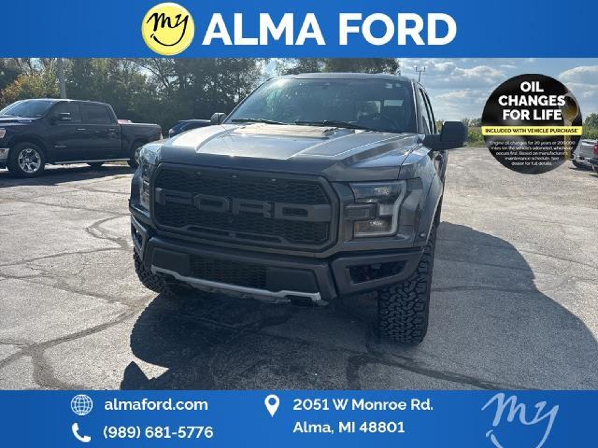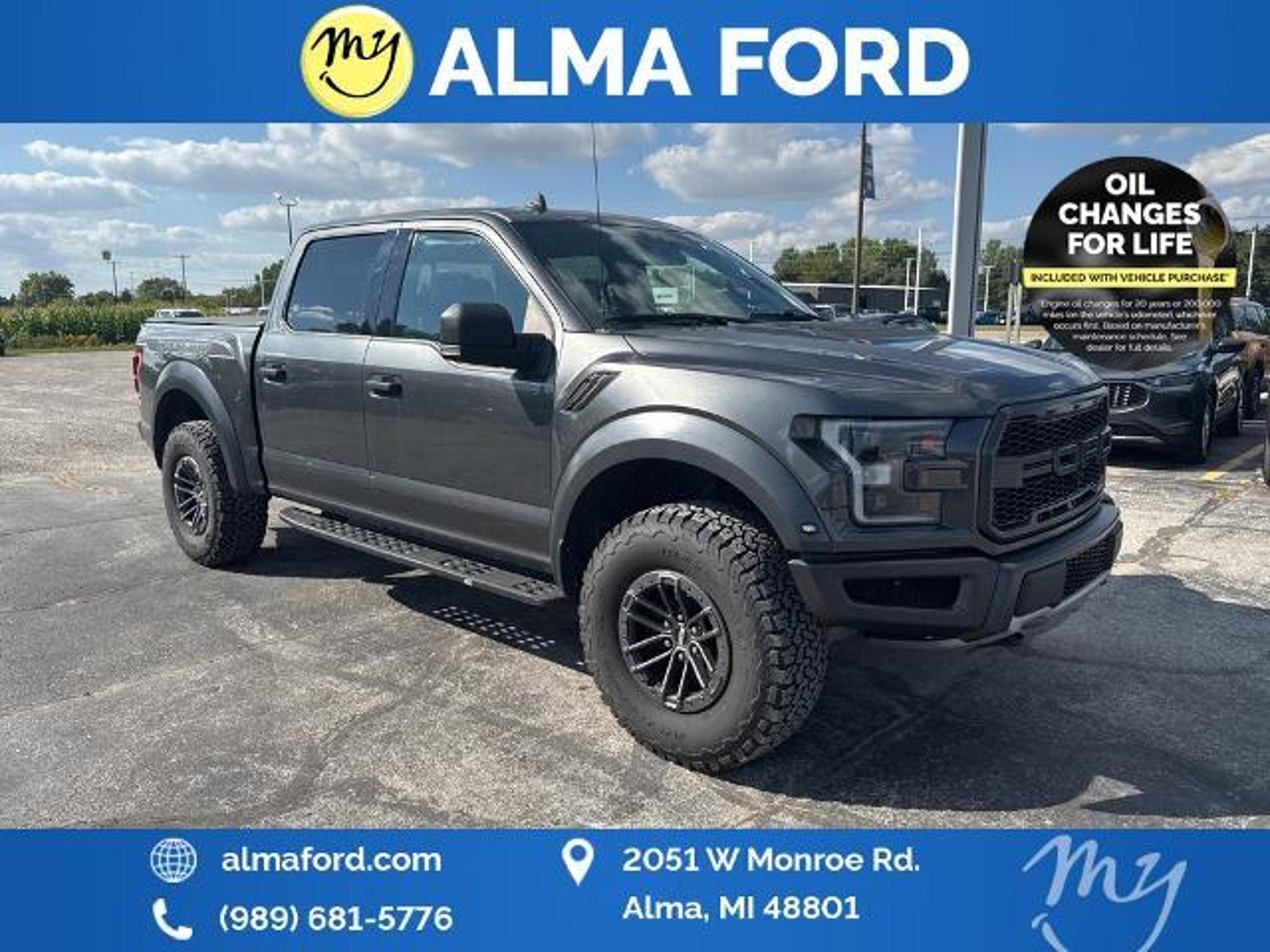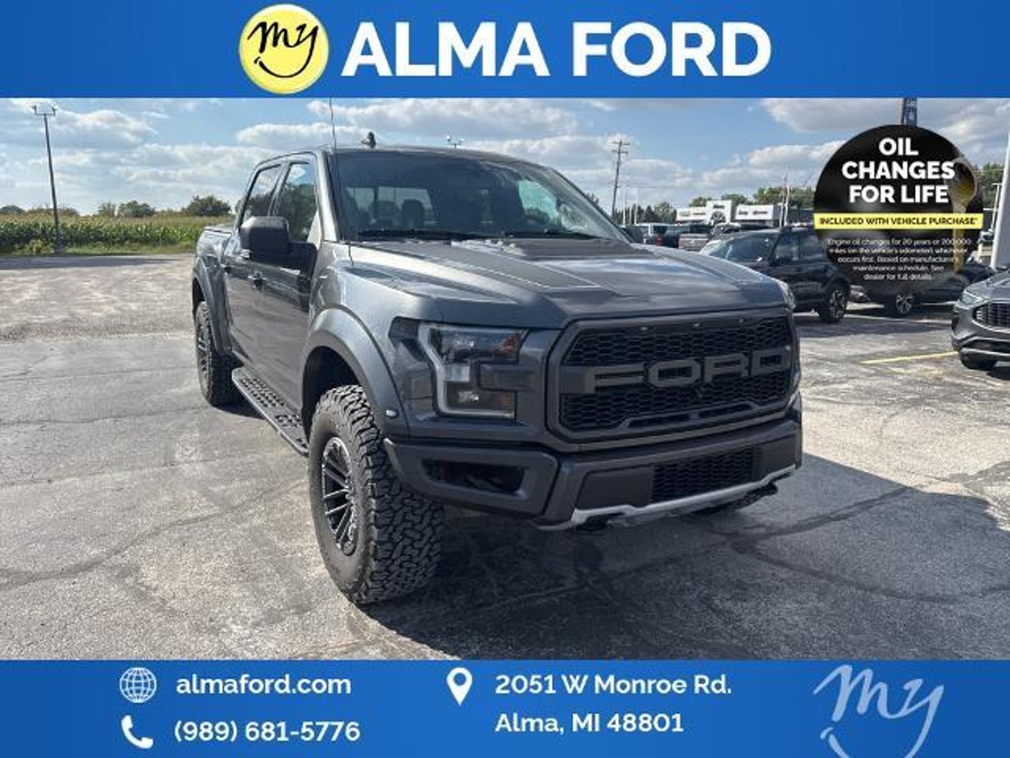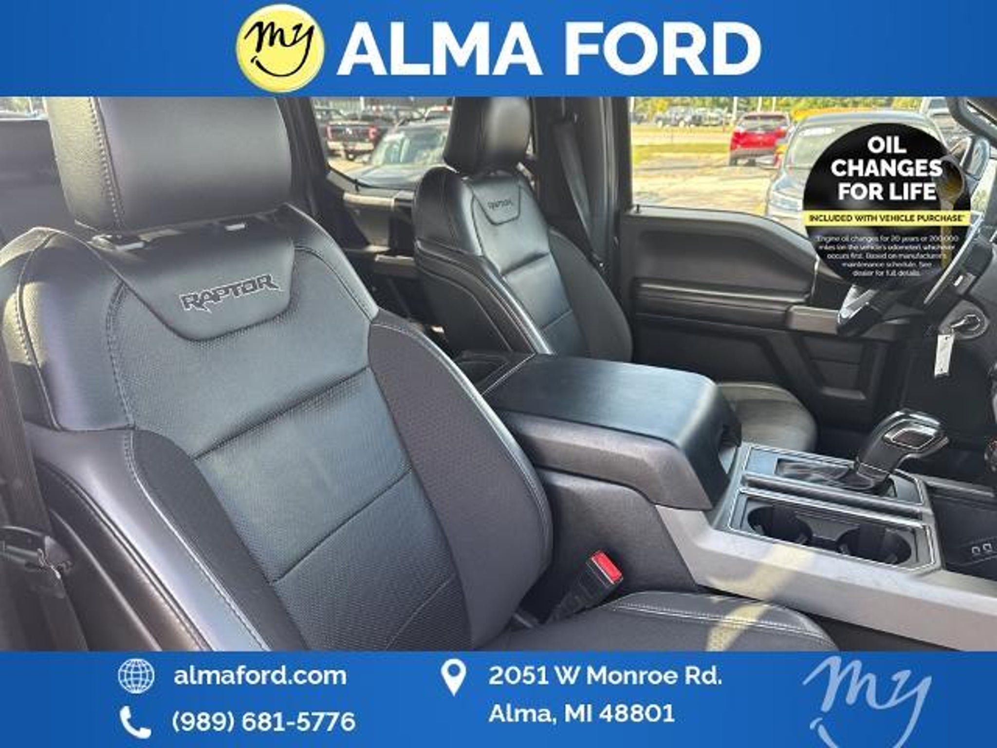 F-150 Raptor 4D SuperCrew 3.5L V6 EcoBoost 4WD Black Leather *4WD* *ACCIDENT FREE* *APPEARANCE PACKAGE* *APPLE CARPLAY & ANDROID AUTO* *BLIND SPOT MONITORING SYSTEM* *CLEAN CARFAX* *FULLY SERVICED* *HANDSFREE BLUETOOTH* *HEATED SEATS* *HEATED STEERING WHEEL* *JUST ARRIVED* *LANE DEPARTURE WARNING* *LEATHER HEATED POWER SEATS* *OIL CHANGES for LIFE* *PREMIUM WHEELS* *REMOTE START* *SUPER BUY* 17 Forged Aluminum Bead-Lock Capable Wheels. 2019 Ford F-150 Raptor 4WD 10-Speed Automatic 3.5L V6 EcoBoost Magnetic Certified. Your Best Price on Any New Ford Is at Alma Ford. Under new ownership and family-run Alma Ford delivers a best price guarantee on every new Ford and top dollar for your trade. We re actively adding inventory which means we won t be beat on trade-in value. Every vehicle is fully detailed and safety inspected by certified technicians giving you confidence from day one. Our team is committed to a straightforward no-pressure buying experience. Best Price Guarantee We Pay More for Trades Home Delivery Available We stock a wide selection of new and pre-owned vehicles including Bronco Escape Edge Explorer Expedition F-150 Super Duty (F-250 / F-350) Maverick Mustang Mach-E Ranger Transit and more. Call to schedule a test drive View inventory at Visit us at 2051 W. Monroe Alma MI 48801 Alma Ford under new ownership and ready to earn your business. Alma Ford is proud to serve our customers by delivering a straightforward customer-first experience designed to save you time and money on every new and pre-owned vehicle. See dealer for complete details. Dealer is not responsible for pricing errors. All prices plus tax title plate and doc fees; includes applicable manufacturer rebates. We proudly serve Alma and surrounding communities including Carson City Ithaca Mount Pleasant St. Johns Saginaw Midland Big Rapids Lakeview Edmore Breckenridge Ashley Shepherd Clare Greenville Hemlock Grand Rapids Lansing Kalamazoo Muskegon Grand Haven Holland Wyoming and customers throughout the state of Michigan. Some used vehicles may be subject to unrepaired safety recalls. Check for open recalls by VIN at . Certification Program Details: 139-Point Inspection completed by Ford-trained technicians 90-Day / 4000-Mile Comprehensive Limited Warranty 14-Day / 1000-Mile Money-Back Guarantee 24/7 Roadside Assistance CARFAX® Vehicle History Report Included Vehicles less than 10 years old with fewer than 150000 miles Transferable warranty for added resale value Service available at any Ford dealer nationwide Awards: * JD Power Automotive Performance Execution and Layout (APEAL) Study
