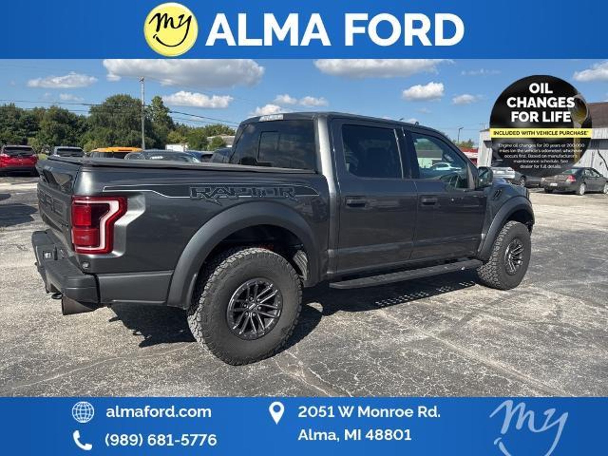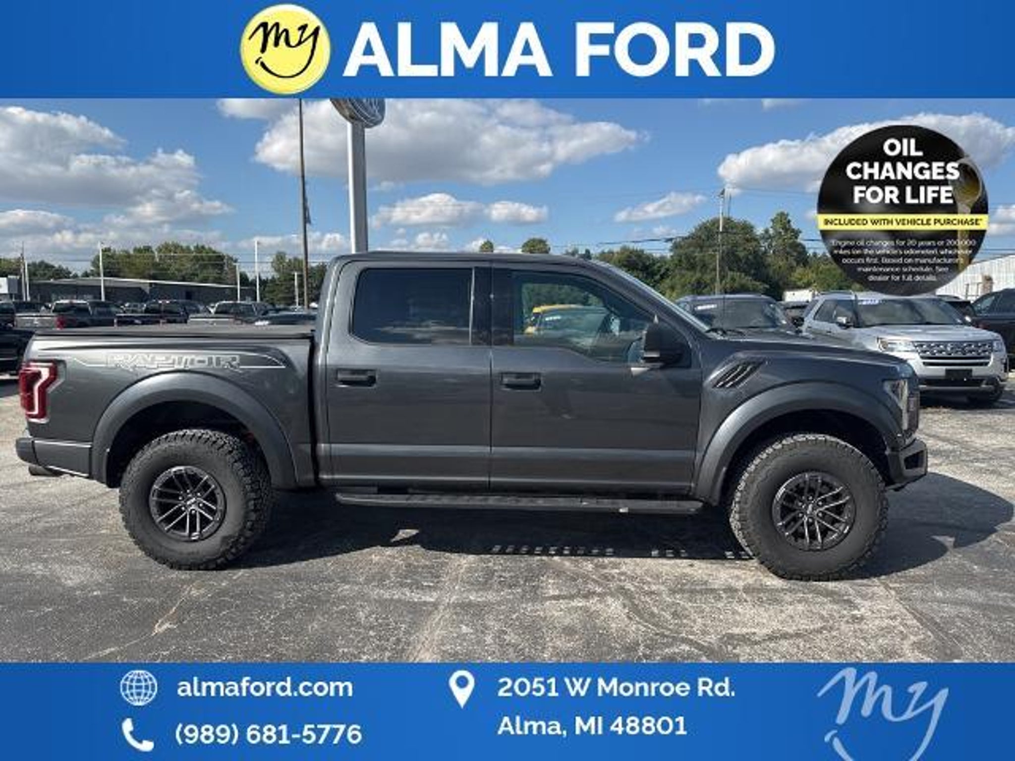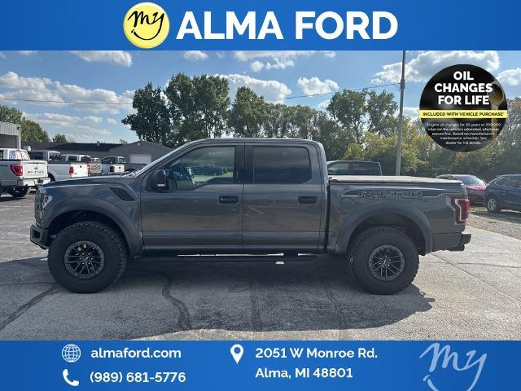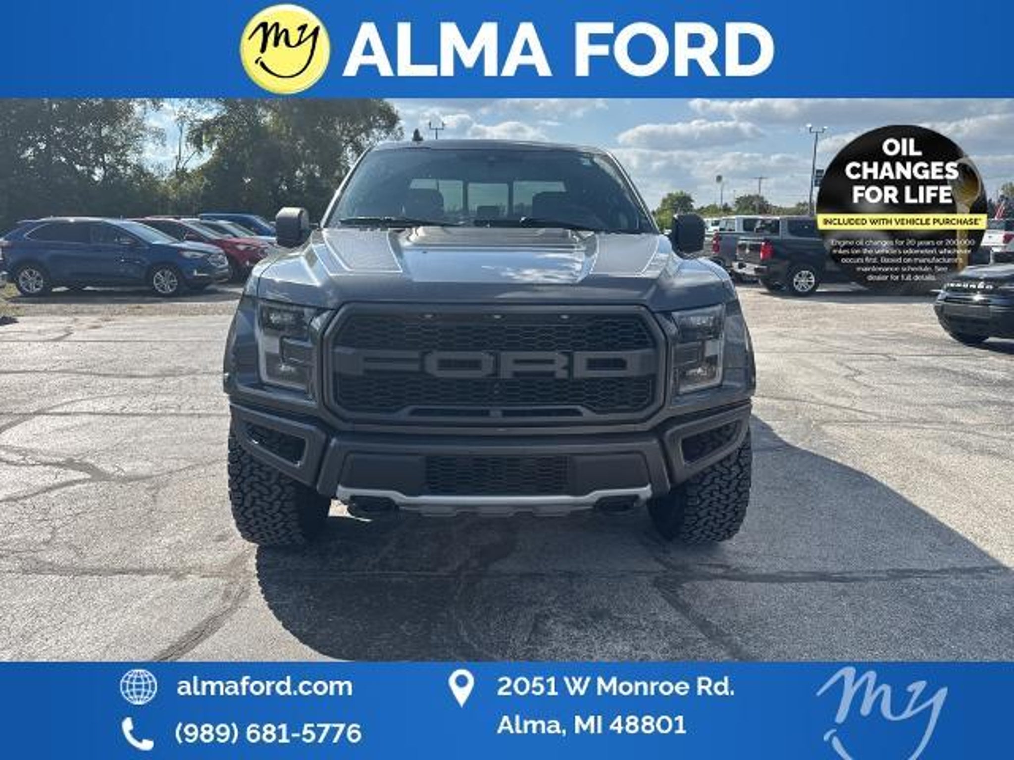 F-150 Raptor 4D SuperCrew 3.5L V6 EcoBoost 4WD Black Leather *4WD* *ACCIDENT FREE* *APPEARANCE PACKAGE* *APPLE CARPLAY & ANDROID AUTO* *BLIND SPOT MONITORING SYSTEM* *CLEAN CARFAX* *FULLY SERVICED* *HANDSFREE BLUETOOTH* *HEATED SEATS* *HEATED STEERING WHEEL* *JUST ARRIVED* *LANE DEPARTURE WARNING* *LEATHER HEATED POWER SEATS* *OIL CHANGES for LIFE* *PREMIUM WHEELS* *REMOTE START* *SUPER BUY* 17 Forged Aluminum Bead-Lock Capable Wheels. 2019 Ford F-150 Raptor 4WD 10-Speed Automatic 3.5L V6 EcoBoost Magnetic Certified. Your Best Price on Any New Ford Is at Alma Ford. Under new ownership and family-run Alma Ford delivers a best price guarantee on every new Ford and top dollar for your trade. We re actively adding inventory which means we won t be beat on trade-in value. Every vehicle is fully detailed and safety inspected by certified technicians giving you confidence from day one. Our team is committed to a straightforward no-pressure buying experience. Best Price Guarantee We Pay More for Trades Home Delivery Available We stock a wide selection of new and pre-owned vehicles including Bronco Escape Edge Explorer Expedition F-150 Super Duty (F-250 / F-350) Maverick Mustang Mach-E Ranger Transit and more. Call to schedule a test drive View inventory at Visit us at 2051 W. Monroe Alma MI 48801 Alma Ford under new ownership and ready to earn your business. Alma Ford is proud to serve our customers by delivering a straightforward customer-first experience designed to save you time and money on every new and pre-owned vehicle. See dealer for complete details. Dealer is not responsible for pricing errors. All prices plus tax title plate and doc fees; includes applicable manufacturer rebates. We proudly serve Alma and surrounding communities including Carson City Ithaca Mount Pleasant St. Johns Saginaw Midland Big Rapids Lakeview Edmore Breckenridge Ashley Shepherd Clare Greenville Hemlock Grand Rapids Lansing Kalamazoo Muskegon Grand Haven Holland Wyoming and customers throughout the state of Michigan. Some used vehicles may be subject to unrepaired safety recalls. Check for open recalls by VIN at . Certification Program Details: 139-Point Inspection completed by Ford-trained technicians 90-Day / 4000-Mile Comprehensive Limited Warranty 14-Day / 1000-Mile Money-Back Guarantee 24/7 Roadside Assistance CARFAX® Vehicle History Report Included Vehicles less than 10 years old with fewer than 150000 miles Transferable warranty for added resale value Service available at any Ford dealer nationwide Awards: * JD Power Automotive Performance Execution and Layout (APEAL) Study
