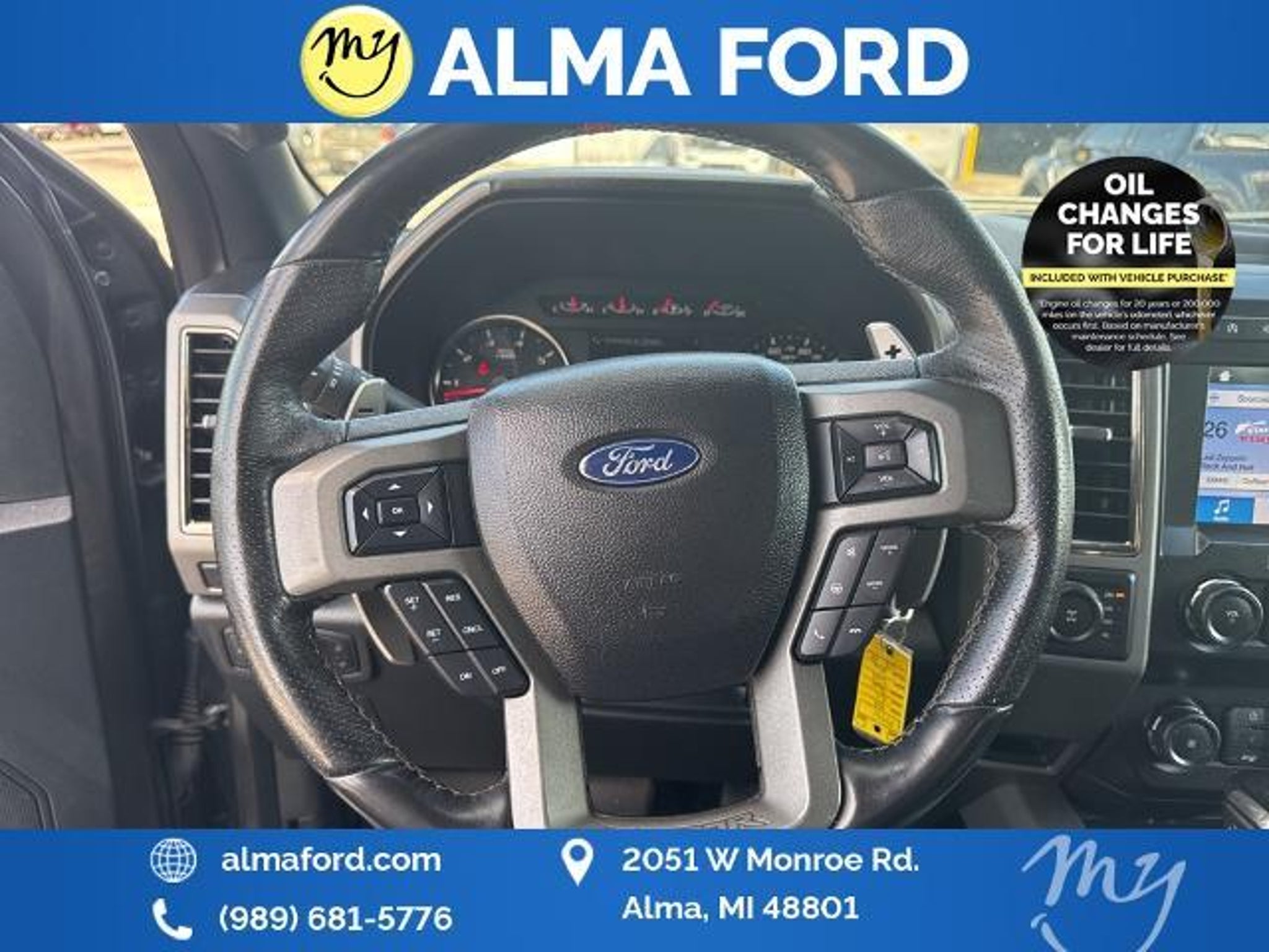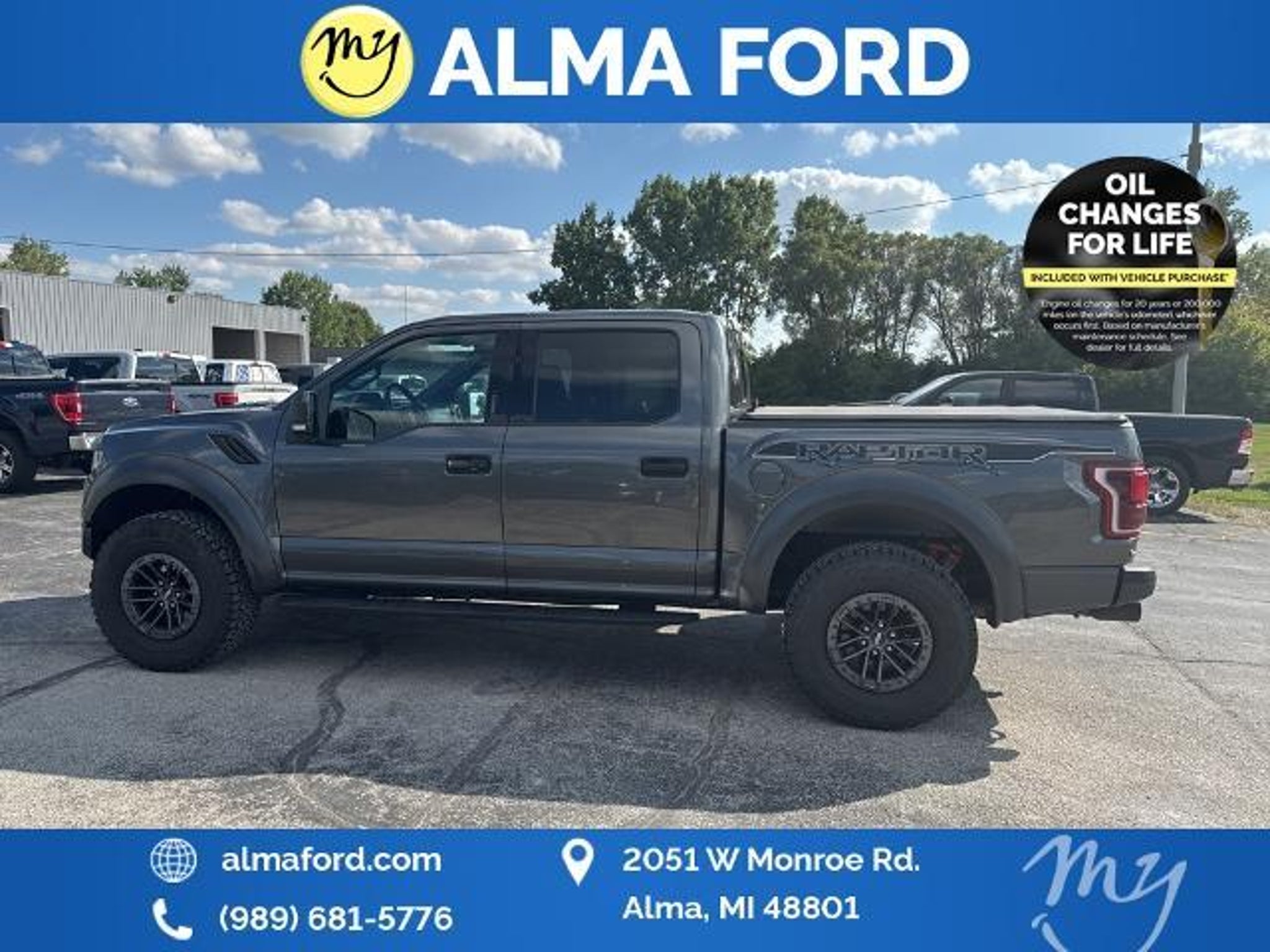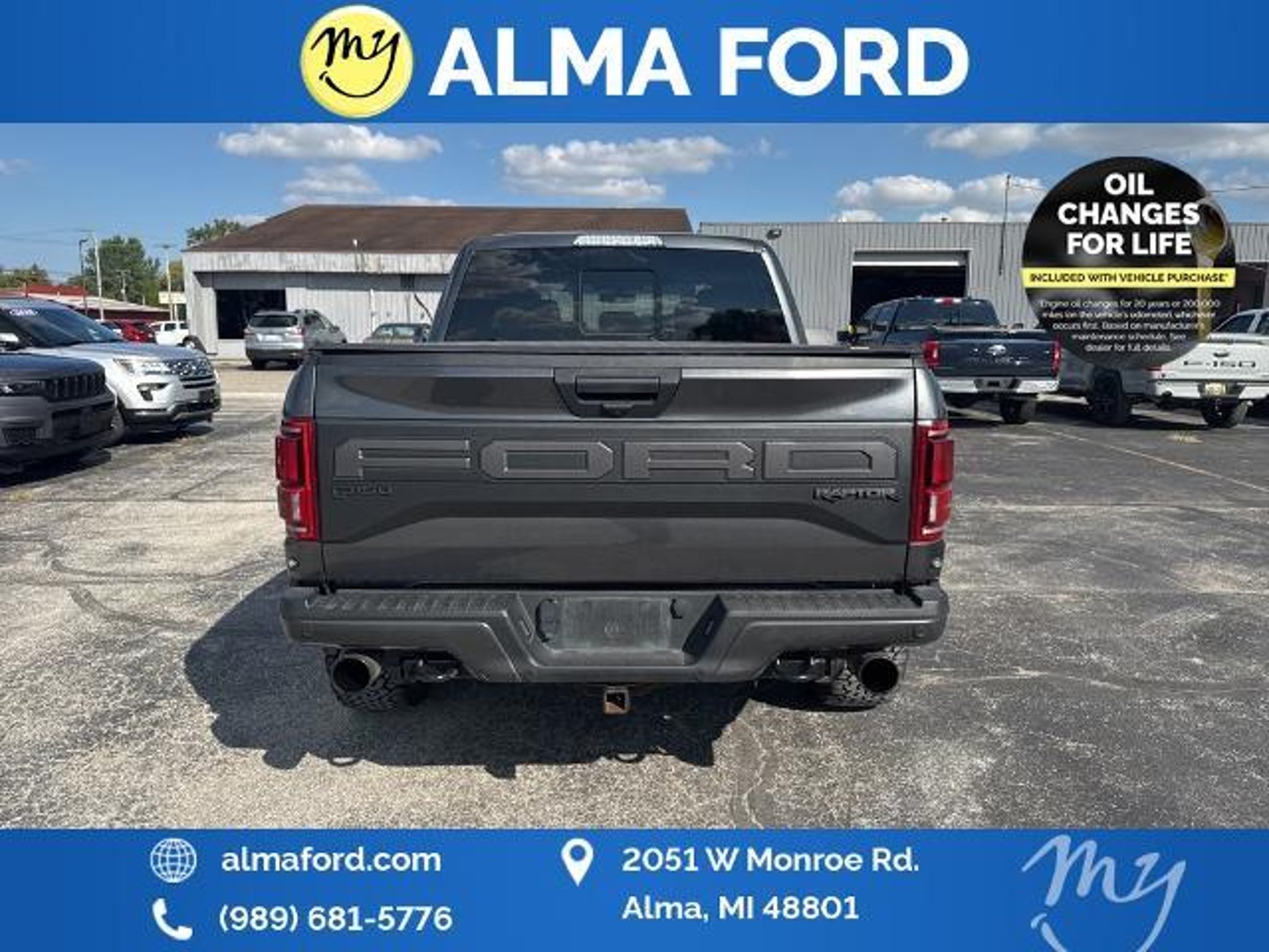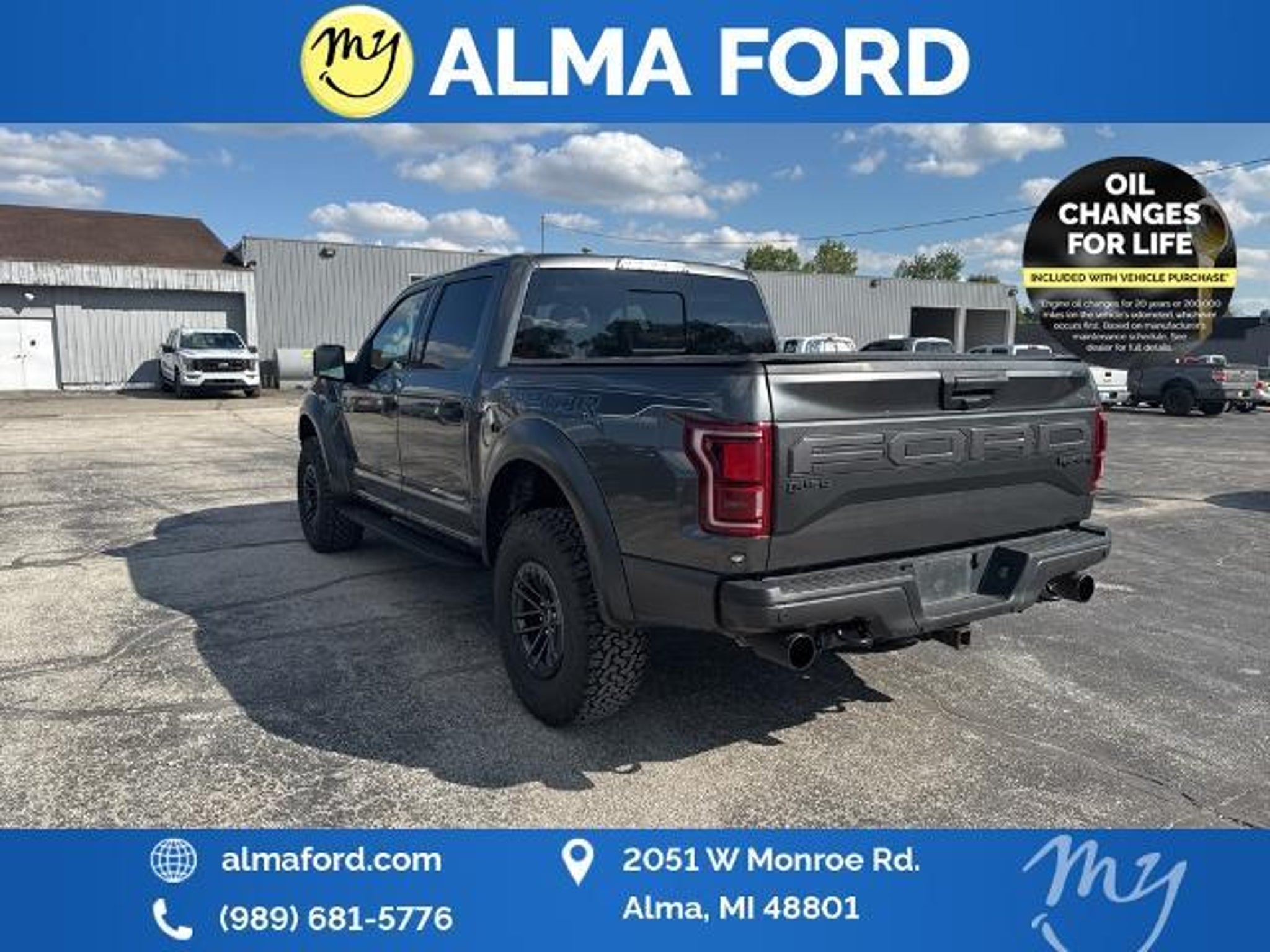 F-150 Raptor 4D SuperCrew 3.5L V6 EcoBoost 4WD Black Leather *4WD* *ACCIDENT FREE* *APPEARANCE PACKAGE* *APPLE CARPLAY & ANDROID AUTO* *BLIND SPOT MONITORING SYSTEM* *CLEAN CARFAX* *FULLY SERVICED* *HANDSFREE BLUETOOTH* *HEATED SEATS* *HEATED STEERING WHEEL* *JUST ARRIVED* *LANE DEPARTURE WARNING* *LEATHER HEATED POWER SEATS* *OIL CHANGES for LIFE* *PREMIUM WHEELS* *REMOTE START* *SUPER BUY* 17 Forged Aluminum Bead-Lock Capable Wheels. 2019 Ford F-150 Raptor 4WD 10-Speed Automatic 3.5L V6 EcoBoost Magnetic Certified. Your Best Price on Any New Ford Is at Alma Ford. Under new ownership and family-run Alma Ford delivers a best price guarantee on every new Ford and top dollar for your trade. We re actively adding inventory which means we won t be beat on trade-in value. Every vehicle is fully detailed and safety inspected by certified technicians giving you confidence from day one. Our team is committed to a straightforward no-pressure buying experience. Best Price Guarantee We Pay More for Trades Home Delivery Available We stock a wide selection of new and pre-owned vehicles including Bronco Escape Edge Explorer Expedition F-150 Super Duty (F-250 / F-350) Maverick Mustang Mach-E Ranger Transit and more. Call to schedule a test drive View inventory at Visit us at 2051 W. Monroe Alma MI 48801 Alma Ford under new ownership and ready to earn your business. Alma Ford is proud to serve our customers by delivering a straightforward customer-first experience designed to save you time and money on every new and pre-owned vehicle. See dealer for complete details. Dealer is not responsible for pricing errors. All prices plus tax title plate and doc fees; includes applicable manufacturer rebates. We proudly serve Alma and surrounding communities including Carson City Ithaca Mount Pleasant St. Johns Saginaw Midland Big Rapids Lakeview Edmore Breckenridge Ashley Shepherd Clare Greenville Hemlock Grand Rapids Lansing Kalamazoo Muskegon Grand Haven Holland Wyoming and customers throughout the state of Michigan. Some used vehicles may be subject to unrepaired safety recalls. Check for open recalls by VIN at . Certification Program Details: 139-Point Inspection completed by Ford-trained technicians 90-Day / 4000-Mile Comprehensive Limited Warranty 14-Day / 1000-Mile Money-Back Guarantee 24/7 Roadside Assistance CARFAX® Vehicle History Report Included Vehicles less than 10 years old with fewer than 150000 miles Transferable warranty for added resale value Service available at any Ford dealer nationwide Awards: * JD Power Automotive Performance Execution and Layout (APEAL) Study