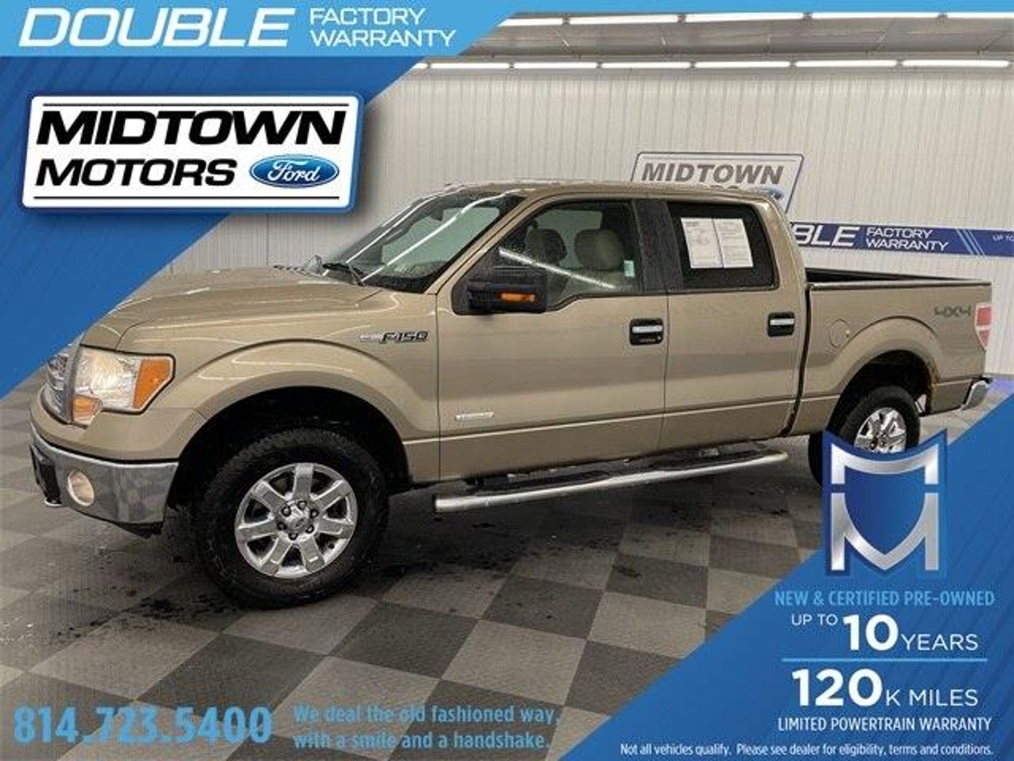 AS-IS VEHICLE THIS IS A FRESH TRADE THAT HAS NOT AND WILL NOT BE SERVICED. SOLD COMPLETELY AS TRADED. SOLD WITH ABSOLUTELY NO GUARANTEES AT ALL. THIS IS JUST AN ALTERNATIVE TO TAKING IT TO THE AUCTION. 2013 Ford F-150 XLT Pale Adobe Metallic 4D SuperCrew 4WD 3.5L V6 6-Speed Automatic Electronic Odometer is 22067 miles below market average! 4WD, 17 Machined-Aluminum w/Painted Accents Wheels, 18 Chrome-Clad Aluminum Wheels, 3.31 Axle Ratio, 3.55 Axle Ratio, 4 Speakers, 4-Wheel Disc Brakes, 4.2 LCD Productivity Screen in Instrument Cluster, 5 Chrome Running Boards, 6-Way Power Driver Seat, ABS brakes, Air Conditioning, Alloy wheels, AM/FM radio, Auxiliary Transmission Oil Cooler, Bumpers: chrome, CD player, Chrome Door Handles w/Black Bezels, Chrome Exhaust Tip, Cloth 40/20/40 Front Seat, Compass, Delay-off headlights, Driver door bin, Driver vanity mirror, Dual front impact airbags, Dual front side impact airbags, Electronic Stability Control, Equipment Group 302A Luxury, Front anti-roll bar, Front Center Armrest w/Storage, Front fog lights, Front License Plate Bracket, Front reading lights, Front wheel independent suspension, Fully automatic headlights, GVWR: 7,350 lbs Payload Package, Heated Power Side Mirrors, Illuminated entry, Leather-Wrapped Steering Wheel, Low tire pressure warning, Occupant sensing airbag, Outside temperature display, Overhead airbag, Overhead console, Panic alarm, Passenger door bin, Passenger vanity mirror, Power Adjustable Pedals, Power door mirrors, Power steering, Power windows, Power-Sliding Rear Window w/Defrost & Privacy Tint, Radio data system, Radio: AM/FM Stereo/Clock/Single-CD, Rear reading lights, Rear step bumper, Rear-View Camera, Remote keyless entry, Reverse Sensing System, Security system, SelectShift Automatic Transmission, Self-Dimming Rear-View Mirror, SiriusXM Satellite Radio, Speed control, Speed-sensing steering, Split folding rear seat, Steering wheel mounted audio controls, SYNC, SYNC MyFord, Tachometer, Tilt steering wheel, Traction control, Trailer Brake Controller, Trailer Tow Package, Upgraded Radiator, Variably intermittent wipers, XLT Chrome Package, XLT Convenience Package, XLT Plus Package, 4WD. BUY FROM AN AWARD WINNING DEALER Here at Warren Midtown Motors Inc, we know that you can visit any number of dealerships when shopping for a car. That's why we always make sure go above and beyond for our loyal customers throughout Warren, Jamestown NY, Bradford and Kane. It's our world class customer service that helps us earn your business time and agai