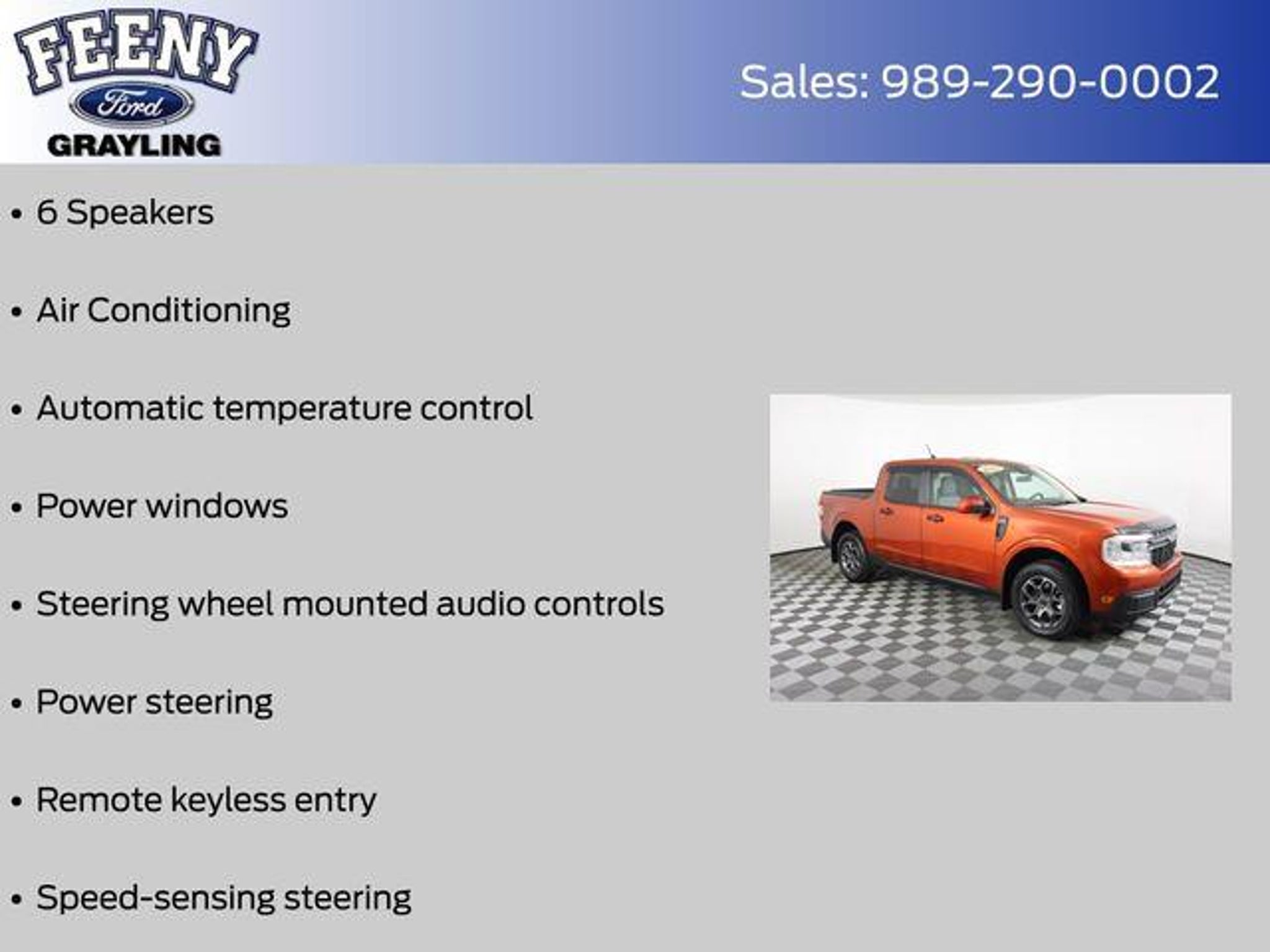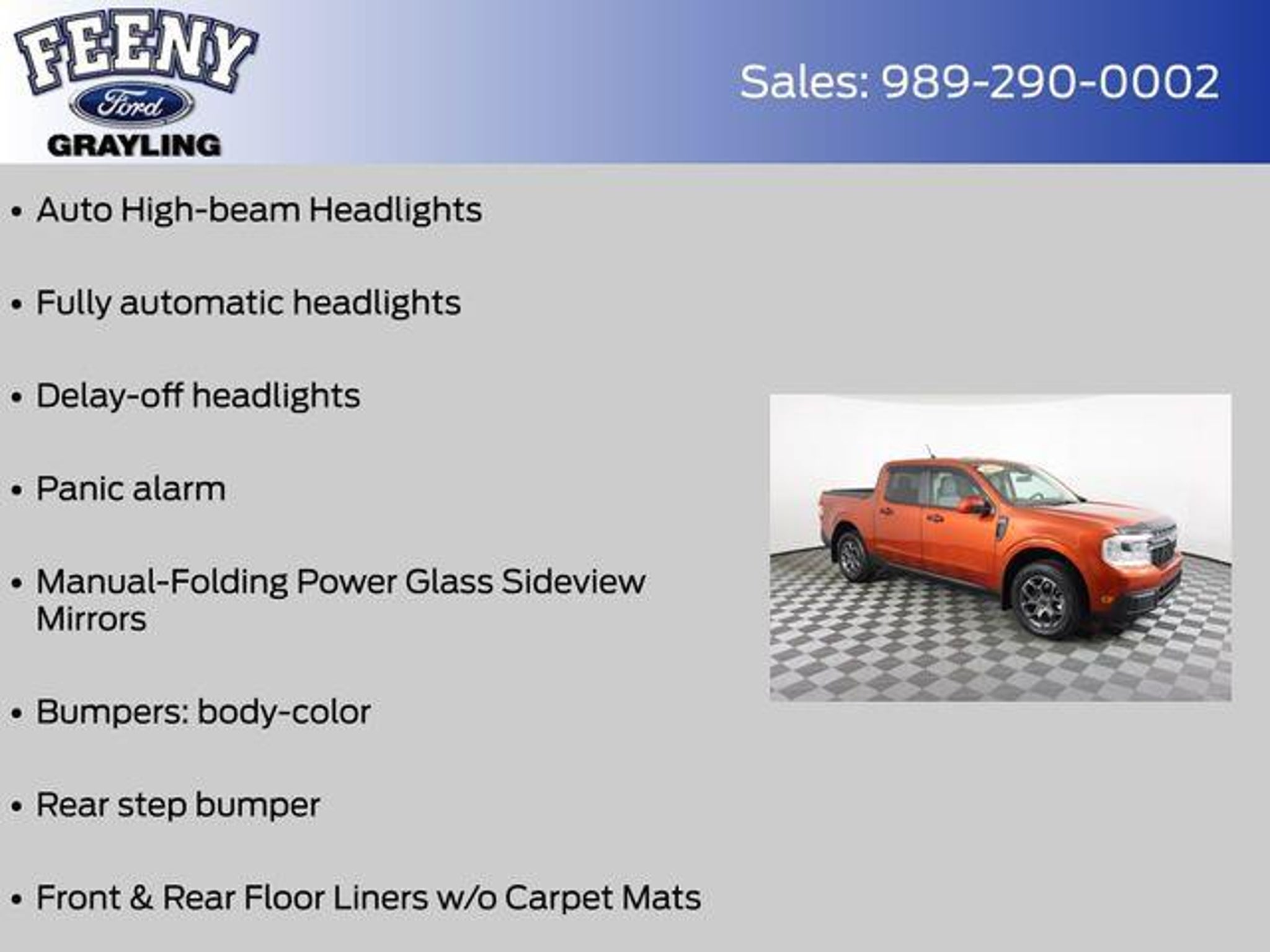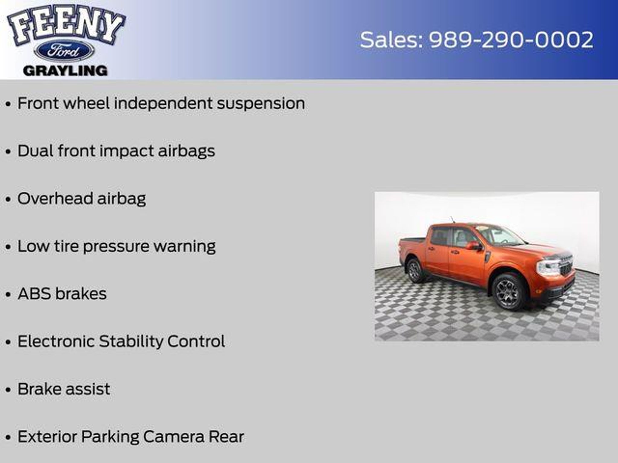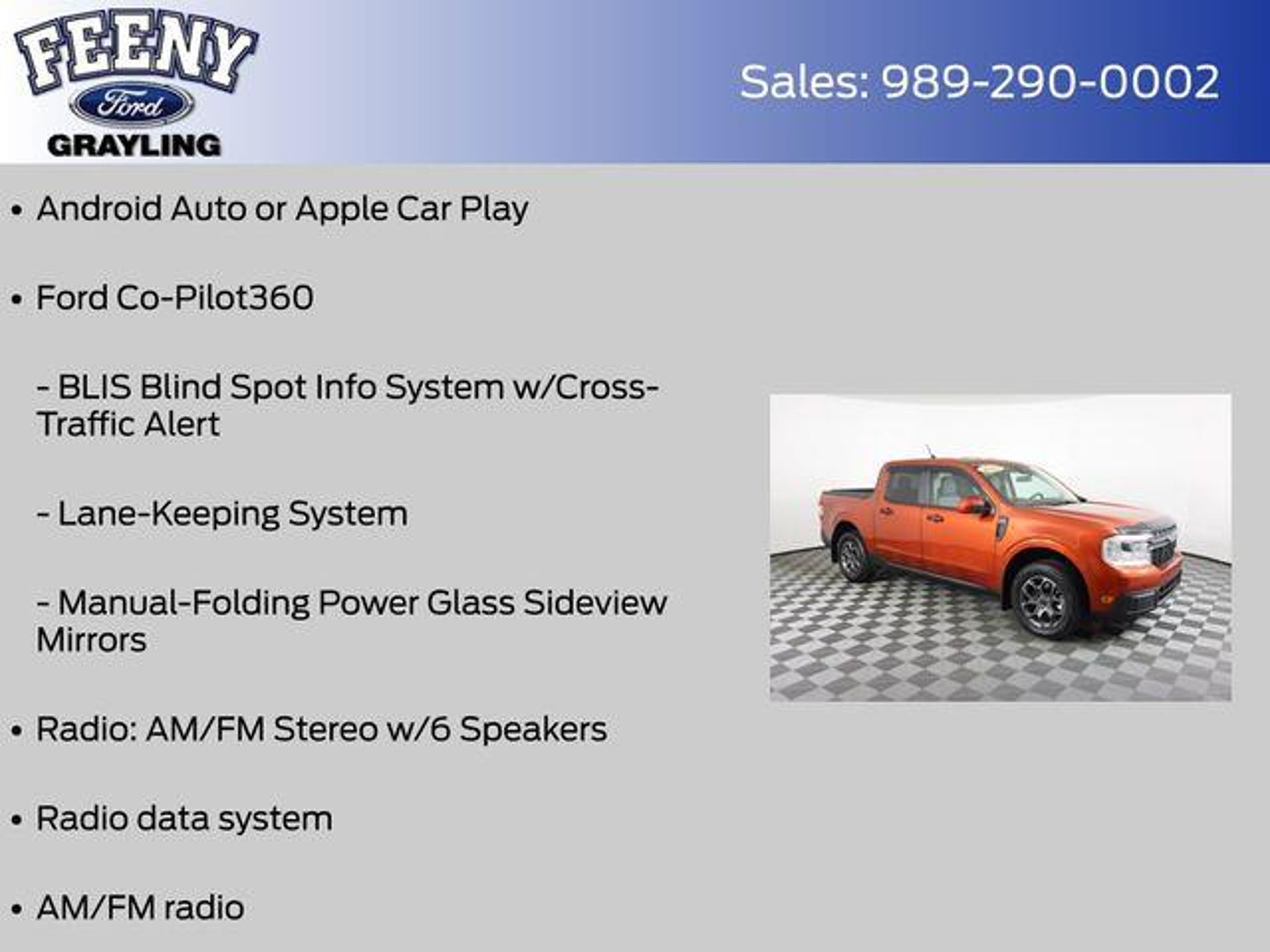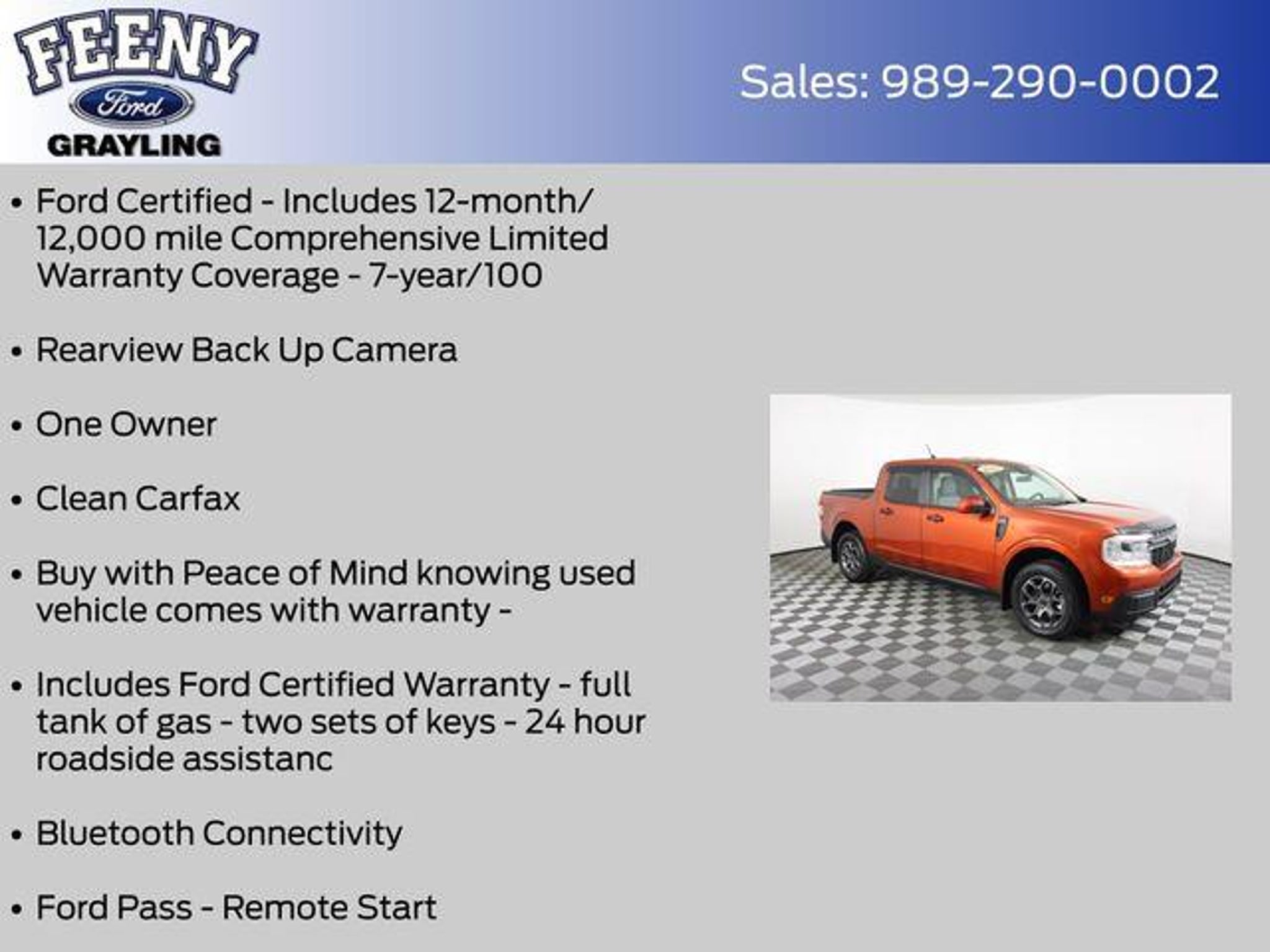 Discover the perfect blend of capability, efficiency, and style with this 2022 Ford Maverick XLT. This certified pre-owned gem boasts a striking Red exterior and a host of premium features that elevate your driving experience. - Ford Certified - Includes 12-month/12,000 mile Comprehensive Limited Warranty Coverage - One Owner - Clean Carfax - Rearview Back Up Camera - Bluetooth Connectivity - Ford Pass - Remote Start - Android Auto or Apple Car Play - XLT LUXURY PACKAGE - FORD CO-PILOT360 Under the hood, this Maverick is powered by a 2.5L I-4 Hybrid engine, delivering an impressive 42 city/33 highway MPG. The Continuous Variable Transmission (CVT) and Front-Wheel Drive (FWD) configuration provide a smooth, efficient driving experience. Stepping inside, you'll find a wealth of premium features that elevate your daily commute. The Leather Wrapped Heated Steering Wheel, Heated Front Seats, and 8-way power driver and 6-way manual passenger seats ensure maximum comfort. The 400W Inverter with USB Console and Bed Tie Down Locking Rails add versatility, while the BLIS Blind Spot Info System with Cross-Traffic Alert and Lane-Keeping System provide peace of mind on the road. This Maverick also boasts a host of advanced safety technologies, including Dual Front Impact Airbags, Dual Front Side Impact Airbags, Knee Airbag, Overhead Airbag, and Electronic Stability Control, ensuring your protection on every journey. With Ford's Gold Certified program, you can purchase this Maverick with confidence. The 172-point inspection, Roadside Assistance, Transferable Warranty, and 12-month/12,000-mile Limited Warranty coverage provide the assurance you need to make an informed decision. Don't miss your chance to own this exceptional 2022 Ford Maverick XLT. Visit us today at FeenyFord.com to schedule a test drive and experience the perfect blend of capability, efficiency, and style. Online all the time at FeenyFord.com