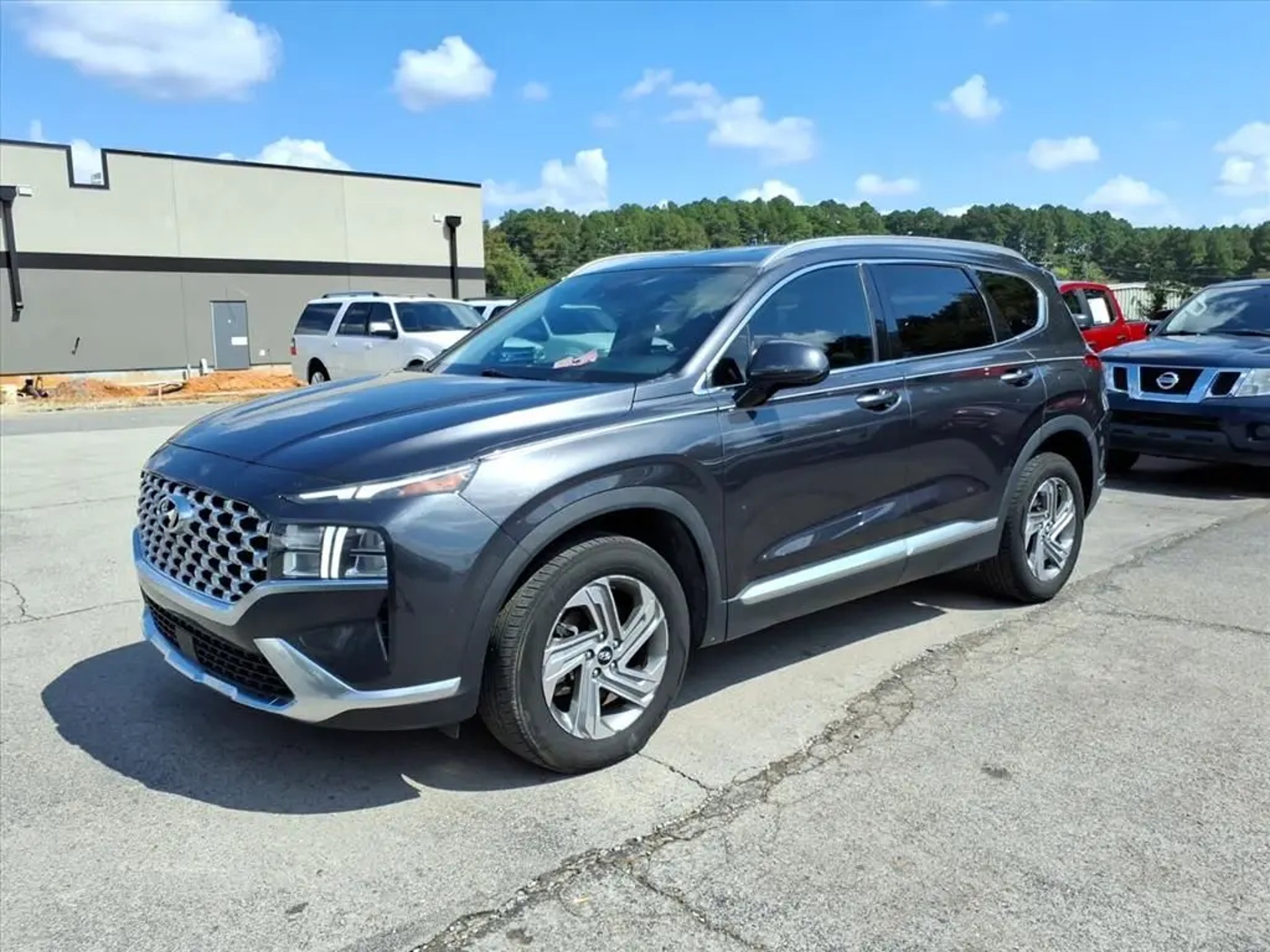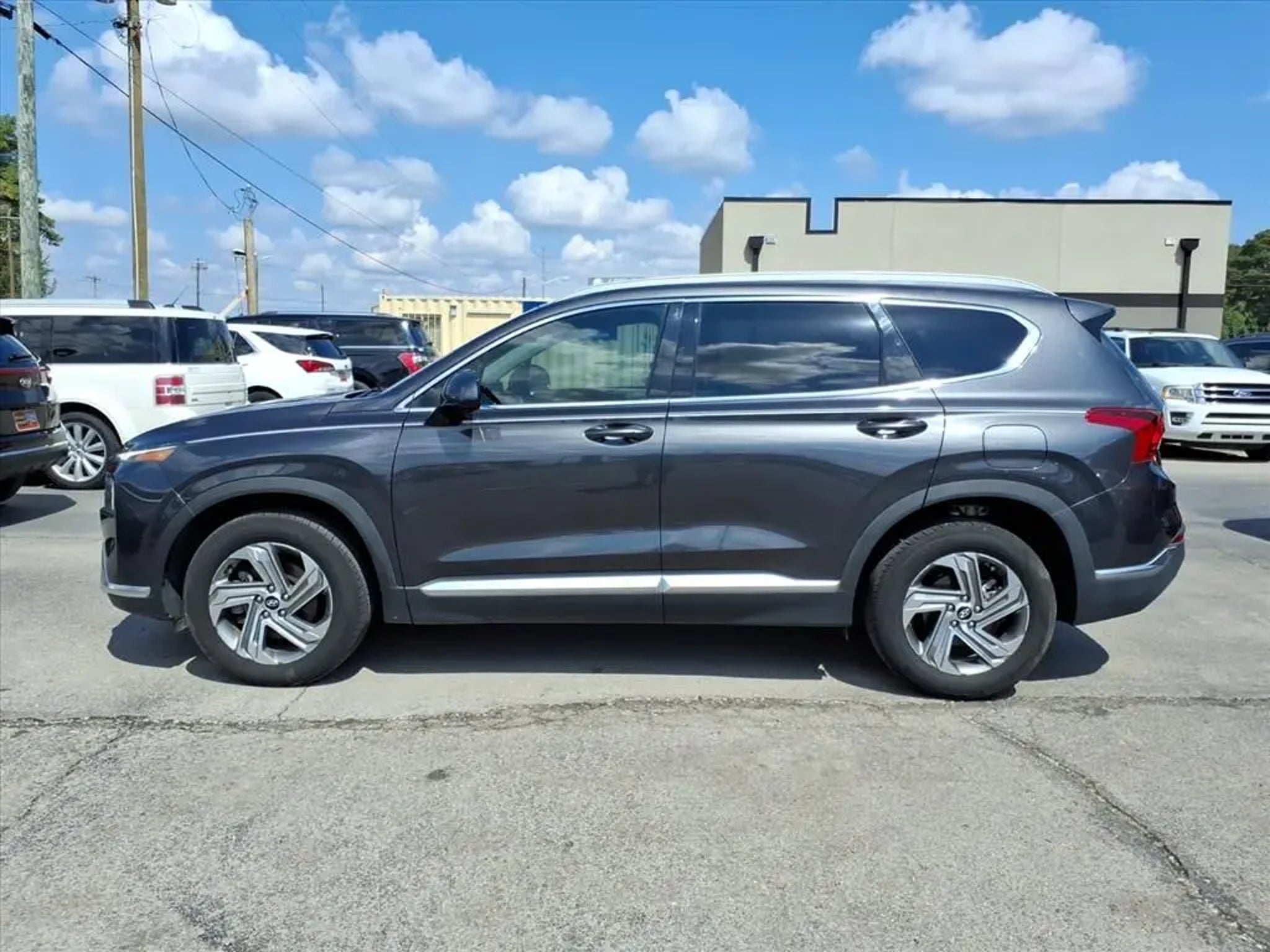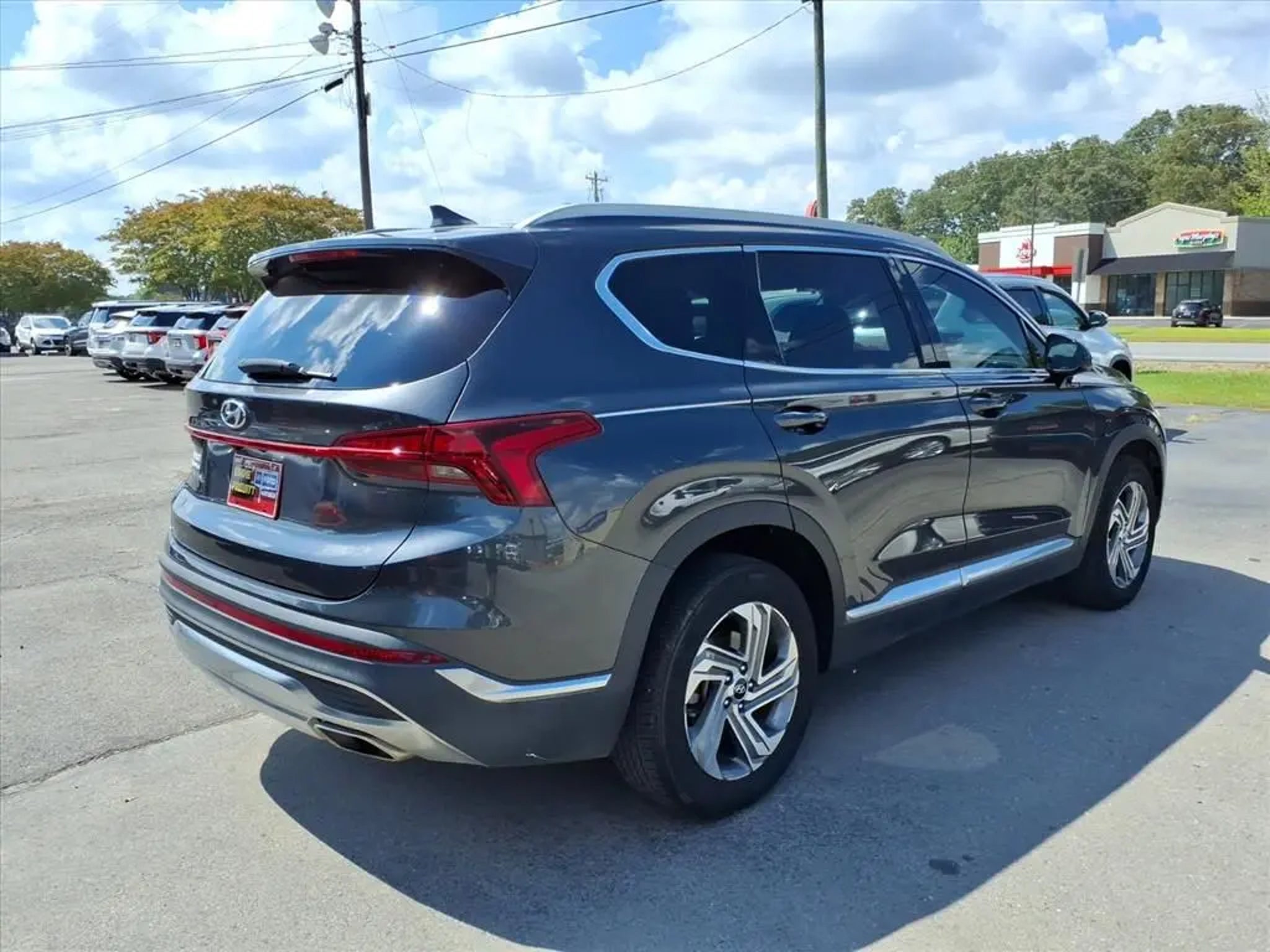 This 2021 Hyundai Santa Fe SEL 8-Speed Automatic with SHIFTRONIC is equipped with Option Group 01, 18 x 7.5J Alloy Wheels, 4-Wheel Disc Brakes, 6 Speakers, ABS brakes, Air Conditioning, Alloy wheels, AM/FM radio: SiriusXM, Apple CarPlay & Android Auto, Auto High-beam Headlights, Axle Ratio: 3.798, Brake assist, Bumpers: body-color, Cargo Cover/Screen, Carpeted Floor Mats, Delay-off headlights, Driver door bin, Driver vanity mirror, Dual front impact airbags, Dual front side impact airbags, Electronic Stability Control, Emergency communication system, Exterior Parking Camera Rear, Four wheel independent suspension, Front anti-roll bar, Front Bucket Seats, Front Center Armrest, Front reading lights, Fully automatic headlights, Heated door mirrors, Heated Front Bucket Seats, Heated front seats, Illuminated entry, Low tire pressure warning, Occupant sensing airbag, Outside temperature display, Overhead airbag, Overhead console, Panic alarm, Passenger door bin, Passenger vanity mirror, Power door mirrors, Power driver seat, Power steering, Power windows, Radio: AM/FM/MP3 Display Audio, Rear anti-roll bar, Rear seat center armrest, Rear window defroster, Rear window wiper, Remote keyless entry, Security system, Speed control, Speed-sensing steering, Split folding rear seat, Spoiler, Steering wheel mounted audio controls, Tachometer, Telescoping steering wheel, Tilt steering wheel, Traction control, Trip computer, Variably intermittent wipers, and YES Essentials Stain-Resistant Cloth Seat Trim.