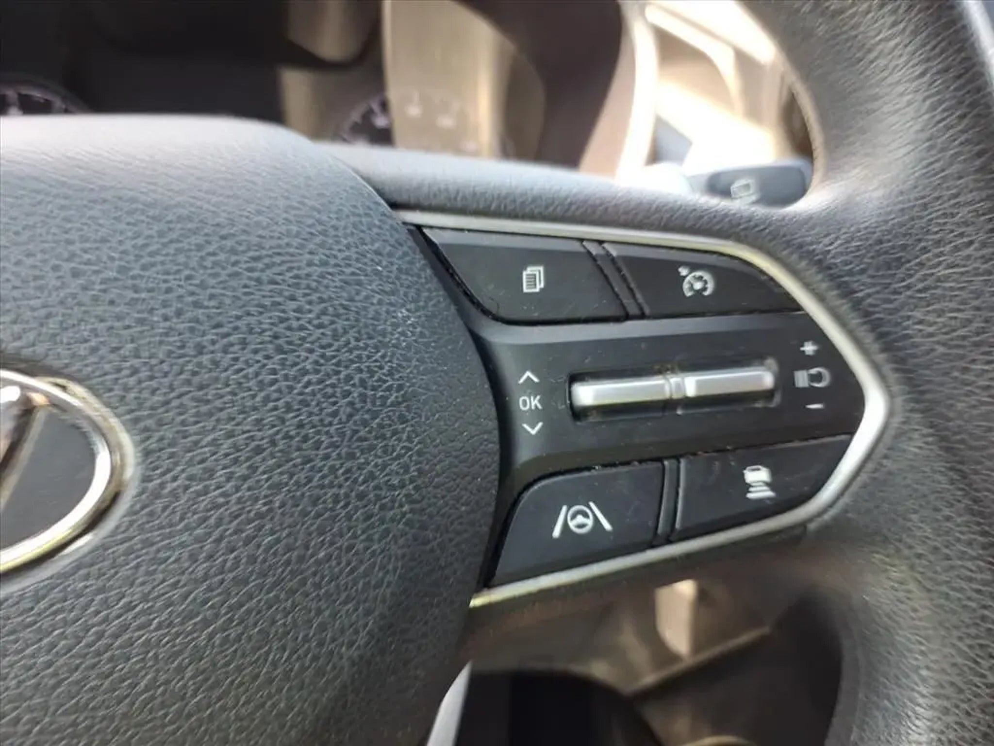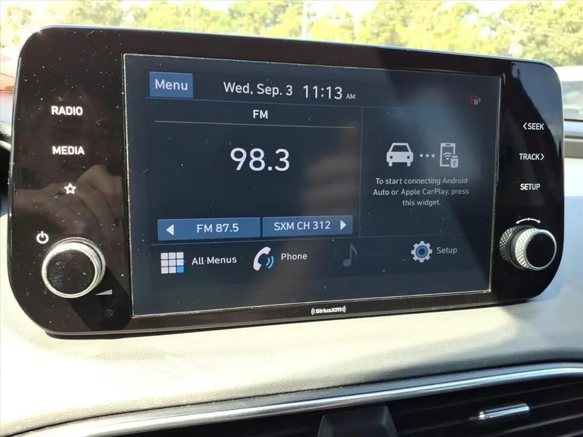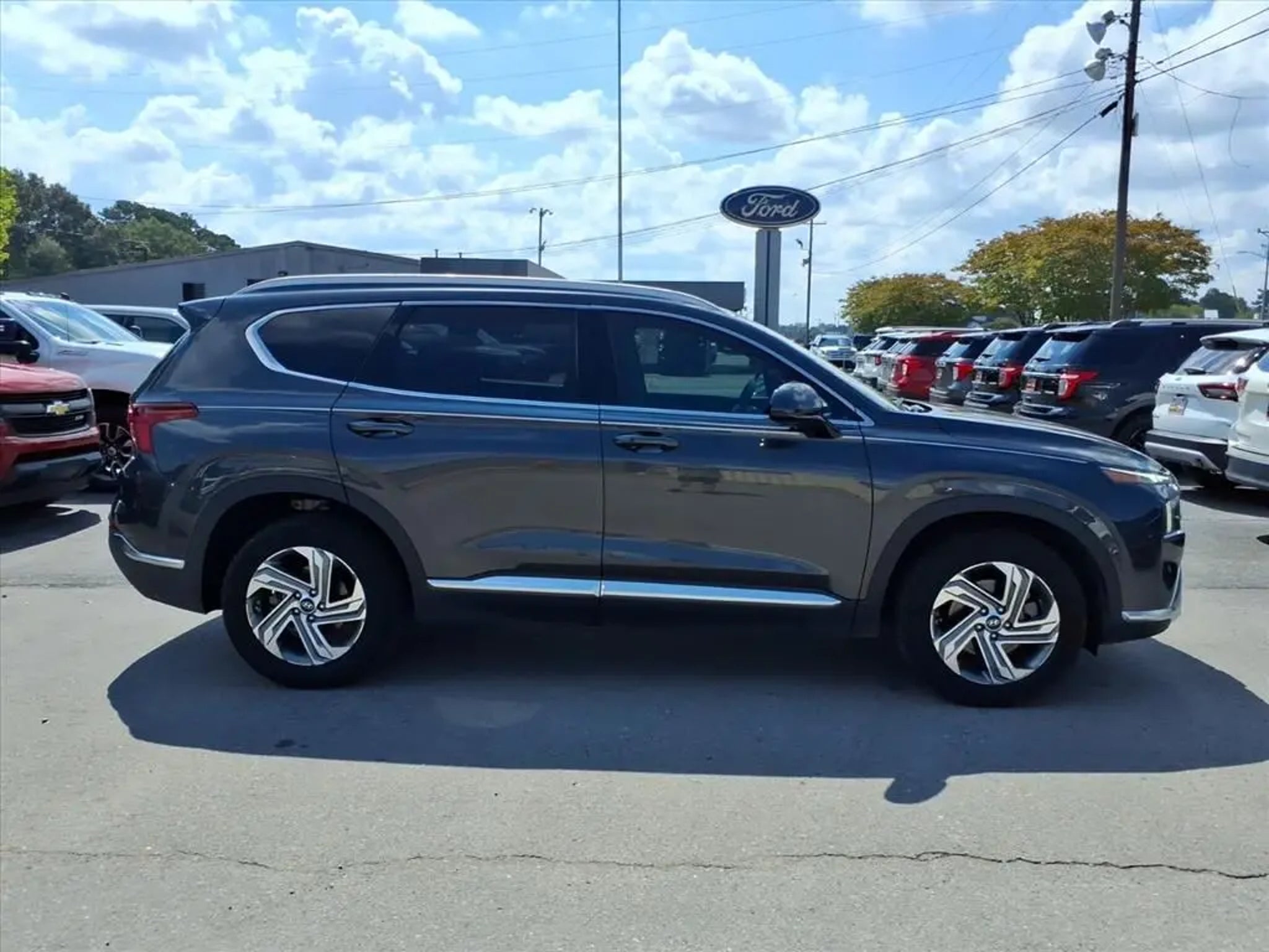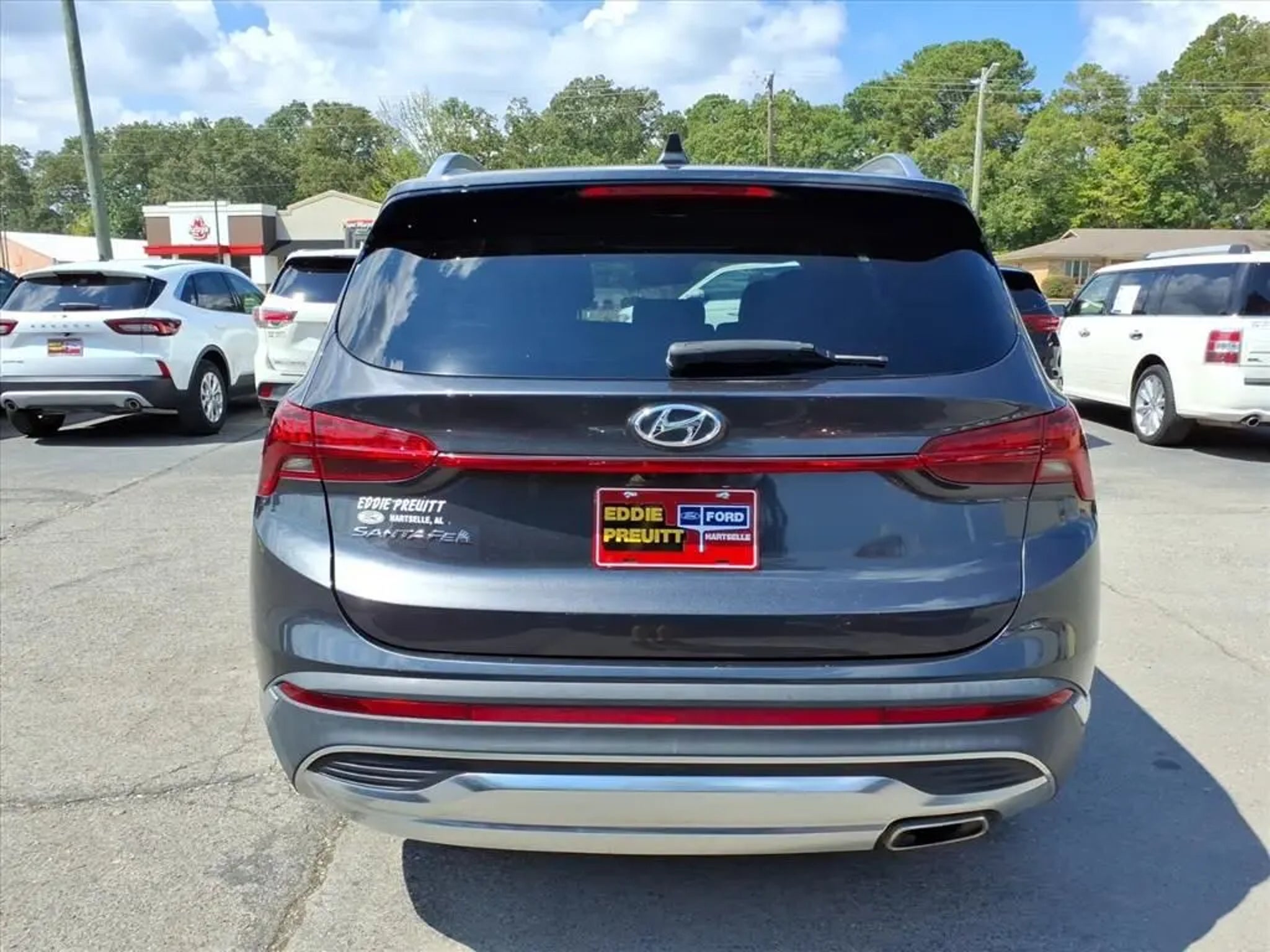 This 2021 Hyundai Santa Fe SEL 8-Speed Automatic with SHIFTRONIC is equipped with Option Group 01, 18 x 7.5J Alloy Wheels, 4-Wheel Disc Brakes, 6 Speakers, ABS brakes, Air Conditioning, Alloy wheels, AM/FM radio: SiriusXM, Apple CarPlay & Android Auto, Auto High-beam Headlights, Axle Ratio: 3.798, Brake assist, Bumpers: body-color, Cargo Cover/Screen, Carpeted Floor Mats, Delay-off headlights, Driver door bin, Driver vanity mirror, Dual front impact airbags, Dual front side impact airbags, Electronic Stability Control, Emergency communication system, Exterior Parking Camera Rear, Four wheel independent suspension, Front anti-roll bar, Front Bucket Seats, Front Center Armrest, Front reading lights, Fully automatic headlights, Heated door mirrors, Heated Front Bucket Seats, Heated front seats, Illuminated entry, Low tire pressure warning, Occupant sensing airbag, Outside temperature display, Overhead airbag, Overhead console, Panic alarm, Passenger door bin, Passenger vanity mirror, Power door mirrors, Power driver seat, Power steering, Power windows, Radio: AM/FM/MP3 Display Audio, Rear anti-roll bar, Rear seat center armrest, Rear window defroster, Rear window wiper, Remote keyless entry, Security system, Speed control, Speed-sensing steering, Split folding rear seat, Spoiler, Steering wheel mounted audio controls, Tachometer, Telescoping steering wheel, Tilt steering wheel, Traction control, Trip computer, Variably intermittent wipers, and YES Essentials Stain-Resistant Cloth Seat Trim.