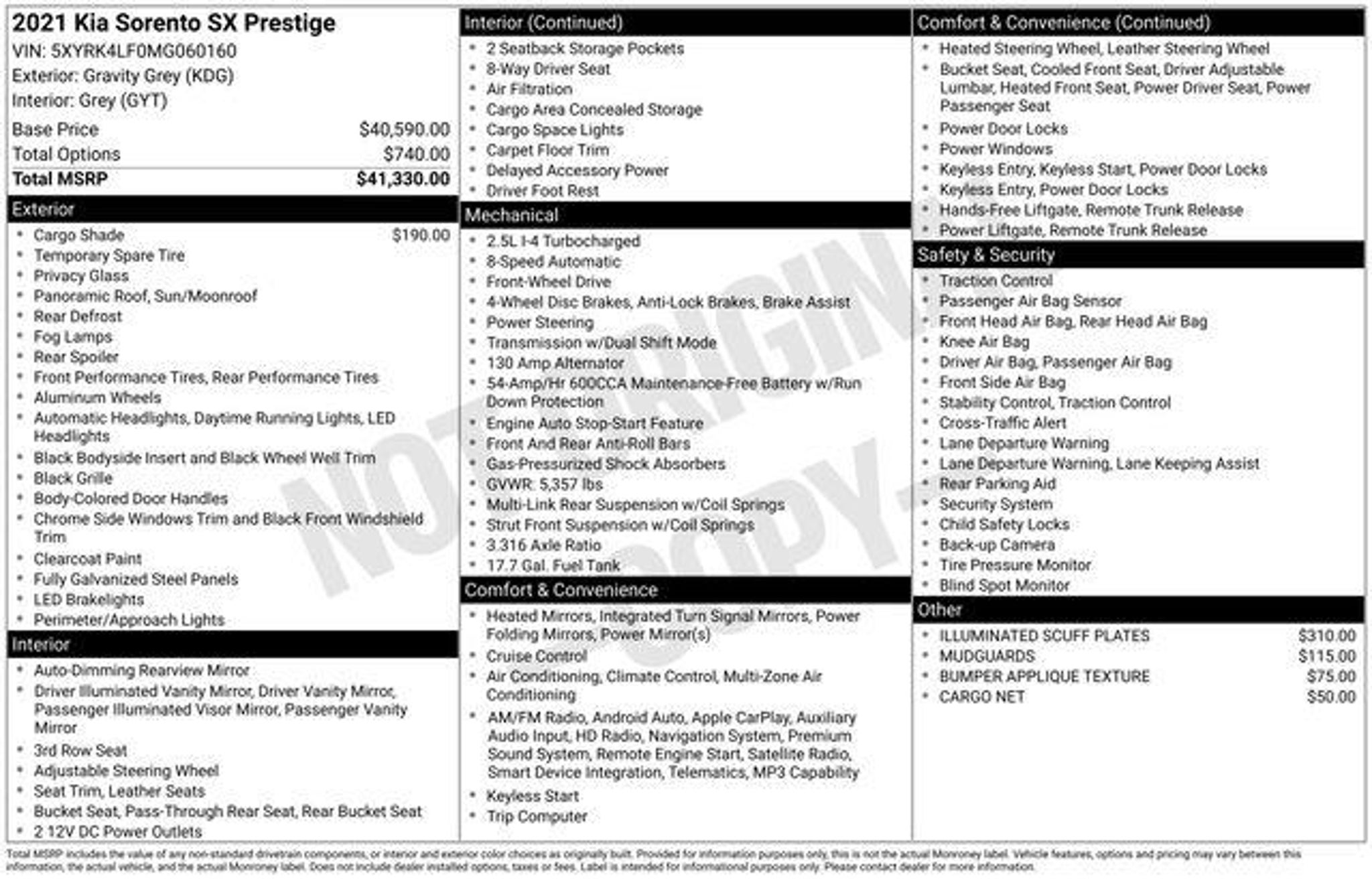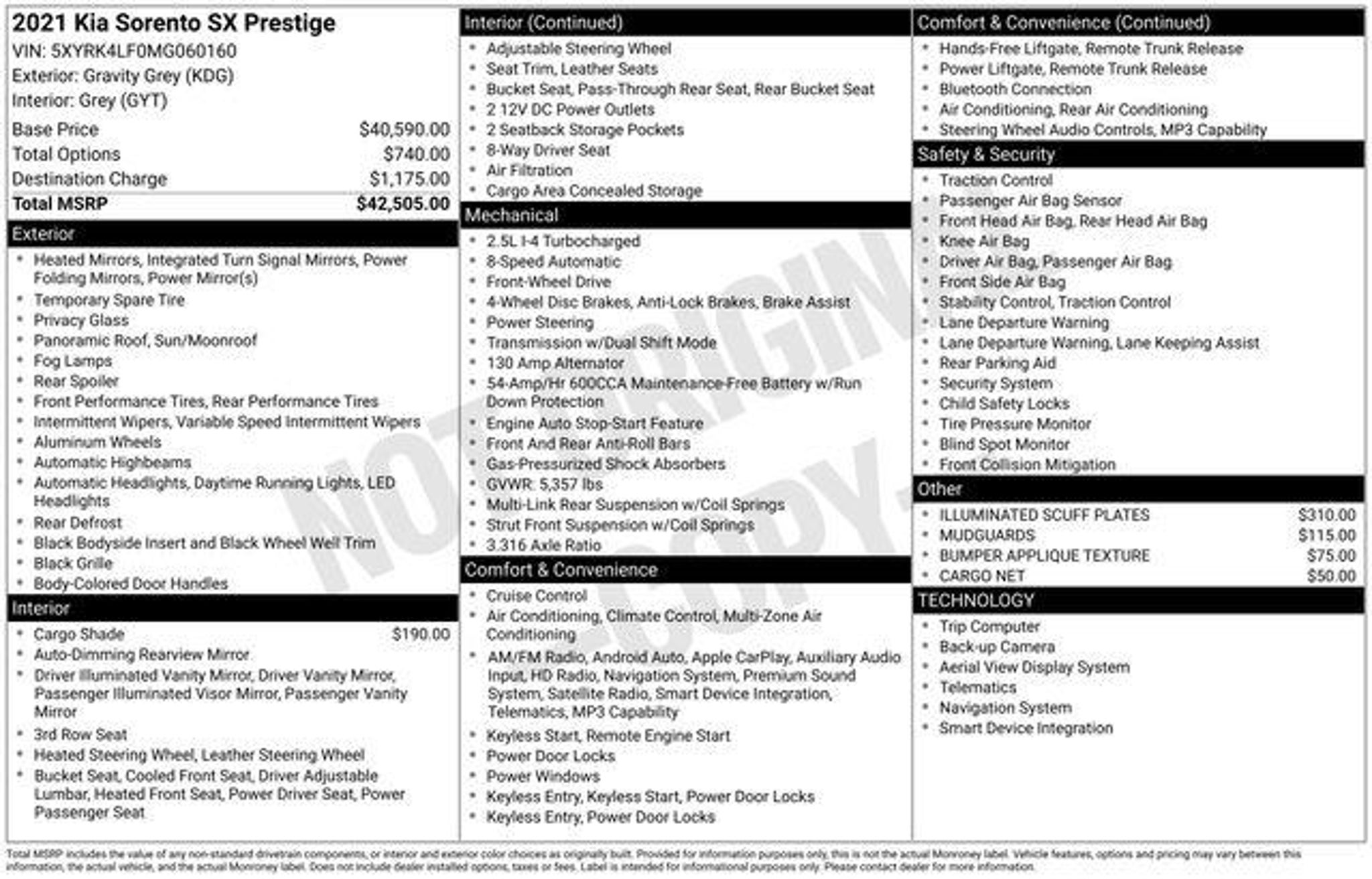 Welcome to Chuck Stevens Ford, located at 1304 HWY 31 South, Bay Minette, Alabama. We are proud to celebrate 25 Years of serving our community as one of the fastest-growing Ford dealers in the Southeast. Our goal is to make your shopping experience transparent, easy, and enjoyable. Every Pre-Owned and Certified vehicle at Chuck Stevens Ford has been fully inspected and reconditioned by a certified technician, giving you confidence in your purchase. Take advantage of our low-price guarantee on this 2021 Kia Sorento. This Sorento comes finished in Gravity Gray with a Grey interior, making it a fantastic choice for your next vehicle. At Chuck Stevens Ford, we also include our exclusive Lifetime Powertrain Warranty at no additional cost. No gimmicks, no fine print, and serviceable at any certified repair facility nationwide. The online price includes a $2,500 Cash Down or trade equity. To qualify, customers must trade in a vehicle with a minimum appraised value of $2,500 or Cash Down. All prices reflect dealership financing and include a $1,000 finance coupon. See dealer for full details. . Clean CARFAX. Priced below KBB Fair Purchase Price! Odometer is 24032 miles below market average! 22/29 City/Highway MPG 2021 Kia Sorento SX-Prestige 4D Sport Utility SX-Prestige Gravity Gray FWD 2.5L I4 DGI Turbocharged DOHC 16V LEV3-ULEV70 281hp 8-Speed DCT 3rd row seats: split-bench, Alloy wheels, Apple CarPlay & Android Auto, Automatic temperature control, Emergency communication system: UVO link, Front dual zone A/C, Front fog lights, Fully automatic headlights, Heated front seats, Perforated Genuine Leather Seat Trim, Power moonroof, Radio: AM/FM Bose Audio System w/Navigation, Smart Key w/ Push Button and Remote Start, Split folding rear seat, Steering wheel mounted audio controls, Telescoping steering wheel, Tilt steering wheel, Ventilated front seats, Wheels: 20 Gloss Black Alloy. LIFETIME POWERTRAIN PROGRAM included at no additional charge for all vehicles that have less than 80,000 miles. It is one of the most comprehensive powertrain warranty programs in the market. See dealer for details. Please don't buy anywhere until you have us show you our deal.