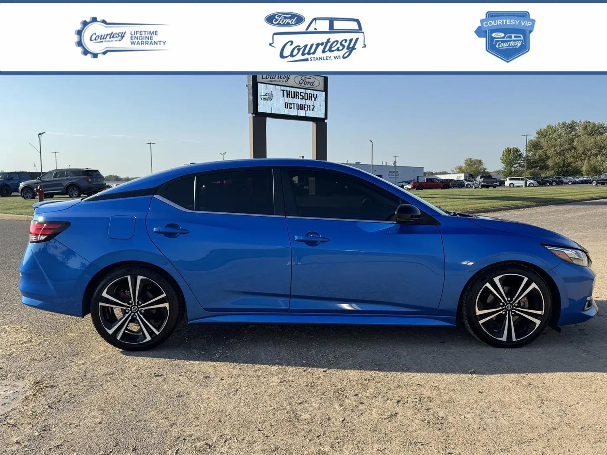 2021 Nissan Sentra SR Electric Blue Metallic is Certified, and we would love the opportunity to speak more about the advantages of our certification. Please reference 14960C and call us at . Why Buy From Courtesy Auto & Truck Center, Inc. VIP Pricing representspremium quality of service tothe customer. With all premium,economy, and utility brands thecustomer has a guarantee theycan lean on."¢ Custom vehicle ordering and delivery"¢ Service pick-up and drop-off"¢ Mobile service vehicle"¢ Courtesy vehicle or shuttle"¢ Rewards program for service New Vehicles (under factory warranty)Lifetime Engine Limited Warranty. 1-Year Zurich Shield Limited Warranty. Courtesy Certified (under 85,000 miles)Lifetime Engine Limited Warranty 1-Year Zurich Shield Limited Warranty Courtesy Certified (85,001-100,000 miles)6-Month/6,000 Mile Limited Warranty 1-Year Zurich Shield Limited Warranty *Some exclusions apply. See dealer for details. *Some exclusions apply.This Limited Warranty does not provide coverage if your vehicle:A. Is equipped to plow snow, whether or not the plow blade is attached to your vehicle.B. Is used for commercial hauling, delivery, or limousine service.C. Is used for hauling or towing in excess of the manufacturer's limitations and specifications.D. Is used for rental, racing, speed contest or other competiton, police car, security vehicle, emergency vehicle, shuttle service, taxi or commercial towing.E. Has been declared a total loss or has been inssued a salvaged or branded title. *needs to be less that 15 years old and under 85k miles. All internally lubricated parts contained within the engine block and cylinder head(s). Cylinder head, engine block. and rotor housings when damaged as a result of the failure of a covered internally lubricated part. Coolant, fluids, lubricants, and filters when required in connection with the repair and replacement of a covered part. Important Package Information Safety and Security The vehicle is equipped with a system that senses, and then prepares, the vehicle and/or occupants, for an impending forward collision. The vehicle constantly monitors the roadway in front of the vehicle and identifies and tracks pedestrians on an interior display. If the system determines a likely impact, it will automatically take preventative steps to avoid hitting the pedestrian. The vehicle constantly monitors the roadway in front of the vehicle and identifies and tracks pedestrians on an interior display. If the system determines a likely impact, it will automatically take preventative steps to avoid hitting the pedestrian. The vehicle is equipped with a camera that displays an image of the area behind the vehicle on an interior display. Technology and Telematics Without the need for a manufacturer specific app to be installed on the smart device, the vehicle infotainment system can access and control functions of a smart device physically plugged-into the vehicle. Our Dealership We look forward to doing business with you! Give us a call at and schedule a test drive. We are located at 409 Junction Avenue Stanley, WI 54768.
