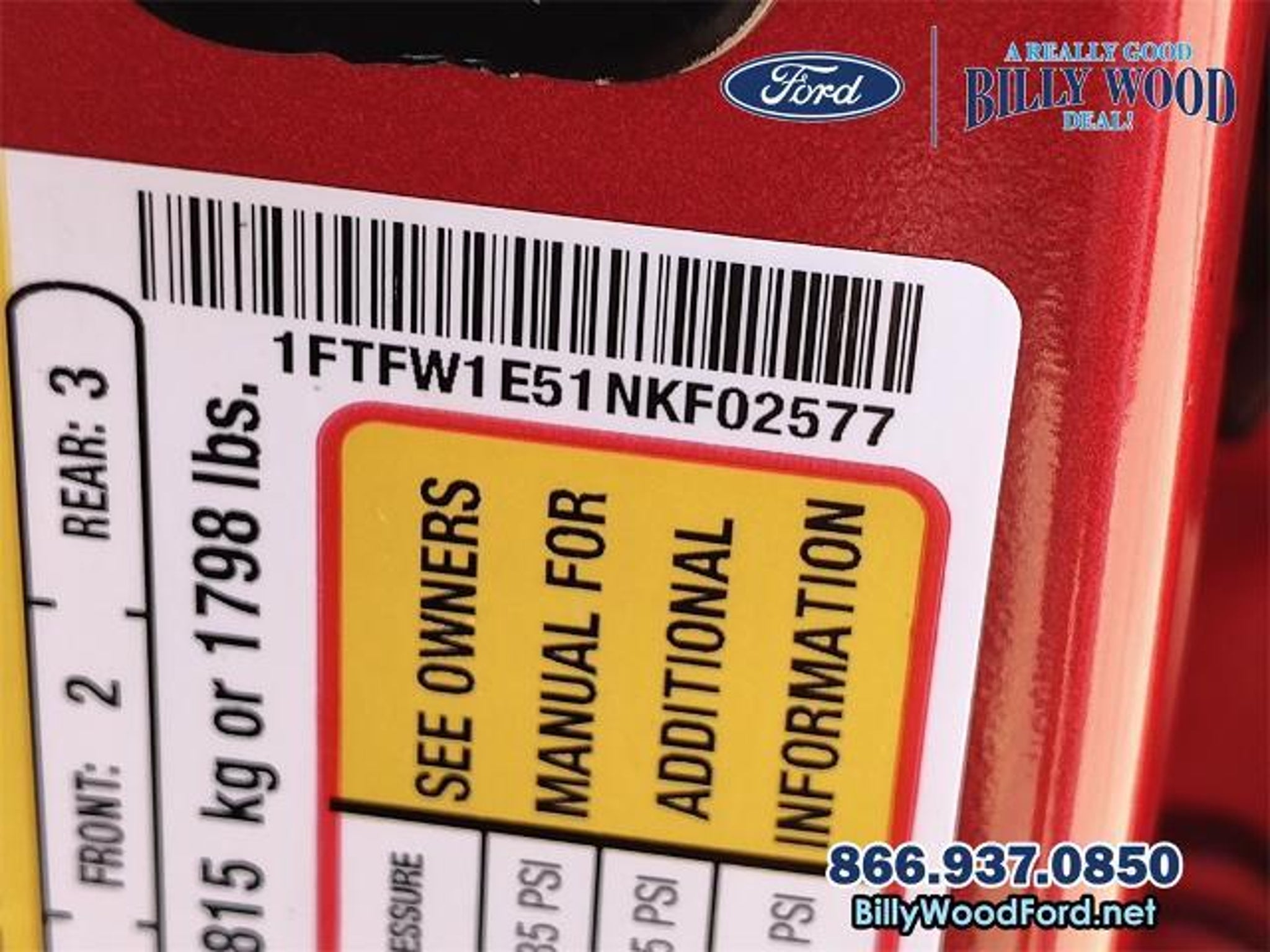 1 OWNER, 5.0 LITER V8, 10 SPEED AUTOMATIC TRANSMISSION, BANG AND OLUFSEN STEREO, FX4 OFF ROAD PACKAGE, LARIAT SPORT APPERANCE PACKAGE, TRAILER TOW PACKAGE, 20 INCH PREMIUM ALLOY WHEELS, POWERED HEATED FRONT SEATS, MUCH MORE, SEE LIST BELOW FOR A COMPLETE LIST OF FEATURES SEE LIST BELOW Billy Wood Ford is proud to offer this reliable 2022 Ford F-150 in Rapid Red Metallic Tinted Clearcoat This vehicle has passed our comprehensive 160 point inspection with flying colors and comes with the following features; Equipment Group 501A Mid (Onboard 400W Outlet, Radio: B&O Sound System by Bang & Olufsen, and Universal Garage Door Opener), FX4 Off-Road Package (Tray Style Floor Liner (47W)), Lariat Sport Appearance Package (Accent-Color Angular Step Bars, Body-Color Front & Rear Bumpers, Box Side Decals, Chrome Single-Tip Exhaust, Dark 2-Bar & 1 Minor Bar Style Grille, and Wheels: 18 6-Spoke Machined Aluminum), Trailer Tow Package (Class IV Trailer Hitch Receiver, Integrated Trailer Brake Controller, and Pro Trailer Backup Assist), 4WD, 18 Machined-Aluminum Wheels, 4-Wheel Disc Brakes, 7 Speakers, ABS brakes, Adjustable pedals, Air Conditioning, Alloy wheels, AM/FM radio: SiriusXM with 360L, Auto High-beam Headlights, Auto Start-Stop Removal, Auto-dimming door mirrors, Auto-dimming Rear-View mirror, Automatic temperature control, Brake assist, Bumpers: chrome, Compass, Connected Navigation & SiriusXM w/360L Removal, Delay-off headlights, Driver door bin, Driver vanity mirror, Dual front impact airbags, Dual front side impact airbags, Electronic Stability Control, Emergency communication system: SYNC 4 911 Assist, Extended Range 36 Gallon Fuel Tank, Exterior Parking Camera Rear, Front anti-roll bar, Front Center Armrest w/Storage, Front dual zone A/C, Front fog lights, Front reading lights, Front wheel independent suspension, Fully automatic headlights, Heated door mirrors, Heated front seats, Illuminated entry, Leather-Trimmed 40/20/40 Front Seat, Leather-Trimmed Bucket Seats, LED Sideview Mirror Spotlights, Low tire pressure warning, Memory seat, Occupant sensing airbag, Outside temperature display, Overhead airbag, Overhead console, Panic alarm, Passenger door bin, Passenger vanity mirror, Pedal memory, Power door mirrors, Power driver seat, Power passenger seat, Power steering, Power windows, Radio data system, Radio: AM/FM SiriusXM w/360L, Rear reading lights, Rear seat center armrest, Rear step bumper, Rear window defroster, Remote keyless entry, Security system, Speed control, Speed-sensing steering, Split fo