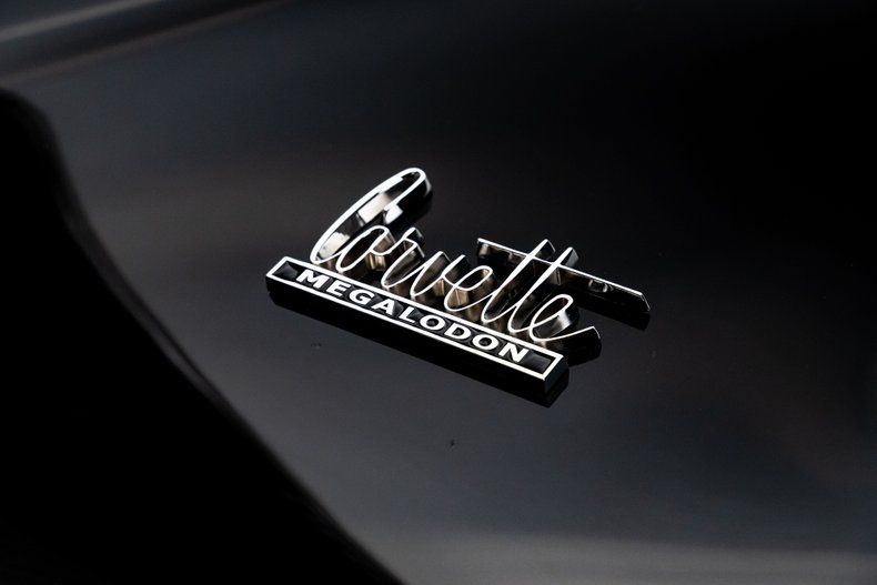 The exterior is as striking as it is meticulous. Deep black paint flows across every panel with a liquid gloss, accented by a bold red stinger hood that calls back to Corvette heritage. Chrome side pipes and Detroit Speed headlights bring jewel-like detail, while custom one-off 36-spoke turbine-style knock-off wheels measure 19 inches up front and 20 at the rear, wrapped in Michelin Pilot Sport 4S tires sized 245/40ZR19 and 345/30ZR20. Their design cleverly imitates classic redline rubber, giving the car a modernized period look that ties its heritage to its performance Even the badging has been reimagined. In place of the traditional Sting Ray script, the decklid wears a custom "Megalodon" emblem. Executed in factory style, it nods to the shark-inspired Mako Shark concept that preceded the C2, while giving this widebody a distinct identity of its own.