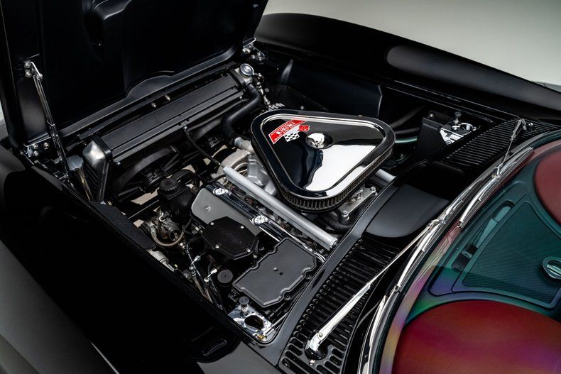 Beneath the hood lies a modern LS3 6.2L V8 rated at 495 horsepower. The engine has been cleverly dressed to resemble a period-correct 427, with polished valve covers, stainless headers, and a triangular Turbo-Jet air cleaner completing the illusion. It looks like a big block, but the reality is electronic fuel injection, stainless hardware, and bulletproof reliability. A Tremec TKX 5-speed manual transmission keeps the driver fully engaged, delivering smooth, modern shifting while channeling power to the rear wheels with confidence.