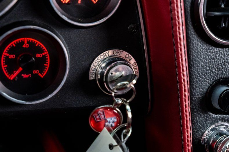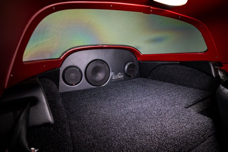 Inside, the car combines heritage with refinement. Upholstery by Steve Holcomb wraps the cabin in rich red leather with black suede inserts, covering the seats, dash, console, and custom panels. The seats provide bolstered modern comfort, while Dakota Digital gauges preserve factory styling with updated function. A period-correct Antique Automobile Radio head unit hides modern Bluetooth connectivity, paired with an Alpine amplifier and modern speakers for high-quality sound. Vintage Air climate control ensures comfort in any weather, while dimmable LED ambient lighting adds a modern touch that enhances the cabin's atmosphere. Above, a custom alcantara headliner with leather-wrapped sunvisors adds an extra layer of detail. Every surface has been tailored with precision, and even the doors close with the solid, confident sound of a modern luxury car.