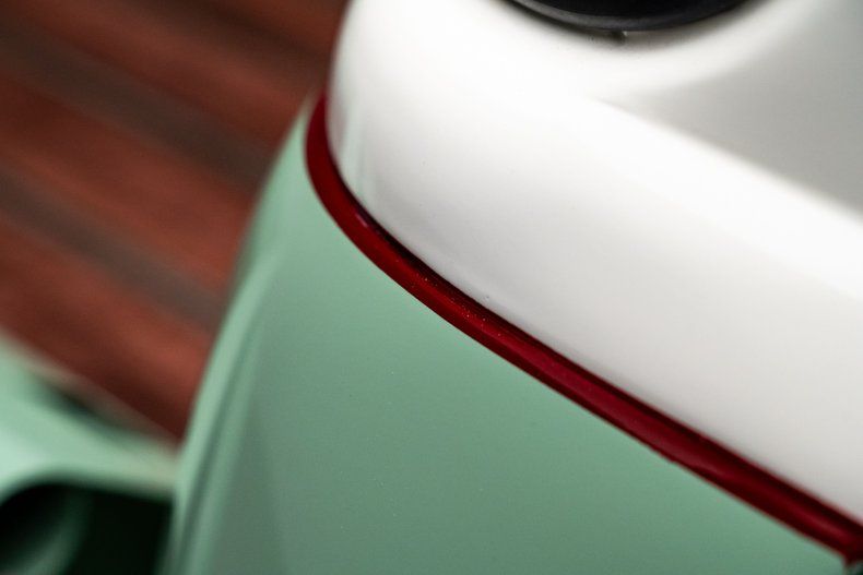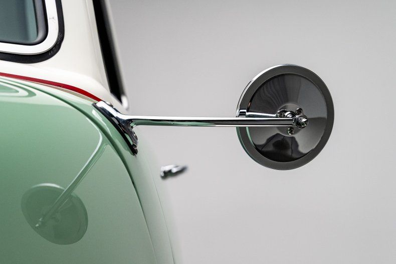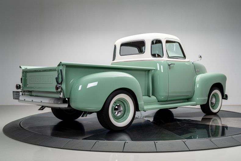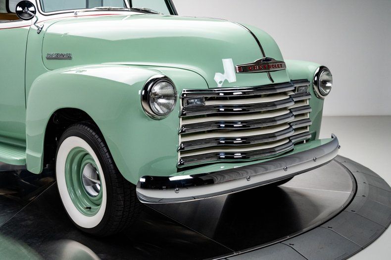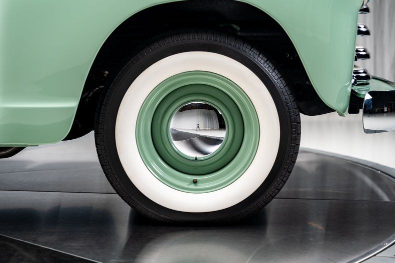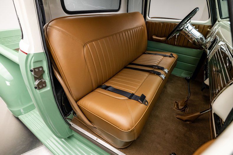 Finished in a classic mint green and cream two-tone with a hand-painted red beltline stripe, the truck's bodywork keeps every defining line of the original design intact. The desirable 5-window cab adds curved corner glass that improves visibility and gives the truck its signature wraparound profile, making it one of the more collectible configurations in the Advance Design lineup. The rounded fenders, divided windshield, and signature five-bar chrome grille instantly read "1950s Chevrolet," but the execution here is show-quality throughout. Polished bumpers and trim shine like new, and the proportions sit just right over painted 15-inch steel wheels and wide whitewall BF Goodrich Radial T/As. The bed features an aluminum floor finished to resemble fine-grain wood, blending tradition with clever modern craftsmanship. Every panel fits cleanly, every surface is dialed-in, and the result is a presentation that looks factory fresh while clearly built to a higher standard.