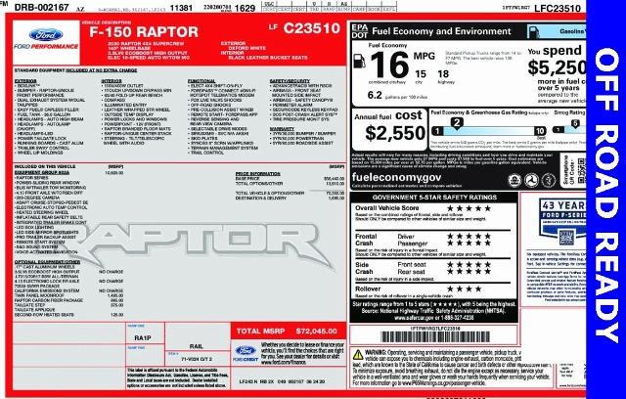 Oxford White 2020 Ford F-150 Raptor 4WD 10-Speed Automatic 3.5L V6 EcoBoost 4WD, 10-Way Power Driver & Passenger Seats, 360 Degree Camera, 4.10 Front Axle w/Torsen Differential, 8 Productivity Screen, Adaptive Cruise Control w/Stop-and-Go, Advanced Security Pack, Ambient Lighting - Ice Blue Color Only, BLIS Blind Spot Information System, Dual-Zone Electronic Automatic Temperature Control, Electronic Locking w/4.10 Axle Ratio, Equipment Group 802A Luxury, GVWR: 7,050 lbs Payload Package, Heated & Ventilated Leather 40/Console/40 Front Seats, Heated Steering Wheel, Heated Windshield Wiper Park, Inflatable Rear Safety Belts, Integrated Trailer Brake Controller, Intelligent Access w/Push-Button Start, Lane Keeping System, LED Box Lighting, LED Sideview Mirror Spotlights, Memory System (Seat, Pedal, Exterior Mirror), Power Glass Sideview Mirr w/Body-Color Skull Caps, Power Tilt/Telescoping Steering Column w/Memory, Power-Adjustable Pedals, Power-Sliding Rear Window, Pro Trailer Backup Assist, Radio: B&O Sound System by Bang & Olufsen, Raptor Carbon Fiber Package, Remote Start System w/Remote Tailgate Release, SYNC 3, Tailgate Applique FORD, Unique High Gloss Black Carbon Fiber Shift Knob, Universal Garage Door Opener, Voice-Activated Touchscreen Navigation. Priced below KBB Fair Purchase Price! At Ludington Ford, we pride ourselves on offering the best reconditioned vehicles at competitive prices. Our commitment to excellence doesn't stop at the sale. We believe in building lasting relationships with our customers by providing exceptional after-sale service. Our mission is to take care of you long after you drive off our lot. With our dedicated service team, we ensure your vehicle remains in top condition. For our local customers, we offer convenient pick-up and delivery services, making it easier than ever to maintain your vehicle without disrupting your schedule. Experience the Ludington Ford differenceâwhere quality vehicles meet outstanding customer care. Visit us today! Awards: * JD Power Vehicle Dependability Study