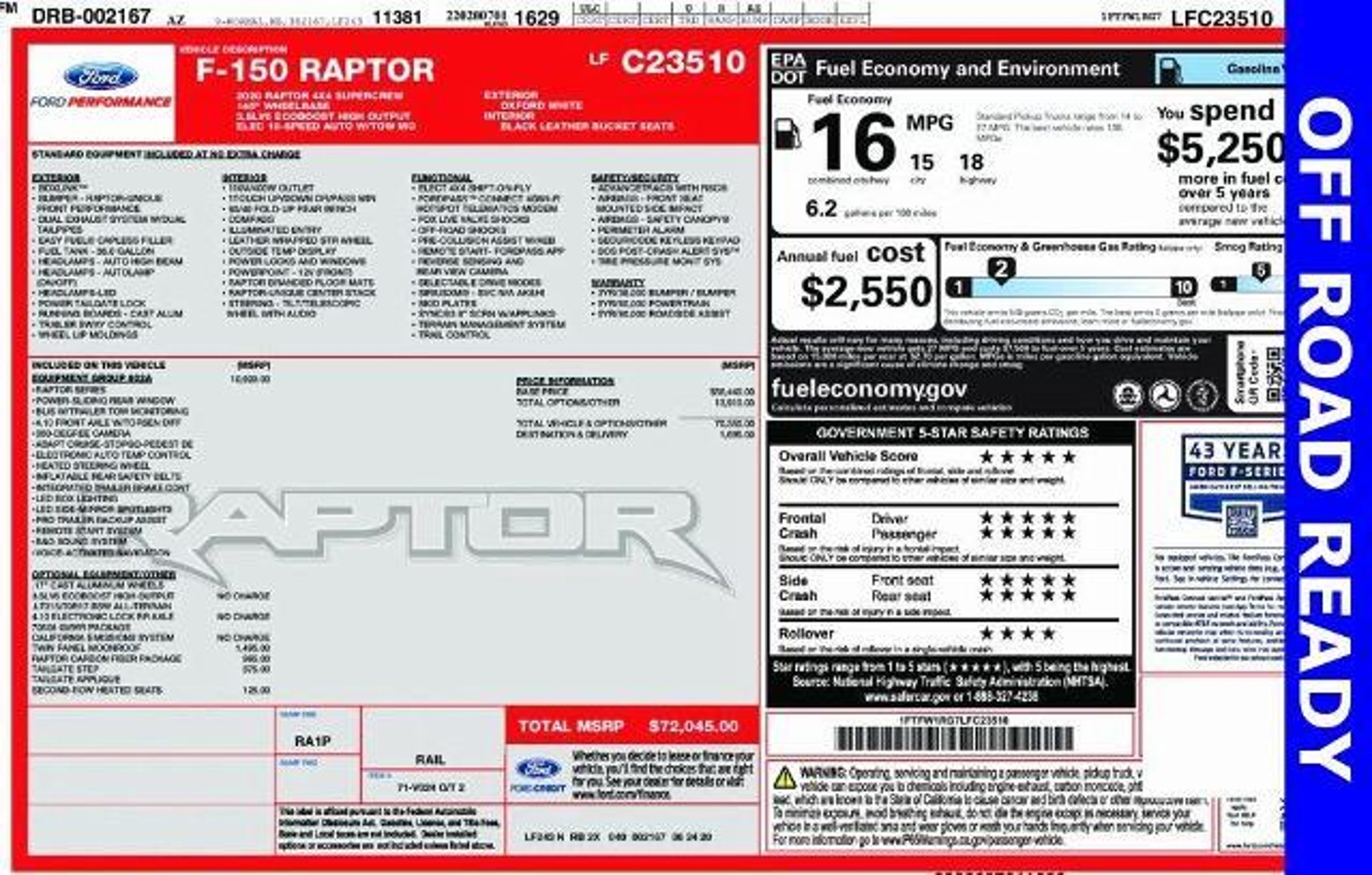 Oxford White 2020 Ford F-150 Raptor 4WD 10-Speed Automatic 3.5L V6 EcoBoost 4WD, 10-Way Power Driver & Passenger Seats, 360 Degree Camera, 4.10 Front Axle w/Torsen Differential, 8 Productivity Screen, Adaptive Cruise Control w/Stop-and-Go, Advanced Security Pack, Ambient Lighting - Ice Blue Color Only, BLIS Blind Spot Information System, Dual-Zone Electronic Automatic Temperature Control, Electronic Locking w/4.10 Axle Ratio, Equipment Group 802A Luxury, GVWR: 7,050 lbs Payload Package, Heated & Ventilated Leather 40/Console/40 Front Seats, Heated Steering Wheel, Heated Windshield Wiper Park, Inflatable Rear Safety Belts, Integrated Trailer Brake Controller, Intelligent Access w/Push-Button Start, Lane Keeping System, LED Box Lighting, LED Sideview Mirror Spotlights, Memory System (Seat, Pedal, Exterior Mirror), Power Glass Sideview Mirr w/Body-Color Skull Caps, Power Tilt/Telescoping Steering Column w/Memory, Power-Adjustable Pedals, Power-Sliding Rear Window, Pro Trailer Backup Assist, Radio: B&O Sound System by Bang & Olufsen, Raptor Carbon Fiber Package, Remote Start System w/Remote Tailgate Release, SYNC 3, Tailgate Applique FORD, Unique High Gloss Black Carbon Fiber Shift Knob, Universal Garage Door Opener, Voice-Activated Touchscreen Navigation. Priced below KBB Fair Purchase Price! At Ludington Ford, we pride ourselves on offering the best reconditioned vehicles at competitive prices. Our commitment to excellence doesn't stop at the sale. We believe in building lasting relationships with our customers by providing exceptional after-sale service. Our mission is to take care of you long after you drive off our lot. With our dedicated service team, we ensure your vehicle remains in top condition. For our local customers, we offer convenient pick-up and delivery services, making it easier than ever to maintain your vehicle without disrupting your schedule. Experience the Ludington Ford differenceâwhere quality vehicles meet outstanding customer care. Visit us today! Awards: * JD Power Vehicle Dependability Study