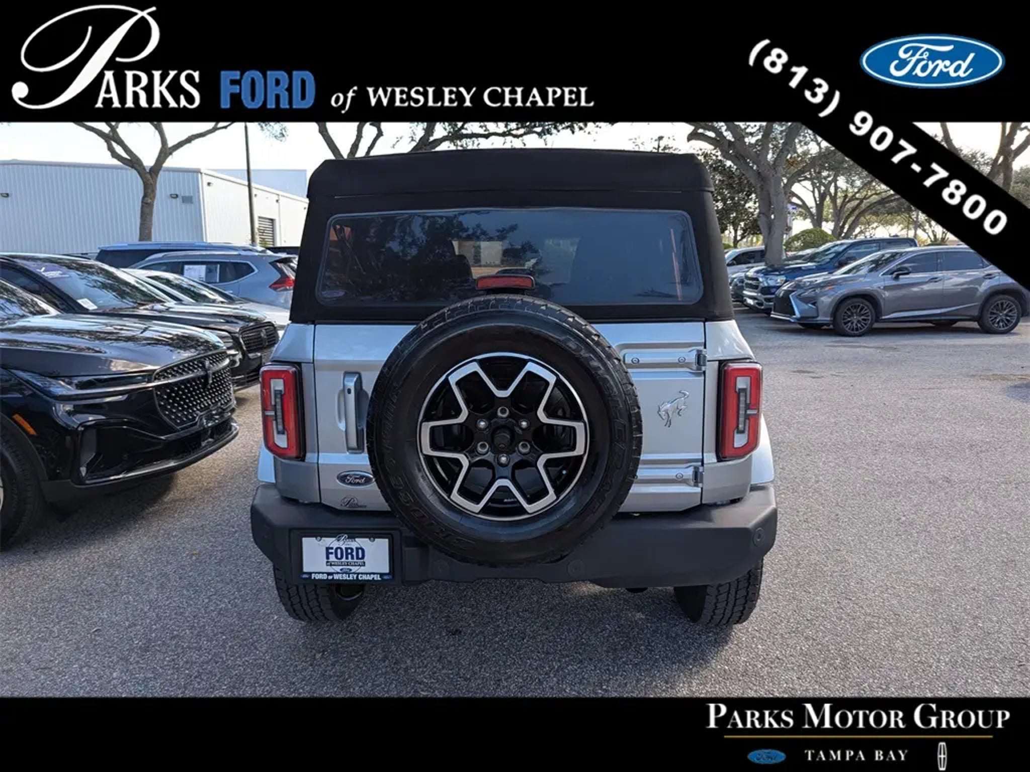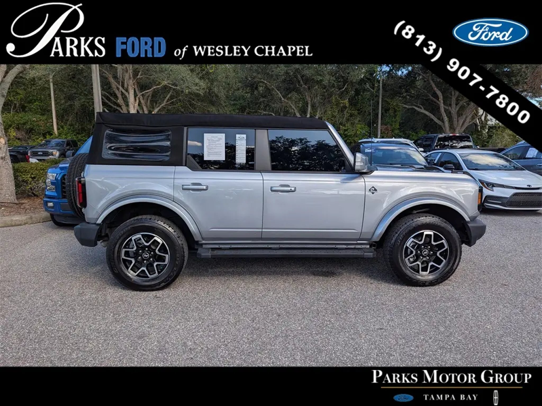 Finished in Iconic Silver Metallic, this 2023 Ford Bronco Outer Banks Advanced combines refined styling, impressive off-road capability, and the modern tech features that make it a standout choice for life around Wesley Chapel, Carrollwood, and Tampa Bay. With just 13,777 miles and Ford Blue Advantage Gold Certification, it feels exceptionally fresh and well cared for. The High Package, 12 touchscreen, 360-degree camera, leather-trim/vinyl Roast/Black seating, and 2.7L EcoBoost engine give this Bronco the ideal balance of daily comfort and weekend versatility. Power comes from the 2.7L EcoBoost V6, delivering strong torque that makes merging, passing, and highway travel confident and responsive. Paired with the 10-speed automatic transmission and Ford's advanced terrain management system with multiple G.O.A.T. Modes, this Bronco adapts quickly to sand, rain, trails, and paved roads. The 4.27 rear locking differential, auxiliary switches, and 255/70R18 all-terrain tires elevate capability when exploring backroads or navigating uneven terrain. The independent front suspension and well-tuned steering contribute to a planted, composed feel on everyday commutes. The Outer Banks Advanced interior blends rugged functionality with upscale touches. Leather-trim/vinyl seating, dual-zone climate control, a digital 8 instrument cluster, keyless access, push-button start, and intuitive storage solutions create a comfortable and organized cabin. The soft top provides easy open-air flexibility, allowing you to enjoy the Florida weather with quick removal and re-installation. Thoughtful features like the tool kit for door/top removal, full-floor coverage, and practical powerpoints in both rows make the Bronco exceptionally user-friendly. Technology is anchored by SYNC 4 with Enhanced Voice Recognition, featuring a 12 LCD touchscreen that delivers crisp navigation, wireless Apple CarPlay, wireless Android Auto, 360-degree camera views, cloud-connected updates, and customizable screens. FordPass Connect adds Remote Start, vehicle location, health alerts, and a 4G Wi-Fi hotspot for up to 10 devices"”useful for families, trips, or on-the-go work. SiriusXM with 360L, multiple USB-A and USB-C ports in both rows, and seven-speaker audio make the daily drive connected and enjoyable. On the exterior, this Bronco features 18 machined black-painted aluminum wheels, LED lighting, fender tie-down hooks, body-color accents, heated mirrors, tow hooks, and the signature Bronco grille. The combination of iconic design and practical functionality gives it an upscale appearance whether parked in New Tampa, Land O' Lakes, or heading toward the Gulf Coast for a weekend outing. **Key Highlights** "¢ 2.7L EcoBoost V6 with 10-speed automatic transmission "¢ SYNC 4 with 12 touchscreen 360-degree camera Connected Navigation "¢ Leather-trim/vinyl seating, dual-zone climate, and soft top "¢ Outer Banks Advanced with High Package content "¢ FordPass Connect with Remote Start and 4G Wi-Fi hotspot "¢ FBA Gold Certified for enhanced benefits and peace of mind On the road, the Bronco Outer Banks feels solid, quiet, and unexpectedly refined for an off-road-capable SUV. The EcoBoost powertrain pulls strongly through the midrange, while the suspension absorbs bumps confidently over city streets and rougher terrain. Whether commuting across the Veterans Expressway or setting out for an adventure north of Dade City, this Bronco strikes a natural balance between trail ability and everyday comfort. Also included through Parks Plus: **Paint Protection, Door Edge & Cup Guards, and Cabin Sanitizer Antimicrobial Protectant**, adding long-term care and extra value to your ownership experience. **Why Parks Ford of Wesley Chapel** Drivers choose Parks Ford for our transparent out-the-door pricing, customer-first environment, award-winning service, and a no-pressure buying experience.