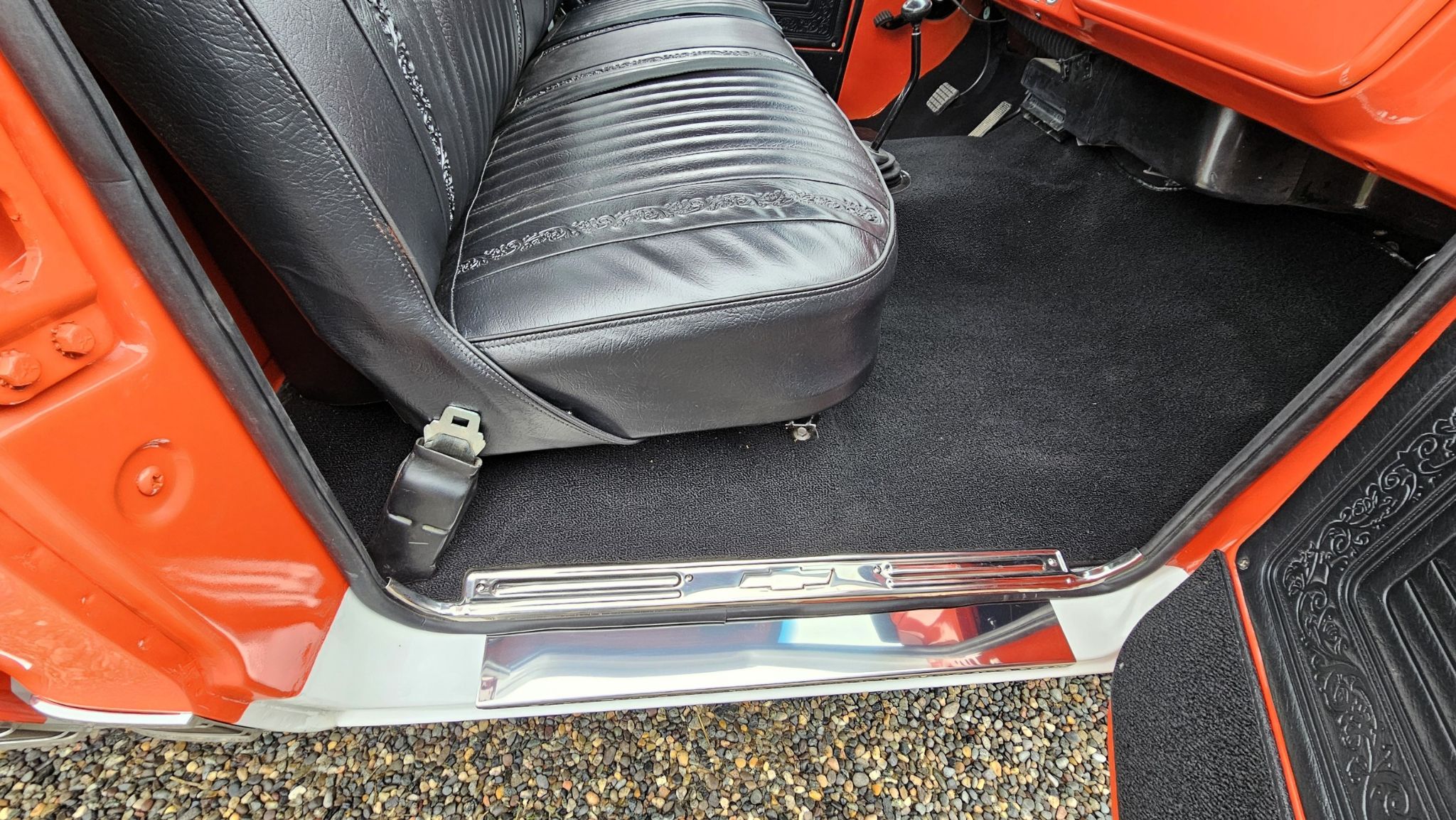 Interior: This truck does not have A/C, but the heat works great. New upholstery installed, new carpet, new dash pad, new steering wheel with the original steering column and new door panels. All the knobs are present and working, the gauges are original and all the interior chrome is new. There isn't a spare tire or jack present.