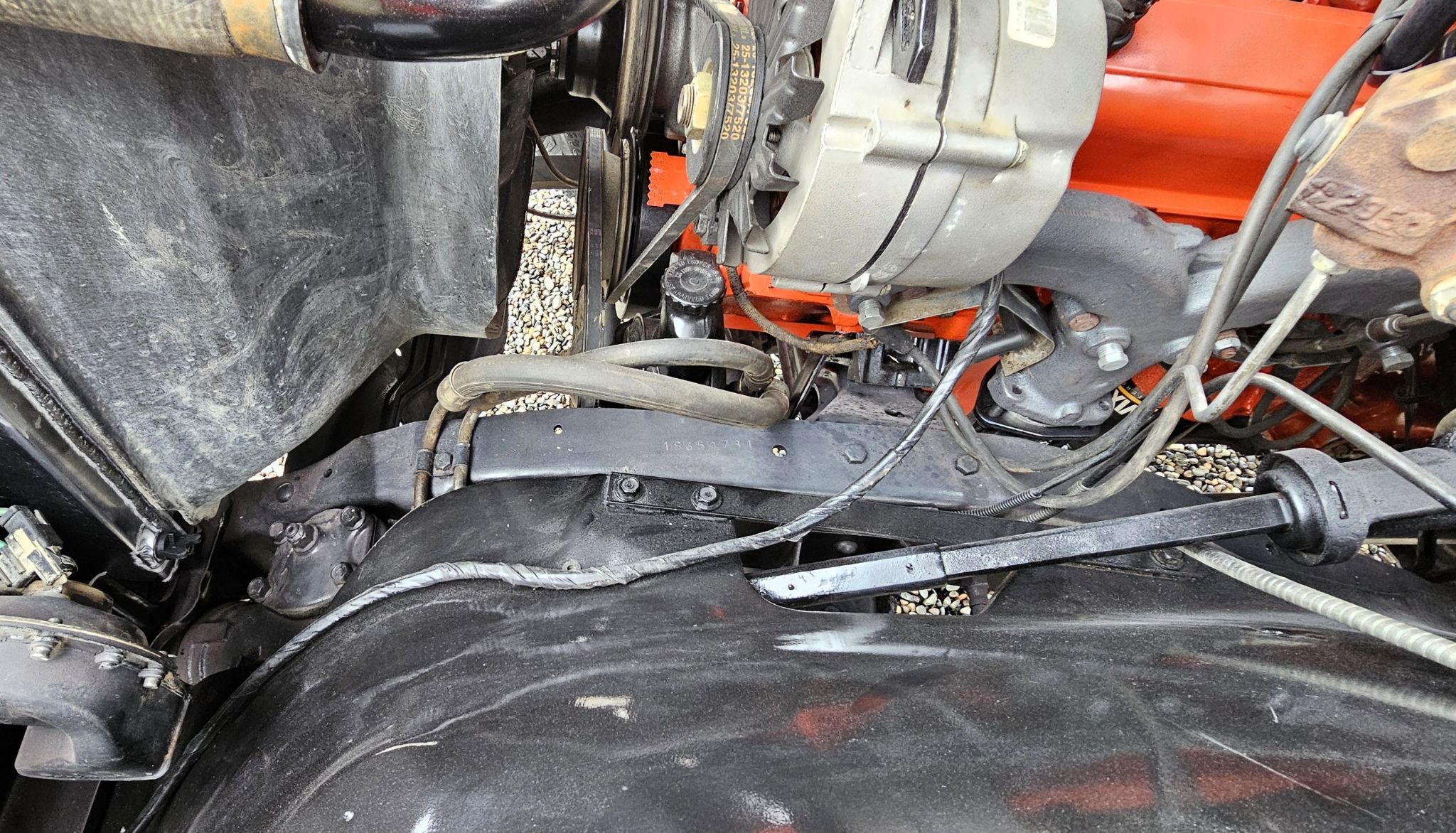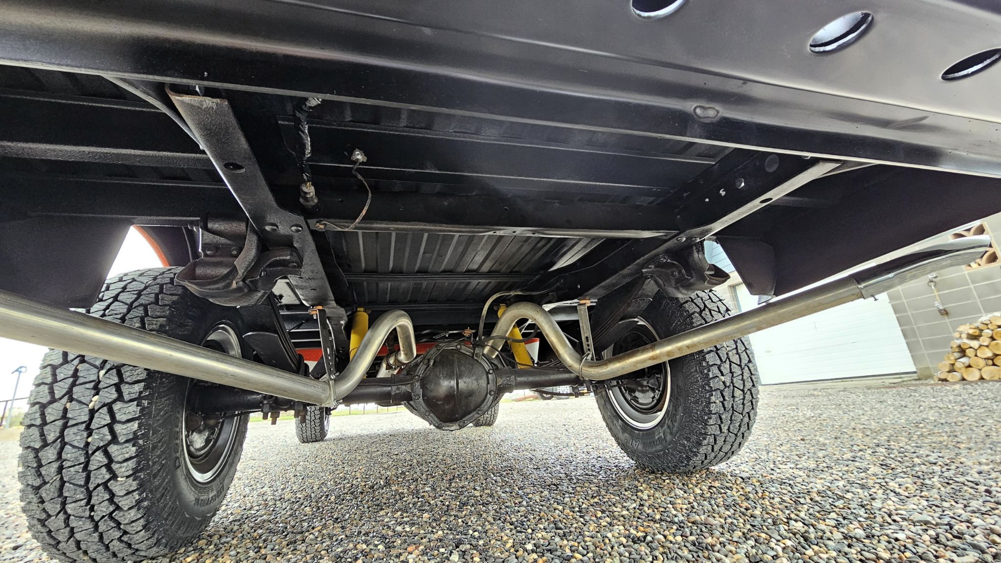 Chassis: The Frame was wire wheeled then painted with POR15 paint. It has new shocks but the bushing were in good condition, so not replaced. The original springs are present and in good shape. The rear brakes were redone with Drums on the back and Disks on the front. The suspension has not been upgraded and the steering sector is original to the truck. The A-arms are original as well as the upper and lower ball joints. It has custom exhaust with no manifolds.