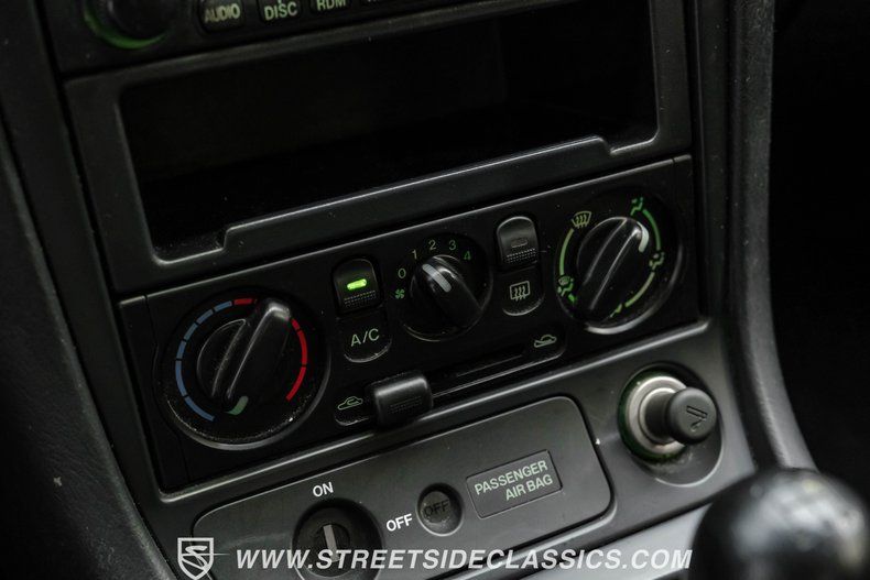 Inside, we find a stock, correct, and original black cloth interior. A three-spoke, power-assisted wheel sits just ahead of a five-pod gauge cluster featuring a 140 mph speedometer and 8,000 rpm tachometer. Power windows, power mirrors, and air conditioning provide creature comforts, while the original AM/FM/CD player sits just ahead of the perfectly placed shifter.