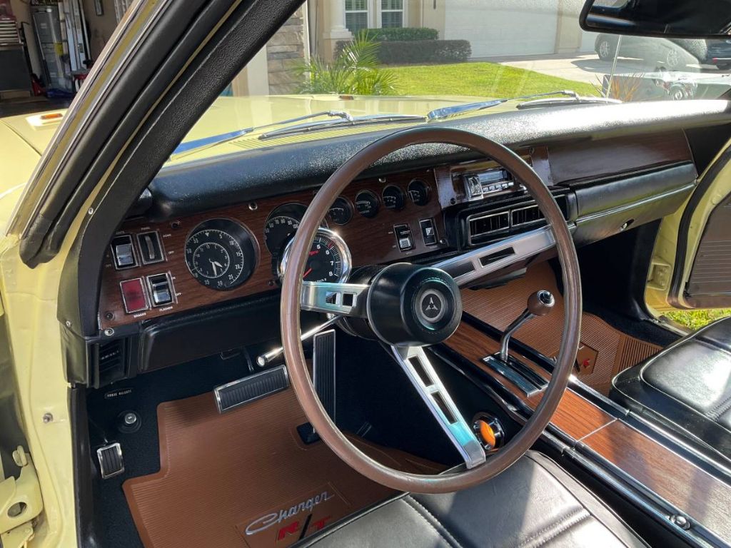 The Charger is equipped with a 727 Torqueflite transmission with a mild shift kit, 8 rear end with 3.73 Sure Grip gears, power steering, power front disc brakes, and factory air that has been converted to Vintage Air for modern comfort. Other highlights include hood-mounted turn indicators, wood grain dash and console, and brand-new, correct leather bucket seat upholstery. It rides on Magnum 500 wheels with spinners wrapped in 225/70R15 fronts and 275/60R15 rears.