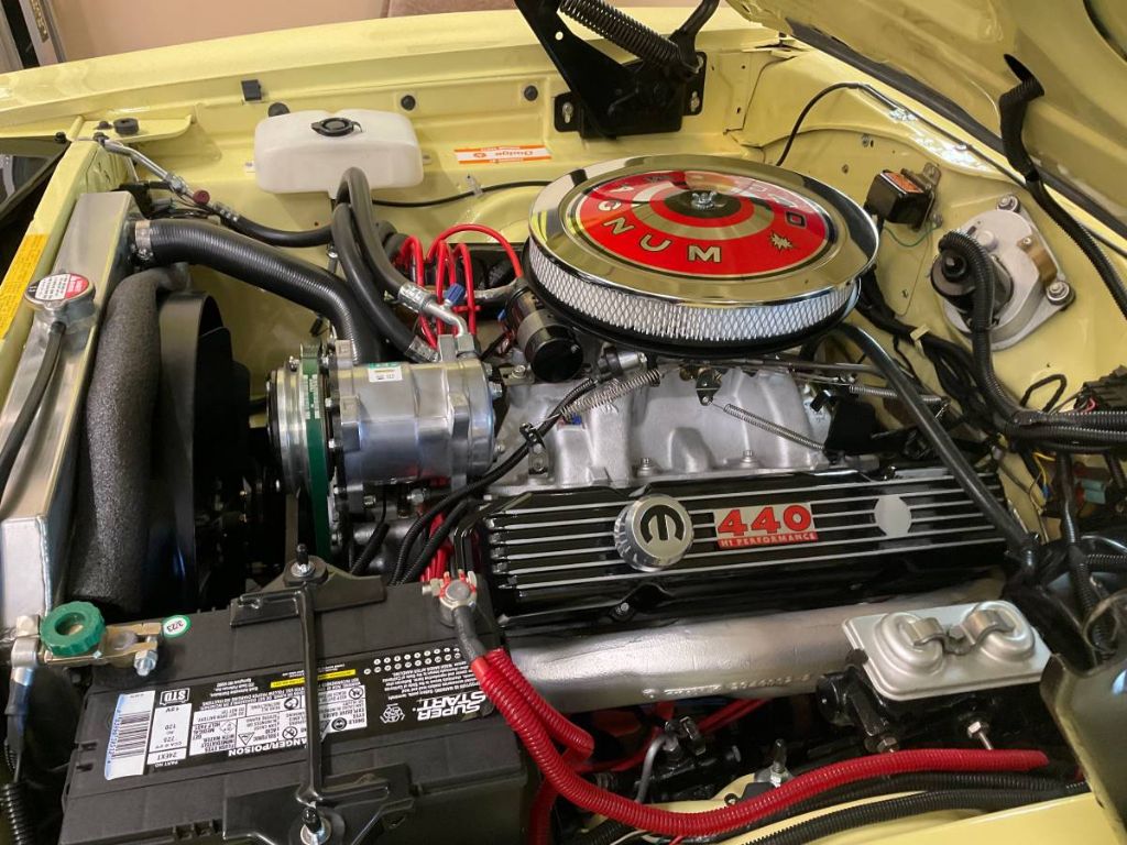 This gorgeous 1969 Dodge Charger R/T SE has undergone a comprehensive restoration and presents beautifully in its original Y2 Sunfire Yellow finish. Under the hood, youll find a period-correct 440 Magnum engine paired with an Edelbrock 750 CFM carburetor, Edelbrock Performer intake, and Edelbrock heads. A mild cam and Jet-Hot ceramic-coated exhaust manifolds enhance both performance and reliability, while the highly detailed engine compartment showcases the quality of this build.