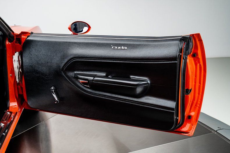 Finished in Hemi Orange and detailed with a HEMI hockey stripe, the car wears a mix of factory lines and subtle metalwork that make it both recognizable and distinct. The front valance was extended and reshaped, the rear valance molded in, and the rockers stretched to conceal the pinch welds. Marker lights were shaved, bumpers were tucked tight to the body, and Harley-Davidson Road King driving lamps were integrated into the front valance and feature LED turn signals. The look is cohesive and confident, showing how far refinement can go without losing character. Every inch was designed to modernize the E-body's aggression while preserving its silhouette.