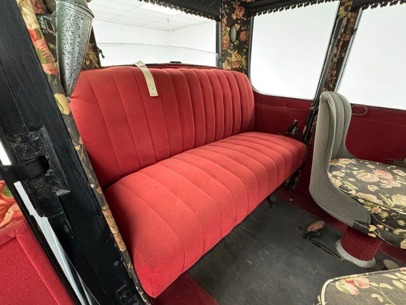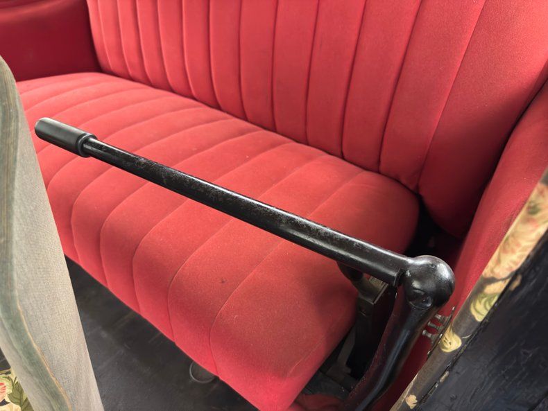 Victorian era influence is noted on the inside with hardware, red velvet-like doors and floral print dressing the walls and ceiling. That floral design is also used on the front bucket seats, while the red covers the rear bench and tillers are noted on the left side of both rows. Gray cloth, with some patina, covers the dashboard which houses a period clock while gauges are placed close to the floor in the center with a combination of rubber matting and red carpet covering the floor.