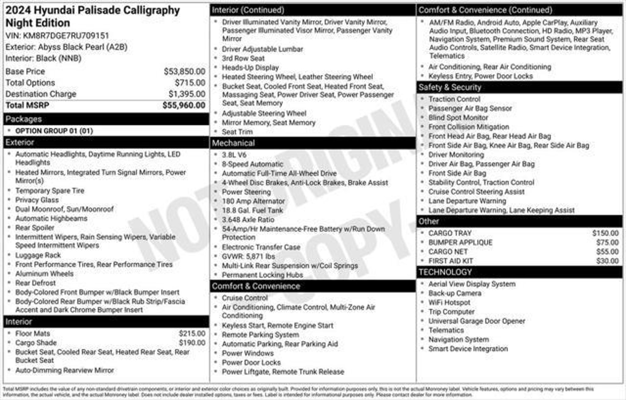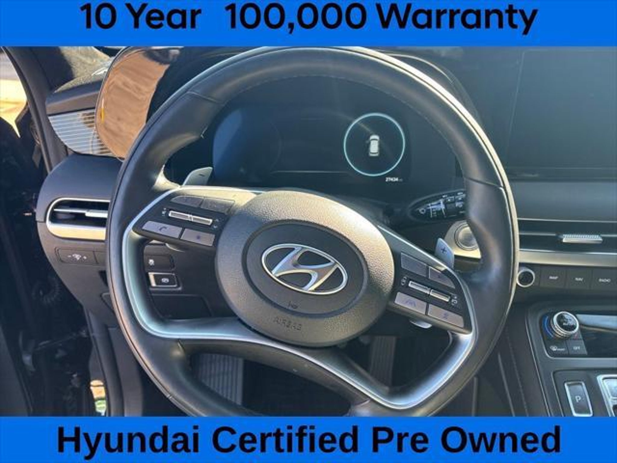 Recent Arrival! CARFAX One-Owner | Hyundai Certified | Calligraphy Night Edition AWD Experience next-level luxury and confidence in this Abyss Black Pearl 2024 Hyundai Palisade Calligraphy Night Edition AWD. Designed for those who demand elegance, performance, and versatility, this Palisade combines striking blacked-out styling with premium comfort features and cutting-edge technology. Inside, you'll find an upscale cabin with heated and ventilated front and rear seats, Nappa leather seating surfaces, a 12-speaker Harman Kardon® premium audio system, and a power moonroof. The advanced Heads-Up Display, navigation system, and 12.3"� touchscreen keep you connected and in control, while the 3rd-row seating ensures comfort for up to seven passengers. Performance meets precision with All-Wheel Drive, a smooth 8-speed automatic transmission, and a powerful V6 engine"”perfect for both daily commutes and weekend adventures. Hyundai Certified Used Vehicle (HCUV) CARFAX One-Owner Comprehensive 173 Point Inspection Balance of 5-Year/60,000-Mile New Vehicle Limited Warranty 10-Year/100,000-Mile Powertrain Warranty from Original In-Service Date Roadside Assistance Rental & Trip Interruption Coverage 3-Month SiriusXM Trial & 1-Year Connected Services Included Key Features: AWD Capability 3rd Row Split-Bench Seating Heated & Ventilated Front and Rear Seats Nappa Leather & Microfiber Suede Interior Power Moonroof & Power Liftgate Heads-Up Display Harman Kardon® 12-Speaker Premium Audio Apple CarPlay® & Android Auto Navigation System w/ 12.3"� Touchscreen Rain-Sensing Wipers & Auto High-Beam Headlights 20"� Black Alloy Wheels Advanced Safety Features including Rear Side-Impact Airbags Drive in style and confidence with this Certified 2024 Hyundai Palisade Calligraphy Night Edition AWD"”where sophistication meets strength. Fully inspected, Hyundai Certified, and ready for its next owner. Don't wait"”schedule your test drive today!